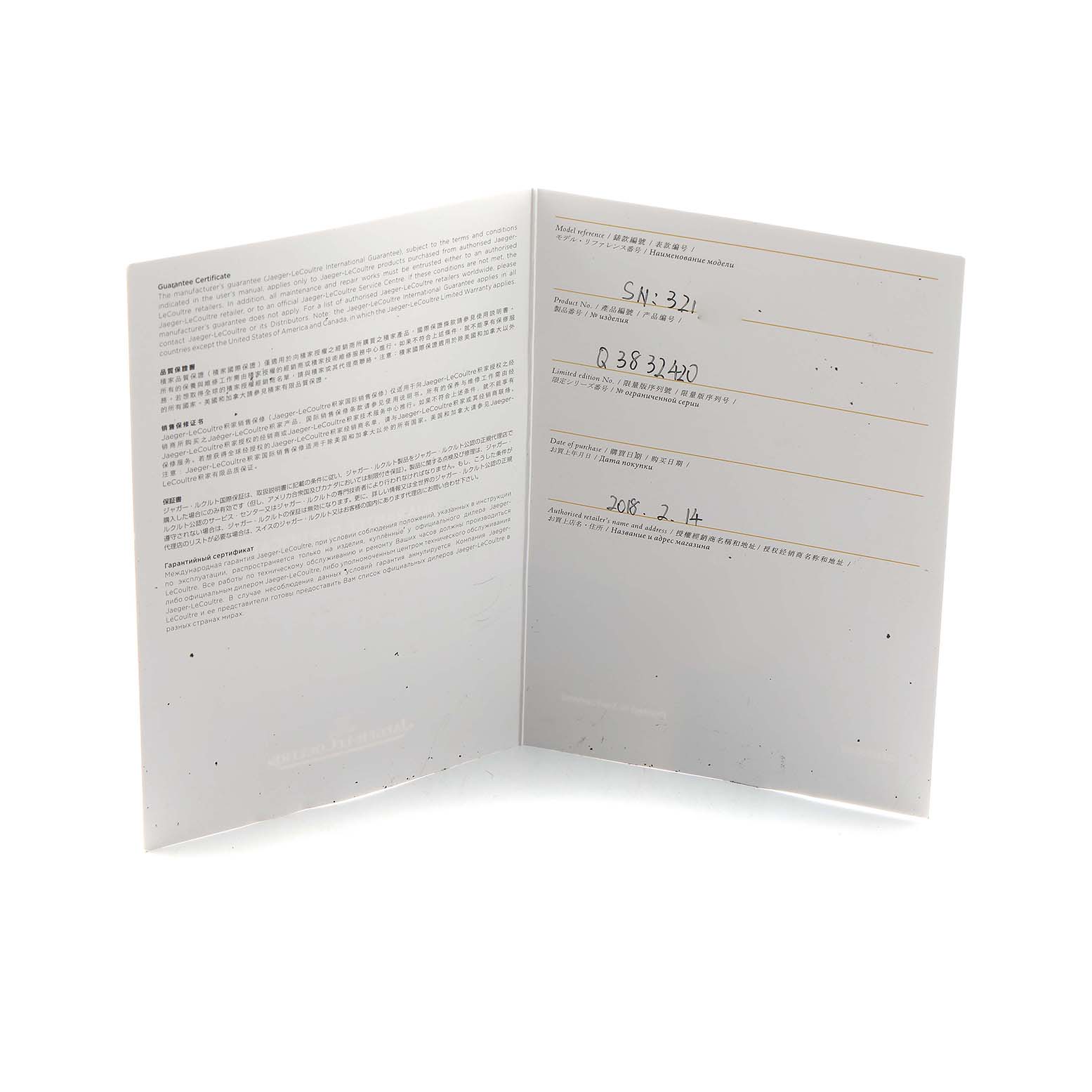| Box & Papers: | Jaeger LeCoultre paper and presentation non-Jaeger LeCoultre box. Exclusive SwissWatchExpo Certificate of Authenticity. |