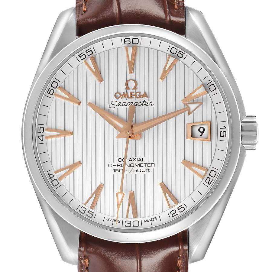 Omega Aqua Terra 150m Co-Axial Steel Mens Watch 231.13.42.21.02.002 Card. Automatic self-winding movement with Co-Axial escapement. Free sprung-balance with silicon balance spring, two barrels mounted in series, automatic winding in both directions. Bridges and the oscillating weight are decorated with exclusive Geneva waves in arabesque. Caliber 8500. Stainless steel round case 41.5 mm in diameter. Case thickness 13.2 mm. Transparent case back. Stainless steel bezel. Scratch resistant sapphire crystal. Silver teak pattern textured dial with raised luminous rose gold hands and index hour markers. Date window at the 3 o'clock position. Brown leather strap with stainless steel double push button deployent clasp.
