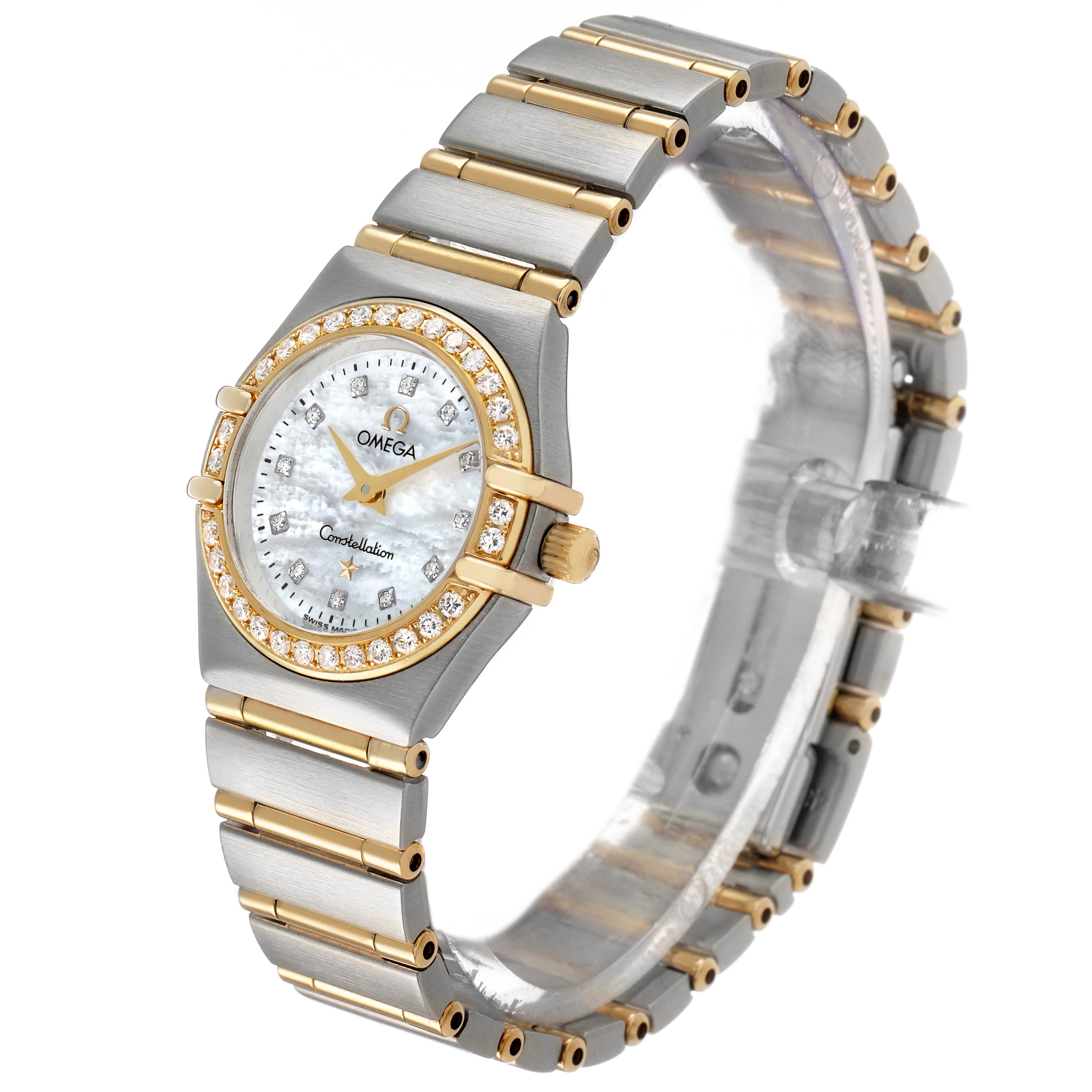 Omega Constellation Steel Yellow Gold Diamond Ladies Watch 1365.75.00 Box Card. Quartz movement. Stainless steel and 18k yellow gold round case 22.5 mm in diameter. 18k yellow gold bezel set with original Omega factory diamonds. Domed, scratch-resistant sapphire crystal with anti-reflective treatment inside. Mother of pearl dial with original Omega factory diamond hour markers. Stainless steel and 18k yellow gold bracelet with hidden deployant clasp. Fits a 6 1/4" wrist.