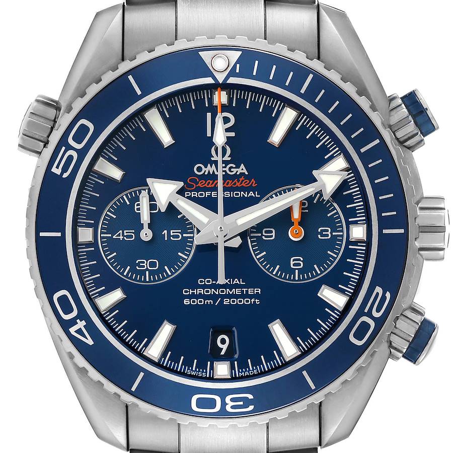 Omega Planet Ocean 600M Titanium Mens Watch 232.90.46.51.03.001 Box Card. Automatic self-winding chronometer movement with Co-Axial Escapement for greater precision, stability, and durability. Silicon balance spring on free sprung balance, 2 barrels mounted in series, automatic winding in both directions to reduce winding time. Rhodium plated finish with exclusive Geneva waves in arabesque. 60-hour power reserve. Titanium round case 45.5 mm in diameter. Helium escape valve at the 10 o'clock position. Transparent exhibition sapphire crystal caseback. Two pushers operate the chronograph functions. Omega logo on the crown. Blue ceramic unidirectional rotating time-lapse divers' bezel with a Liquidmetal diving scale. Domed, scratch resistant sapphire crystal with anti-reflective treatment on both sides. Blue dial with luminescent broad arrow hands and index hour markers. Two recessed subdials -- running small seconds and a 12-hour chronograph register. Orange-tipped central chronograph seconds hand. Date calendar at the 6 o'clock aperture. Outer minute track. Titanium bracelet with a double push-button deployant clasp and divers' extension. Fits an 8" wrist.