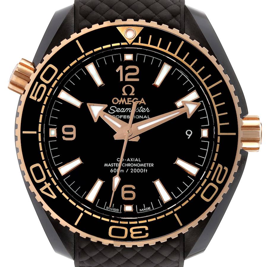 Omega Planet Ocean Rose Gold Ceramic Mens Watch 215.62.40.20.13.001 Box Card. Automatic self-winding movement with Co-Axial escapement. Certified Master Chronometer, approved by METAS,resistant to magnetic fields reaching 15,000 gauss. GMT and time zone functions. Free sprung-balance with silicon balance spring, two barrels mounted in series, automatic winding in both directions. Special luxury finish with rhodium-plated rotor and bridges with Geneva waves in arabesque. Black ceramic case 39.5 mm in diameter. 18K rose gold crown and Helium Escapement Valve at the 10 o'clock position. 18K Sedna rose gold bezel with a ceramic bezel ring with a Ceragold diving scale. Domed scratch resistant sapphire crystal with anti-reflective coating. Brown zirconium oxide ceramic dial with luminescent index hour markers and broad arrow hands. Applied Sedna gold 6, 9 & 12 hour markers. Date calendar window at 3 o'clock aperture. Brown rubber strap with deployant buckle.