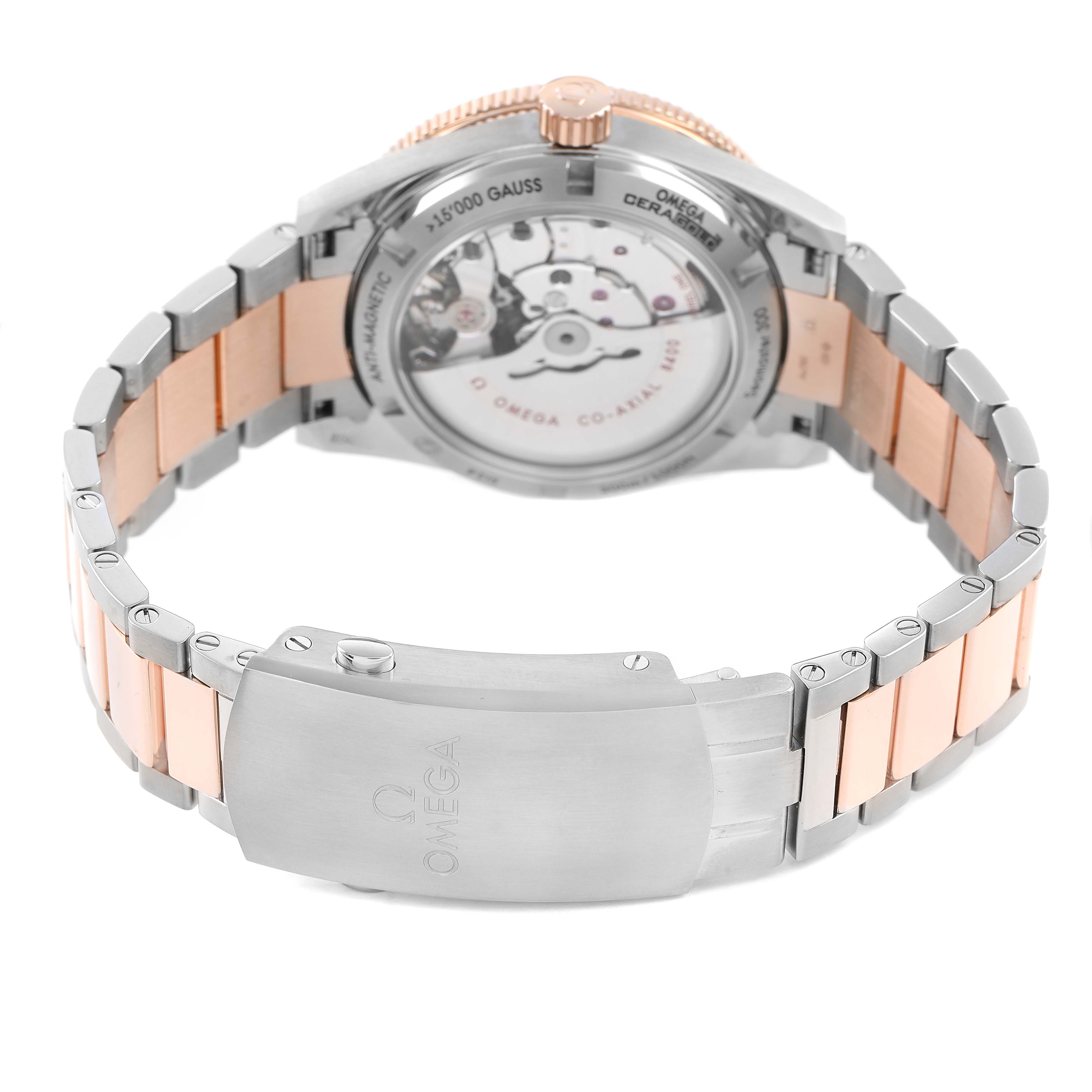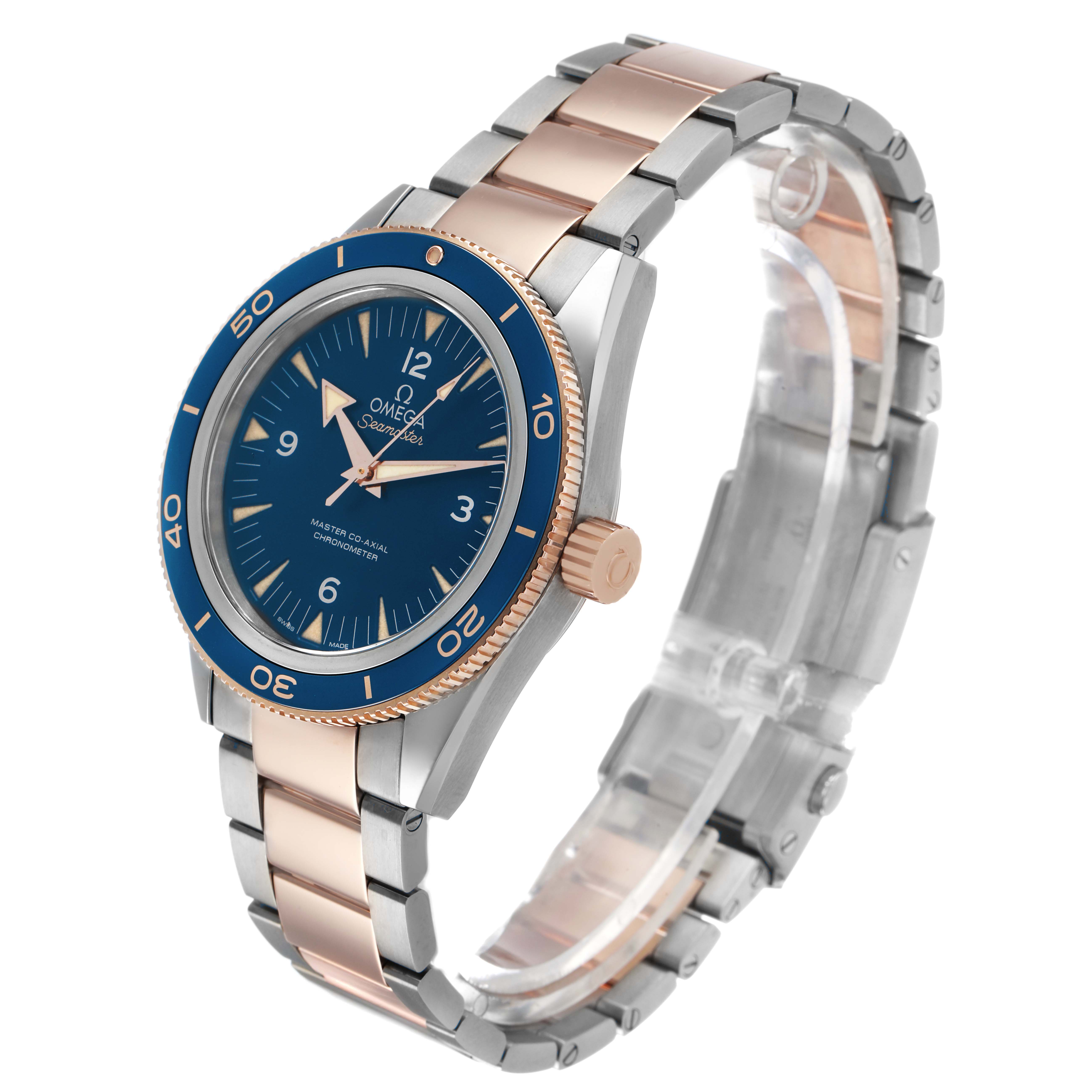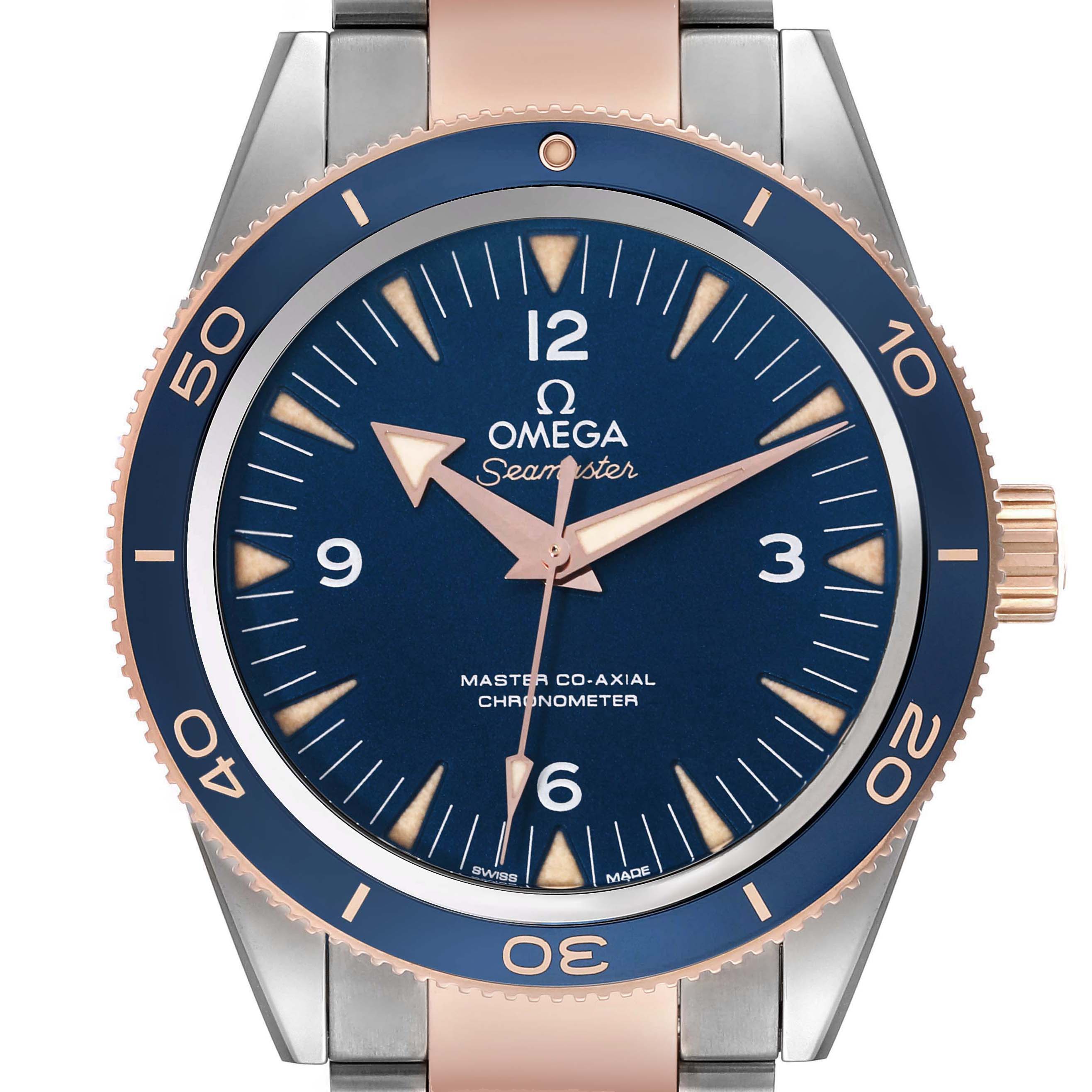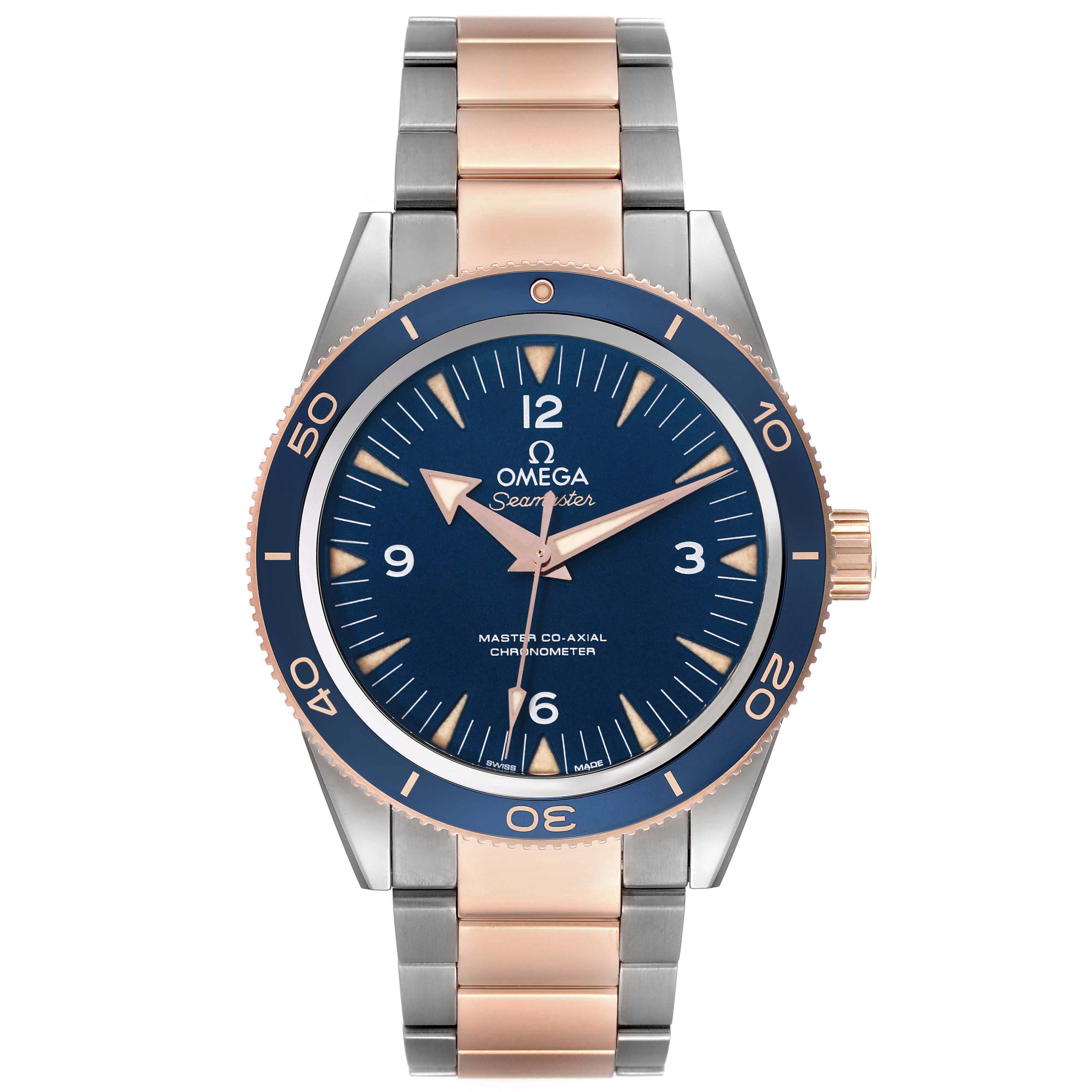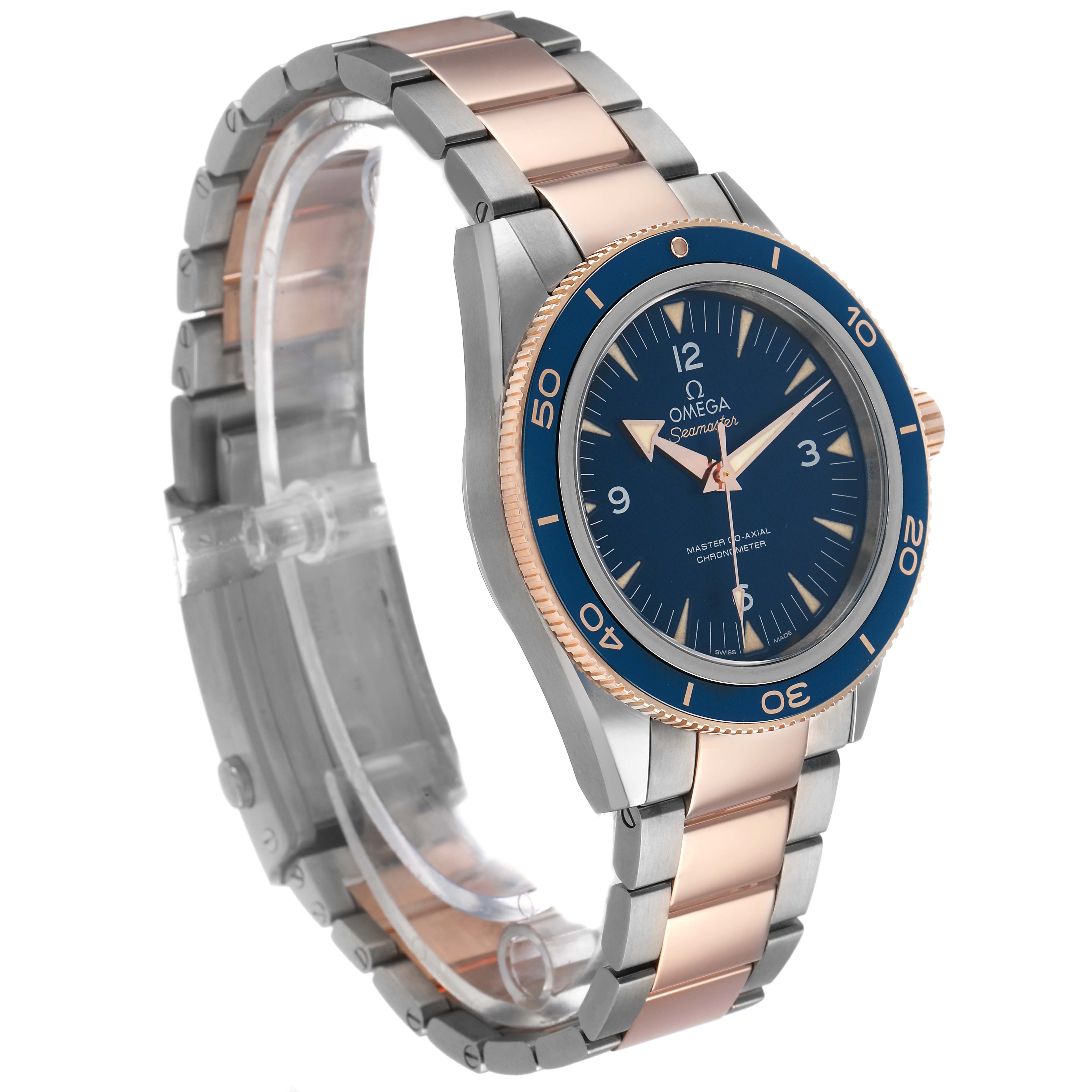 Omega Seamaster 300 Titanium Rose Gold Mens Watch 233.60.41.21.03.001 Box Cards. Automatic self-winding movement with Co-Axial escapement. Resistant to magnetic fields greater than 15,000 gauss. Free sprung-balance with silicon balance spring, two barrels mounted in series, automatic winding in both directions to reduce winding time. Bridges and the oscillating weight are decorated with exclusive Geneva waves in arabesque. 60 hours power reserve. Caliber 8400. Titanium case 41.0 mm in diameter. Transparent exhibition sapphire crystal case back. 18k rose gold crown signed with the Omega logo. 18k rose gold unidirectional rotating time-lapse bezel with blue ceramic insert. Domed scratch-resistant sapphire crystal with anti-reflective treatment inside. Sand-blasted blue dial with luminescent rose gold arrow hour markers and hands. Luminescent Arabic numerals at 3, 6, 9, and 12 o'clock. Titanium and 18k rose gold bracelet with push-button folding clasp and ratcheting micro-adjustment. Fits a 9" wrist.