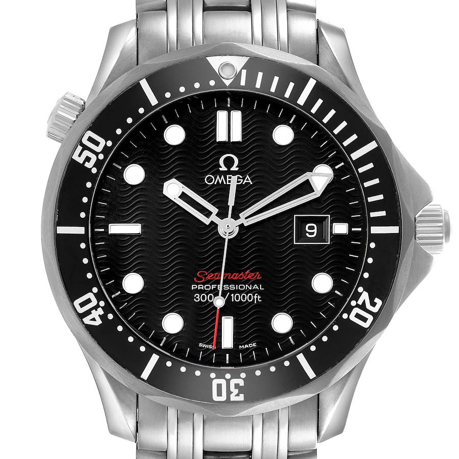Omega Seamaster 300M Black Dial Steel Mens Watch 212.30.41.61.01.001. Quartz movement. Stainless steel round case 41.0 mm in diameter. Helium escape valve at 10 o'clock. Omega logo on the crown. Black unidirectional rotating time-lapse bezel. Scratch resistant sapphire crystal. Black wave decor dial with luminescent doy hour markers and skeleton hands. Date calendar at the 3 o'clock aperture. Stainless steel bracelet with a push-button folding clasp. Will fit up to an 7 3/4" wrist.