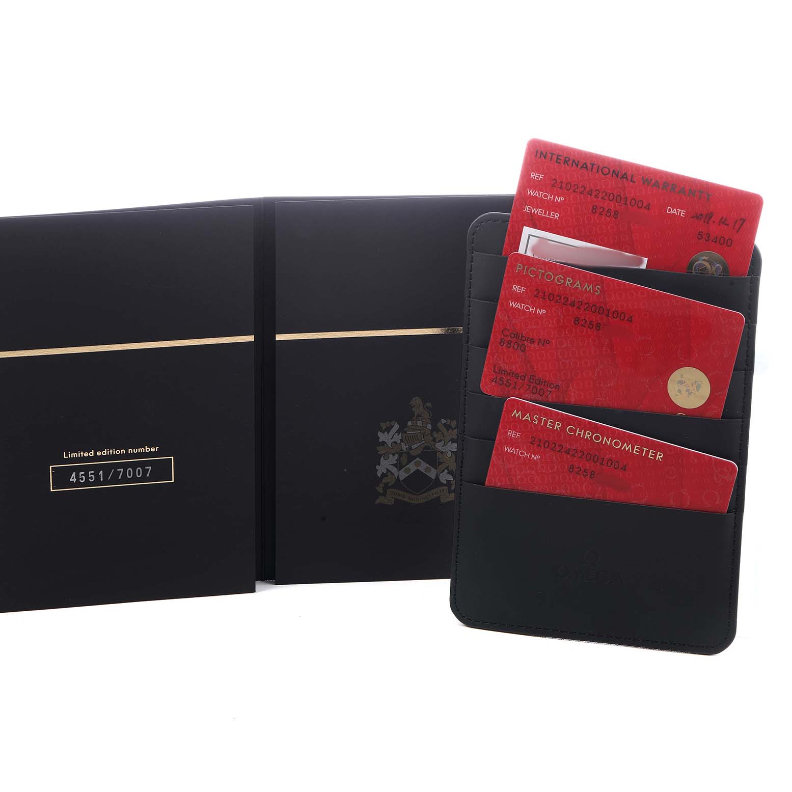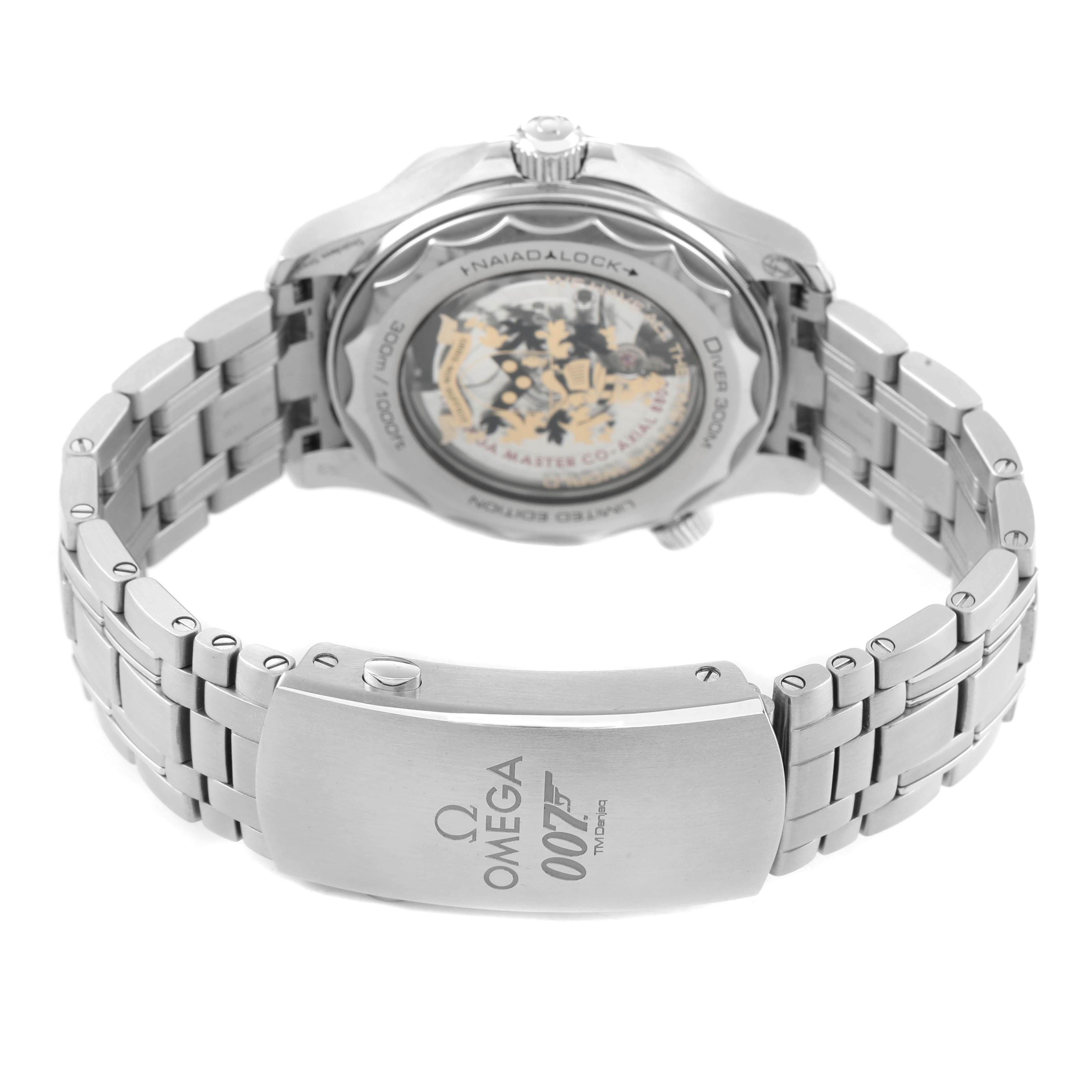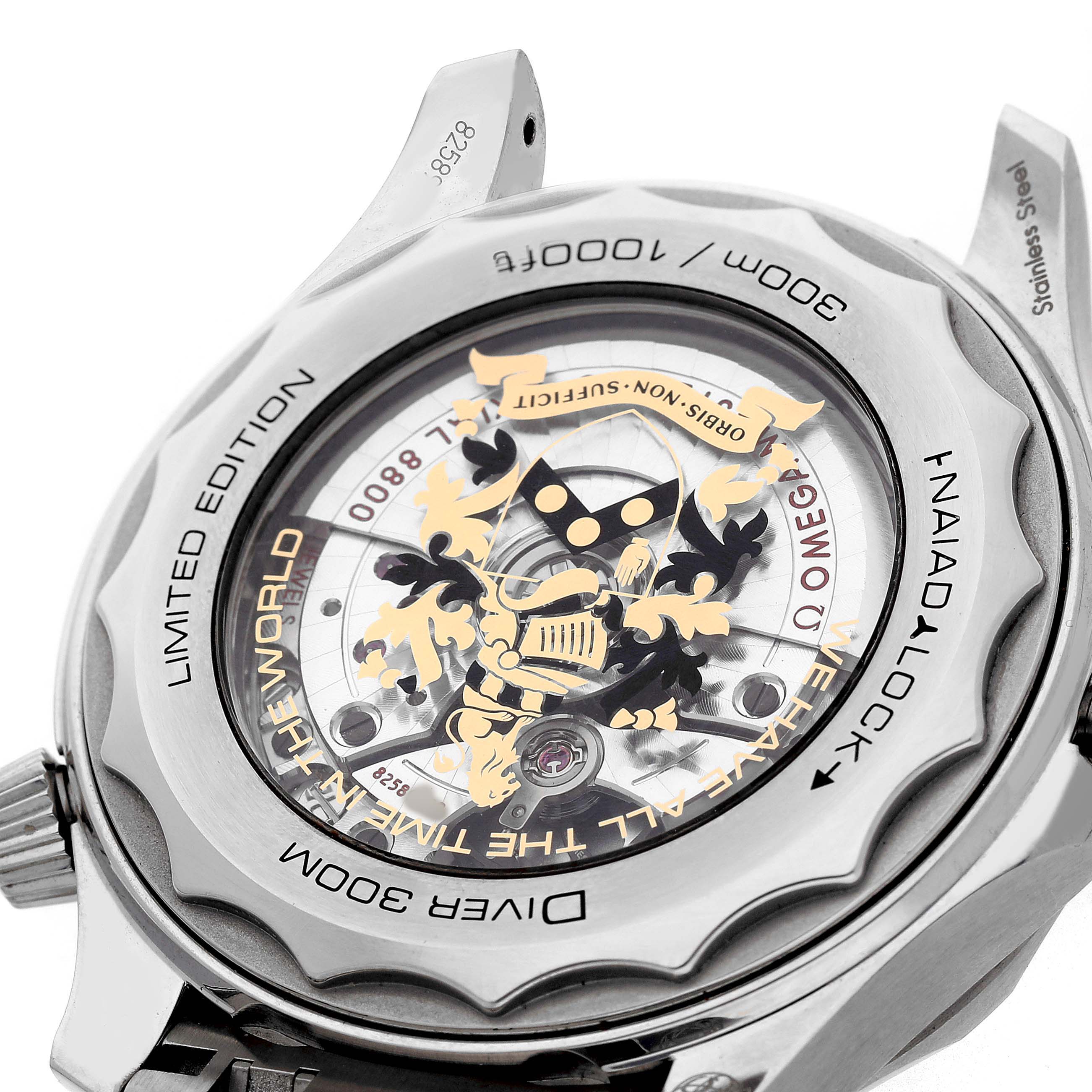 | Case: | Stainless steel round case 42.0 mm in diameter. Omega logo on the crown. Conical design helium escape valve at 10 o'clock. Transparent exhibition sapphire crystal case back. The Bond family coat-of-arms metallised in gold and black is on the inner side of the sapphire crystal caseback. 18k yellow gold plate with an engraved limited edition number on the left case edge. |