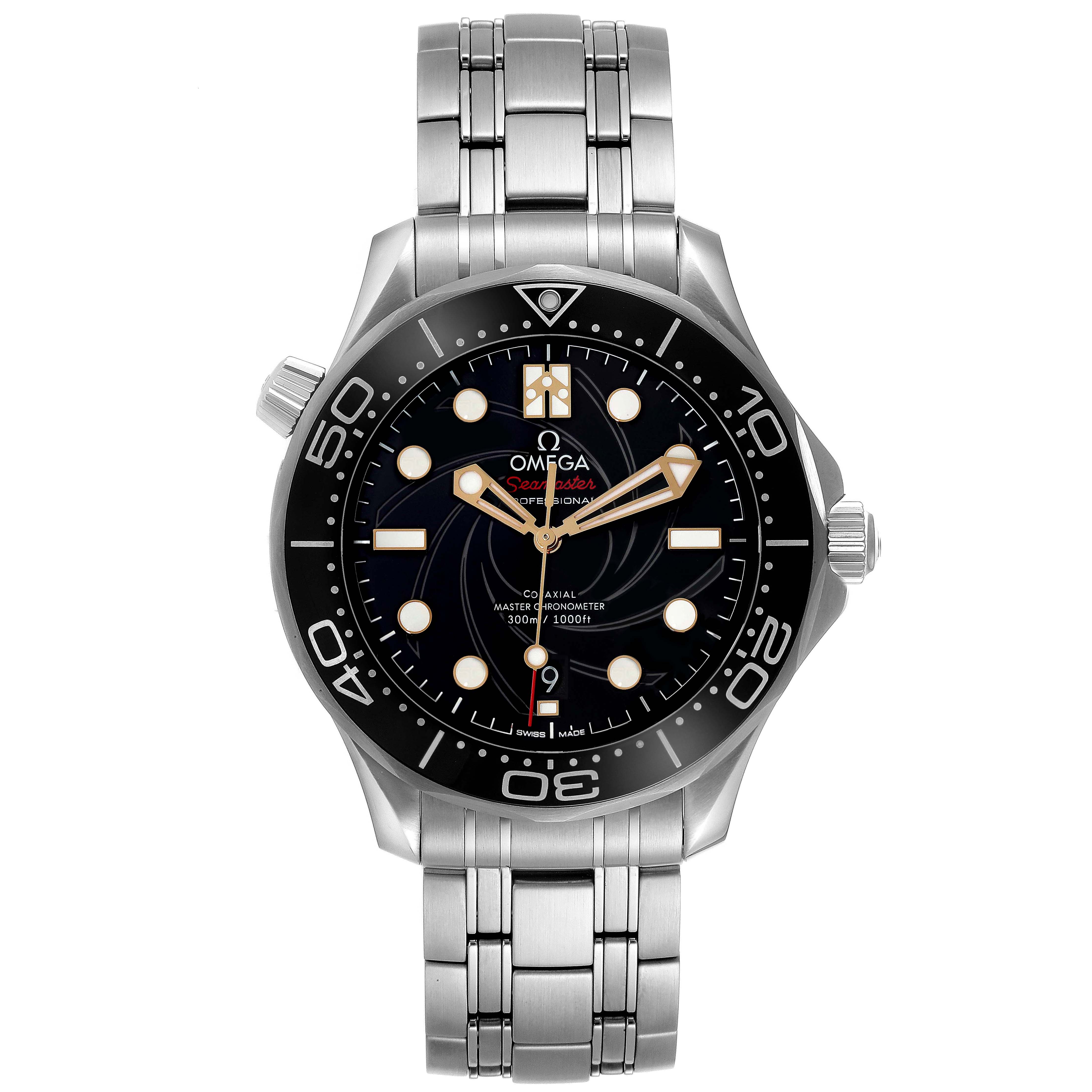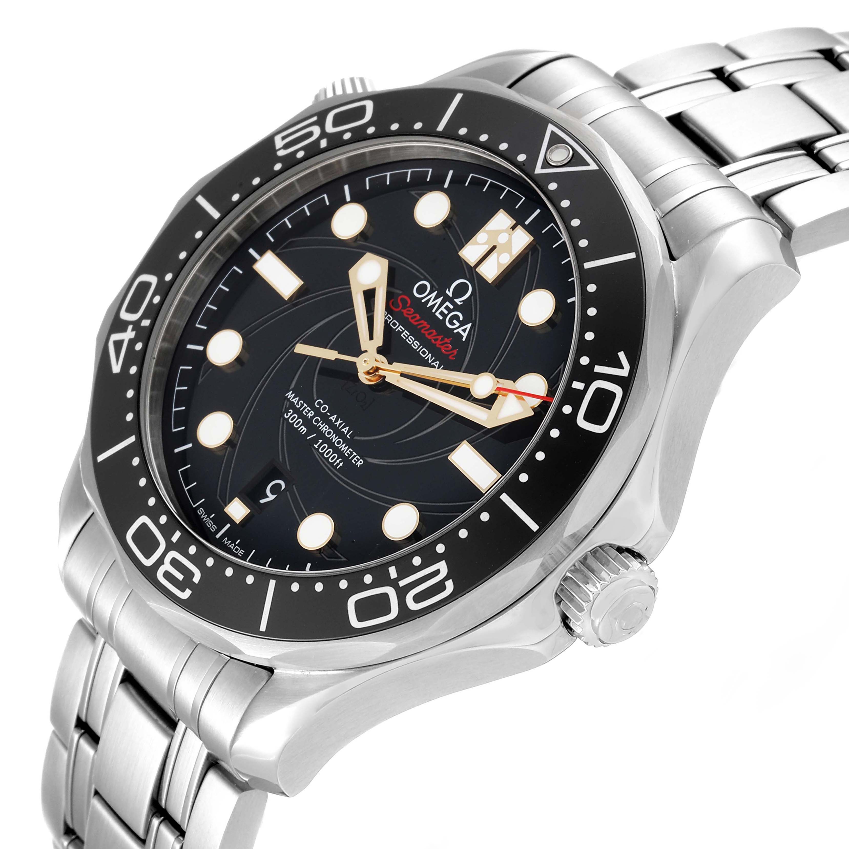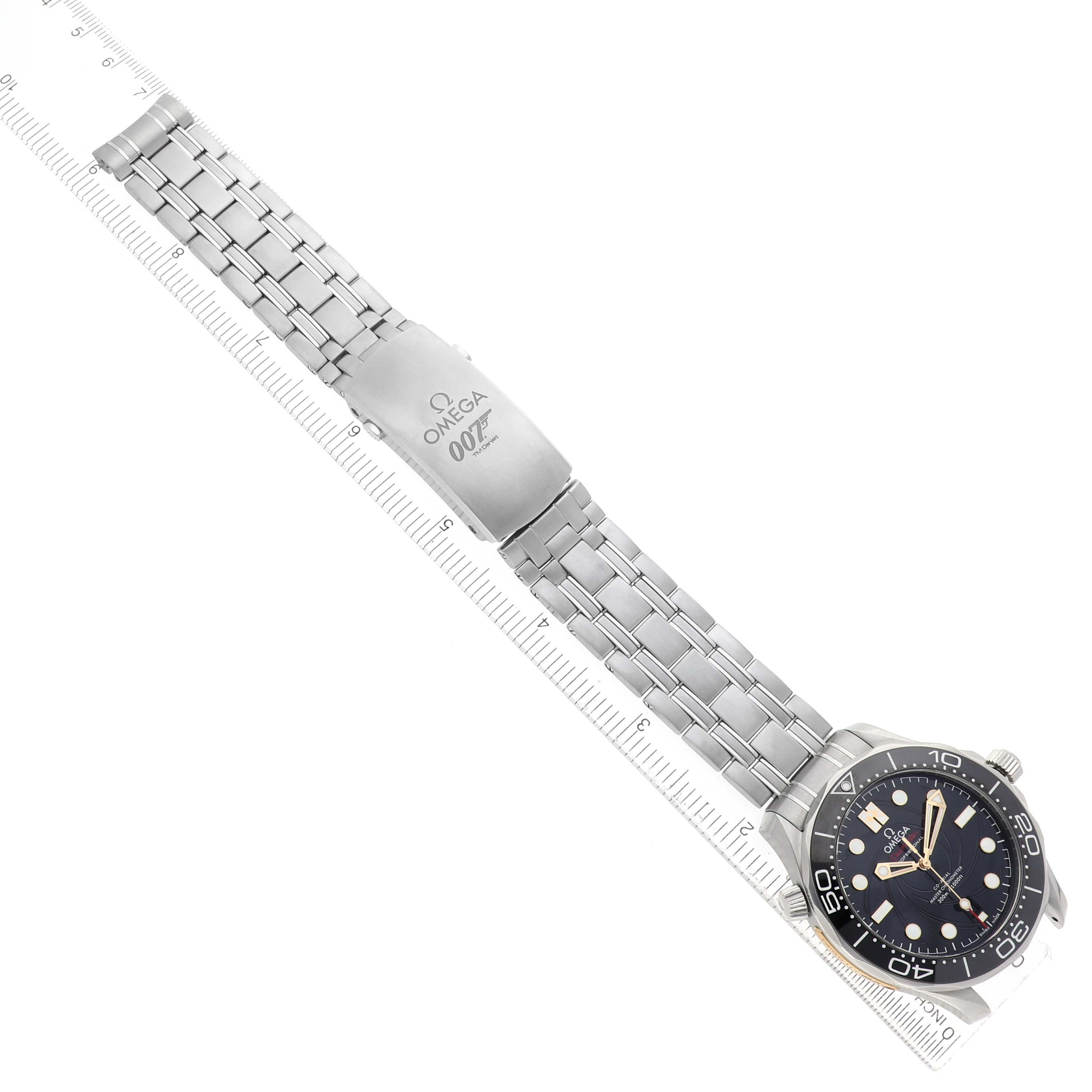 Omega Seamaster 300M James Bond 007 LE Mens Watch 210.22.42.20.01.004 Box Card. Automatic Self-winding movement with Co-Axial escapement.Certified Master Chronometer, approved by METAS, resistant to magnetic fields reaching 15,000 gauss. Free sprung-balance with silicon balance spring, automatic winding in both directions. Stainless steel round case 42.0 mm in diameter. Omega logo on the crown. Conical design helium escape valve at 10 o'clock. Transparent exhibition sapphire crystal case back. The Bond family coat-of-arms metallised in gold and black is on the inner side of the sapphire crystal caseback. 18k yellow gold plate with an engraved limited edition number on the left case edge. Black ceramic unidirectional rotating time-lapse bezel with a white enamel diving scale. Scratch resistant sapphire crystal. Black spiral-brushed ceramic dial laser-engraved with the iconic James Bond gun barrel design. 18K yellow gold luminescent skeleton hands with dot and baton hour markers. Red-tipped lollipop centre seconds hand. Yellow gold Bond family coat-of-arms at 12 o’clock. Date calendar at the 6 o'clock aperture. The number 7 on the date disc is in the 007 font. A secret number 50 is hidden in the luminescent material of the 10 o’clock hour-marker – a reference to the 50th anniversary of the James Bond film "On Her Majesty's Secret Service”. Stainless steel bracelet with a push-button deployant clasp. Fits an 8 3/4" wrist.
