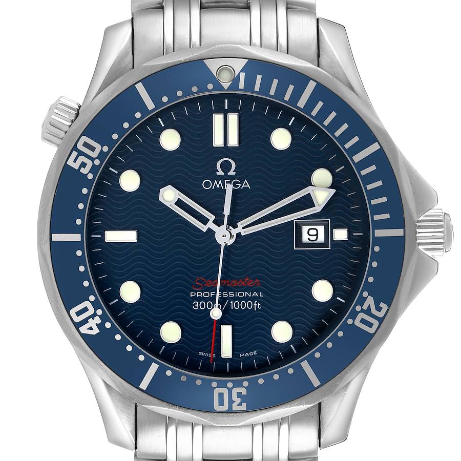 Omega Seamaster 300M Steel Blue Dial Mens Watch 2221.80.00. Quartz movement. Stainless steel round case 41.0 mm in diameter. Helium escape valve at the 10 o'clock position. Omega logo on the crown. Pointed crown guards. Blue unidirectional rotating time-lapse bezel with the diving scale. Domed anti-reflective, scratch resistant sapphire crystal. Blue wave decor dial with luminescent skeletonized hands and dot hour markers. Outer stick minute markers. Date calendar at the 3 o'clock aperture. Luminescent lollipop-tipped seconds hand. Stainless steel bracelet with a double push-button folding clasp and divers' extension. Fits an 8" wrist.