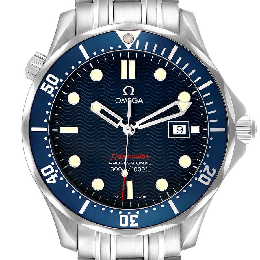 Omega Seamaster 300M Steel Blue Dial Mens Watch 2221.80.00. Quartz movement. Stainless steel round case 41.0 mm in diameter. Helium escape valve at the 10 o'clock position. Omega logo on the crown. Pointed crown guards. Blue unidirectional rotating time-lapse bezel with the diving scale. Domed anti-reflective, scratch resistant sapphire crystal. Blue wave decor dial with luminescent skeletonized hands and dot hour markers. Outer stick minute markers. Date calendar at the 3 o'clock aperture. Luminescent lollipop-tipped seconds hand. Stainless steel bracelet with a double push-button folding clasp and divers' extension. Fits a 7 3/4" wrist.