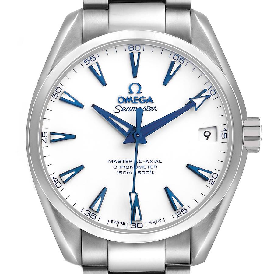 Omega Seamaster Aqua Terra GoodPlanet Titanium Mens Watch 231.90.39.21.04.001. Automatic self-winding co-axial movement. Caliber 8500. Titanium round case 38.5 mm in diameter. Transparent exhibition sapphire crystal case back. Omega logo on the crown. Titanium smooth bezel. Scratch resistant sapphire crystal. White lacquered dial with blue luminescent dagger hour markers and arrow hands. Date calendar at the 3 o'clock aperture. Titanium bracelet with double push-button hidden deployant clasp. Fits an 8" wrist.