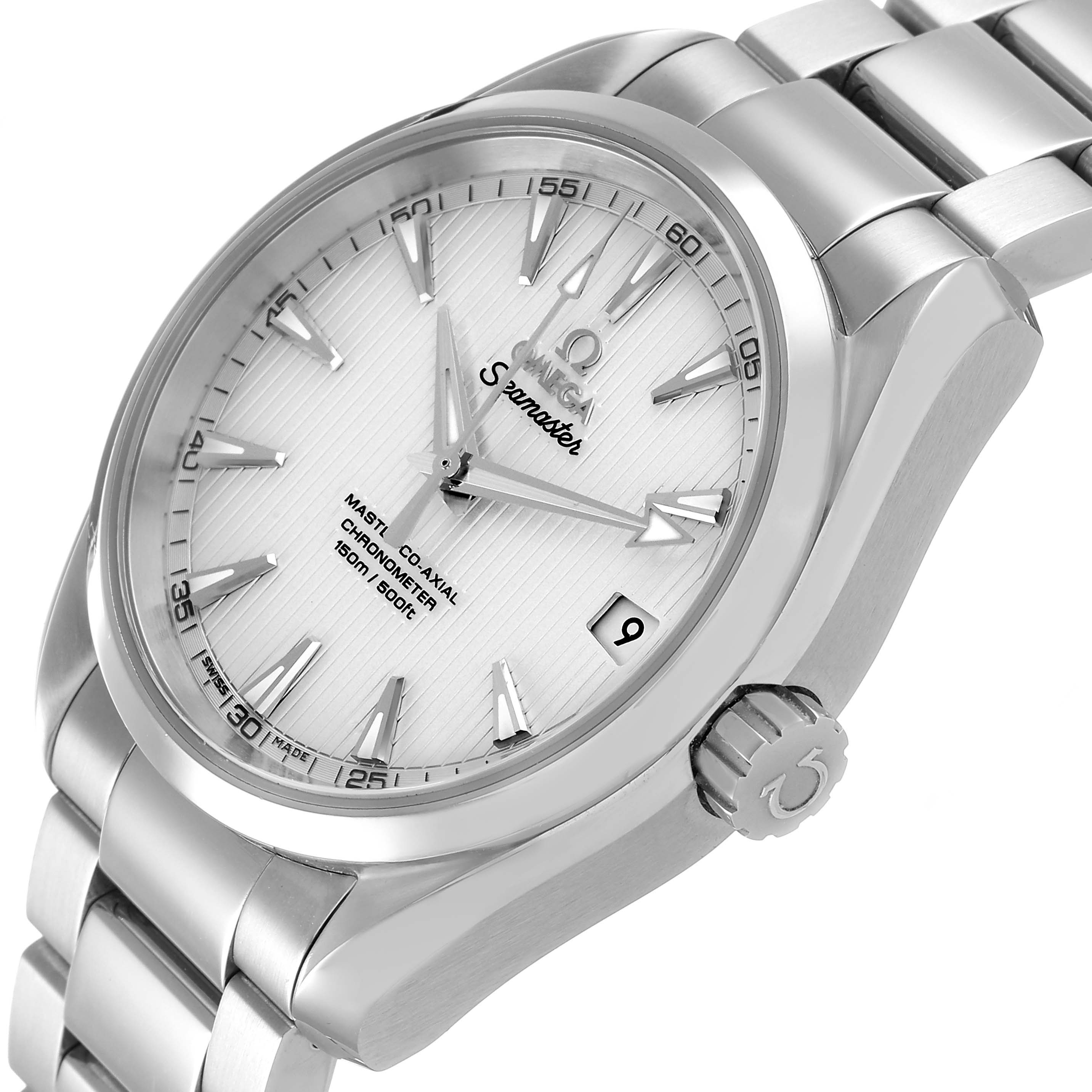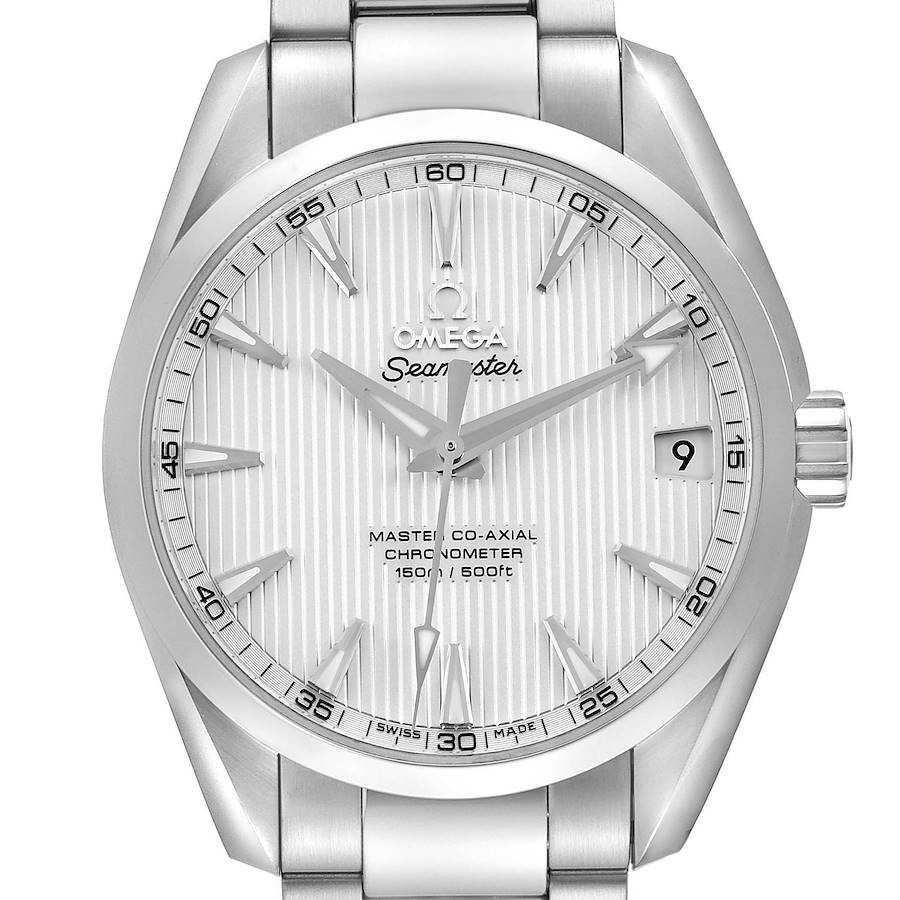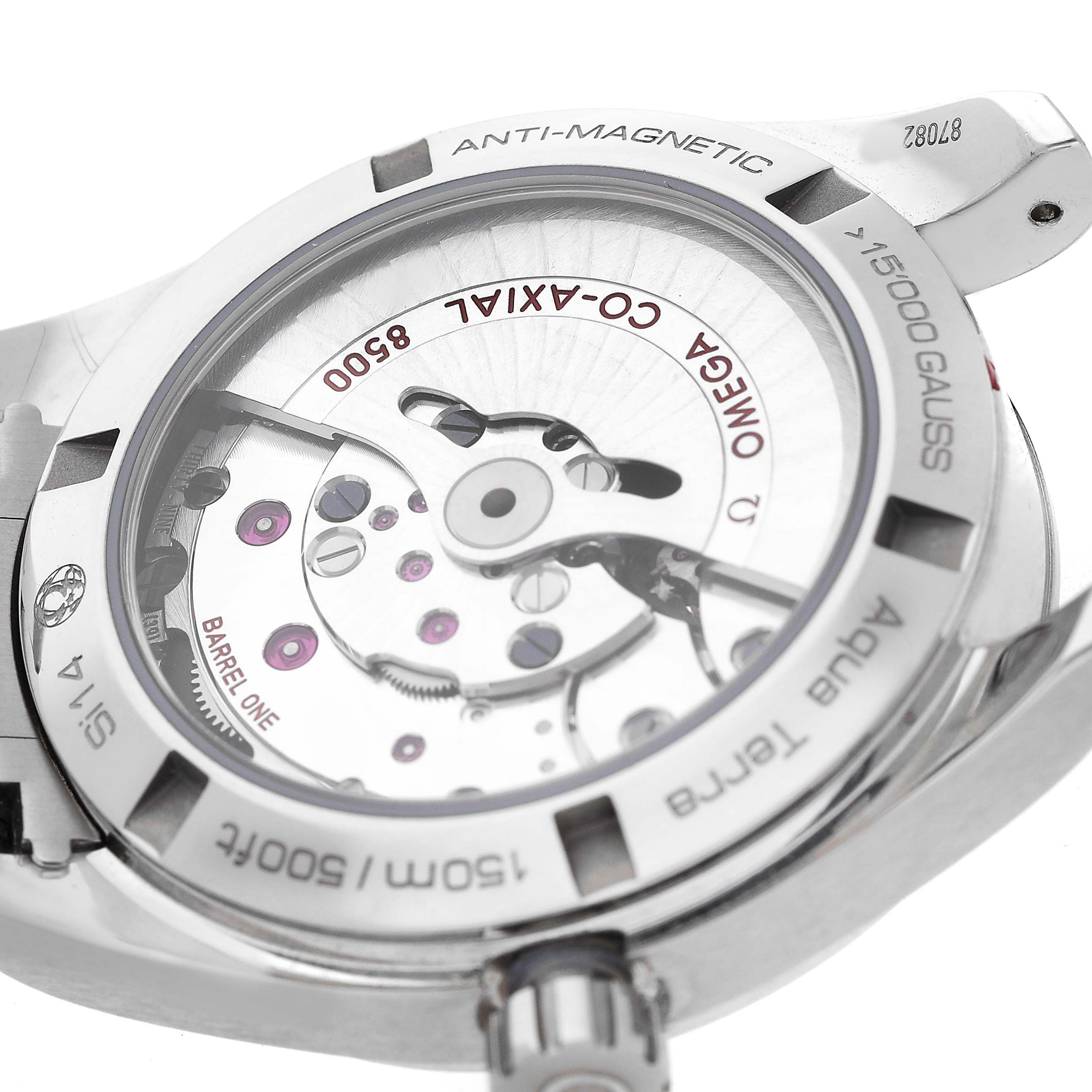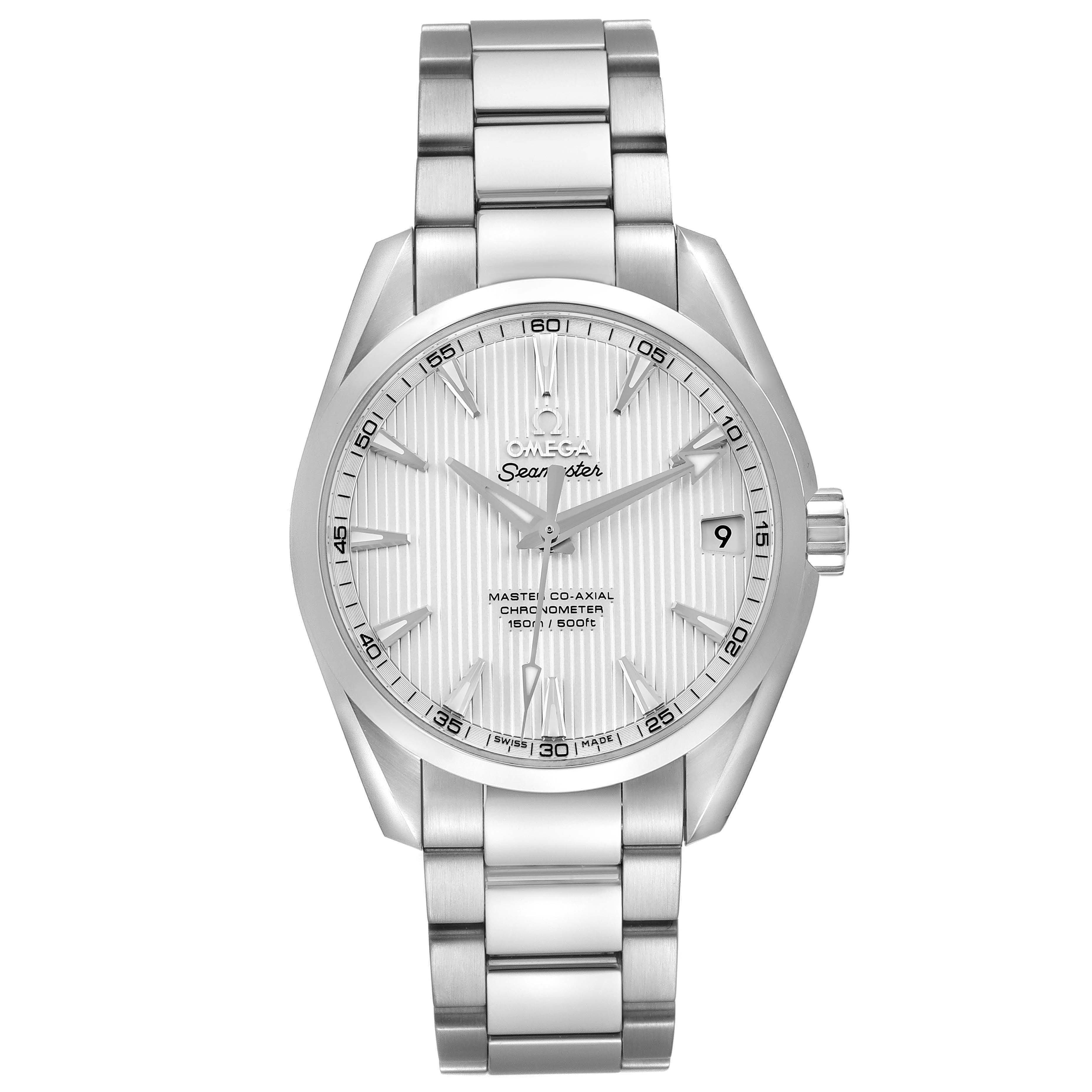 Omega Seamaster Aqua Terra Steel Mens Watch 231.10.39.21.02.002 Box Card. Automatic self-winding movement. Caliber 8500. Stainless steel round case 38.5 mm in diameter. Transparent exhibition sapphire crystal caseback. Omega logo on the crown. Stainless steel smooth bezel. Scratch resistant sapphire crystal. Silver opaline teak-pattern dial with luminescent hands and dagger hour markers. Date calendar at the 3 o'clock aperture. Stainless steel bracelet with a double push-button butterfly clasp. Fits an 8 1/4" wrist.