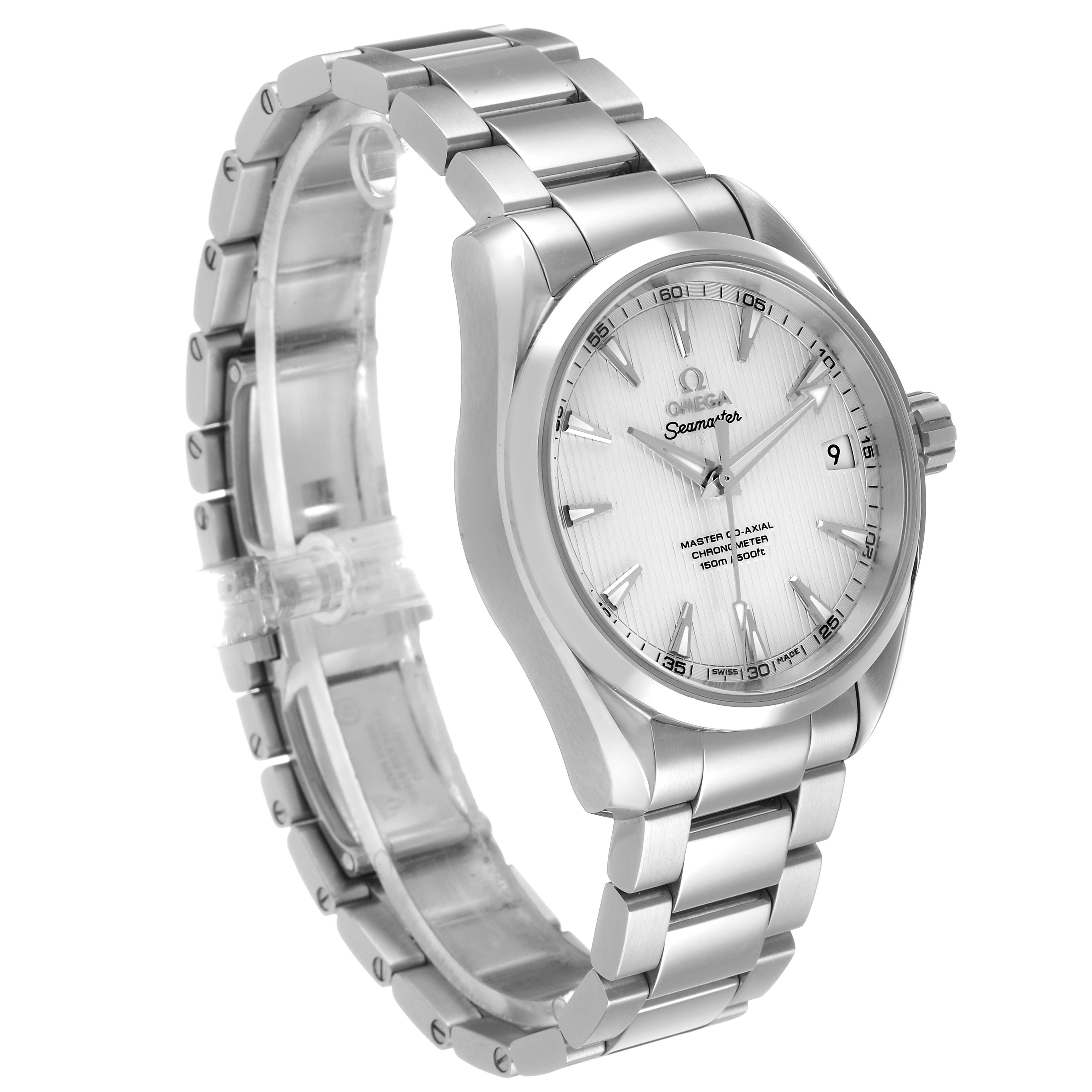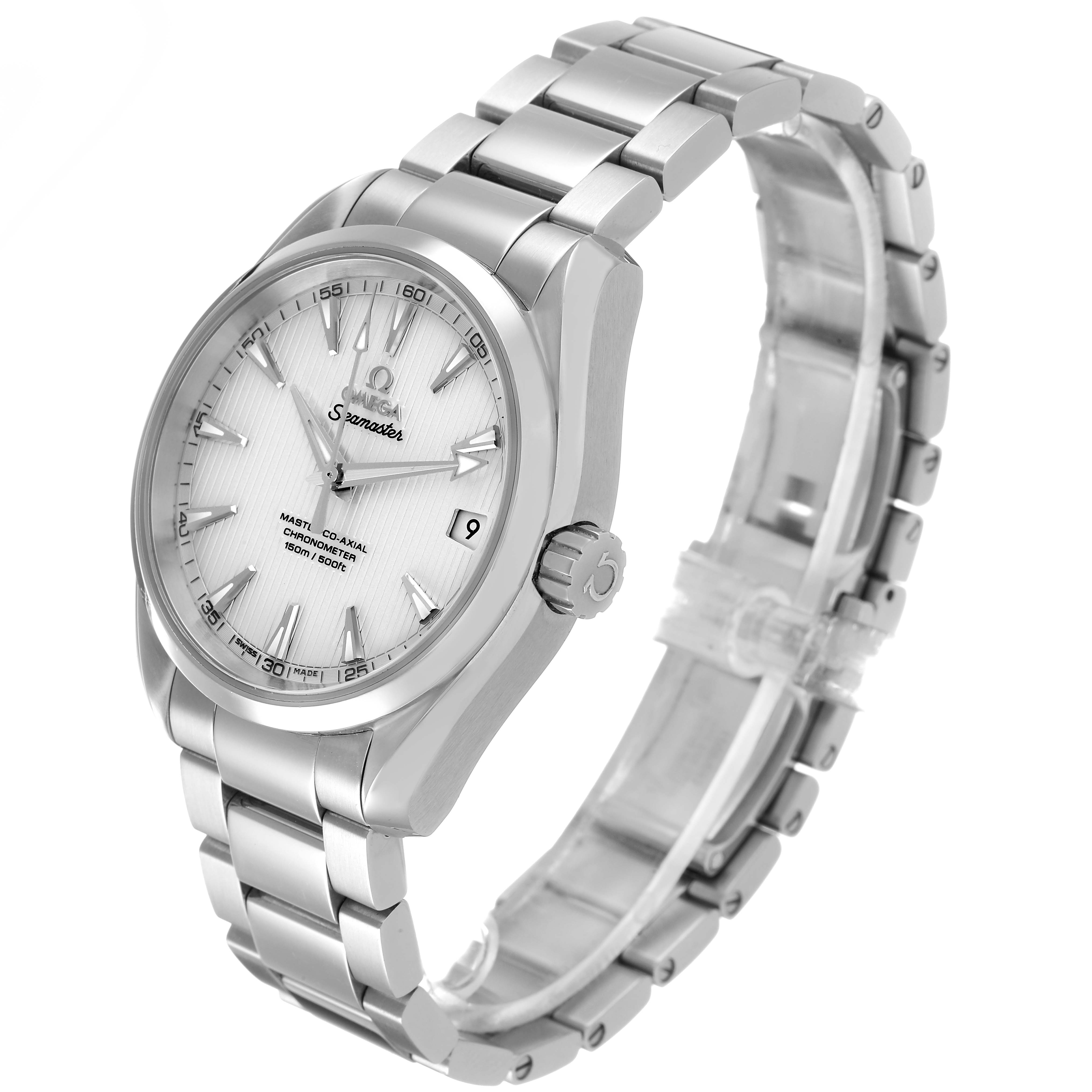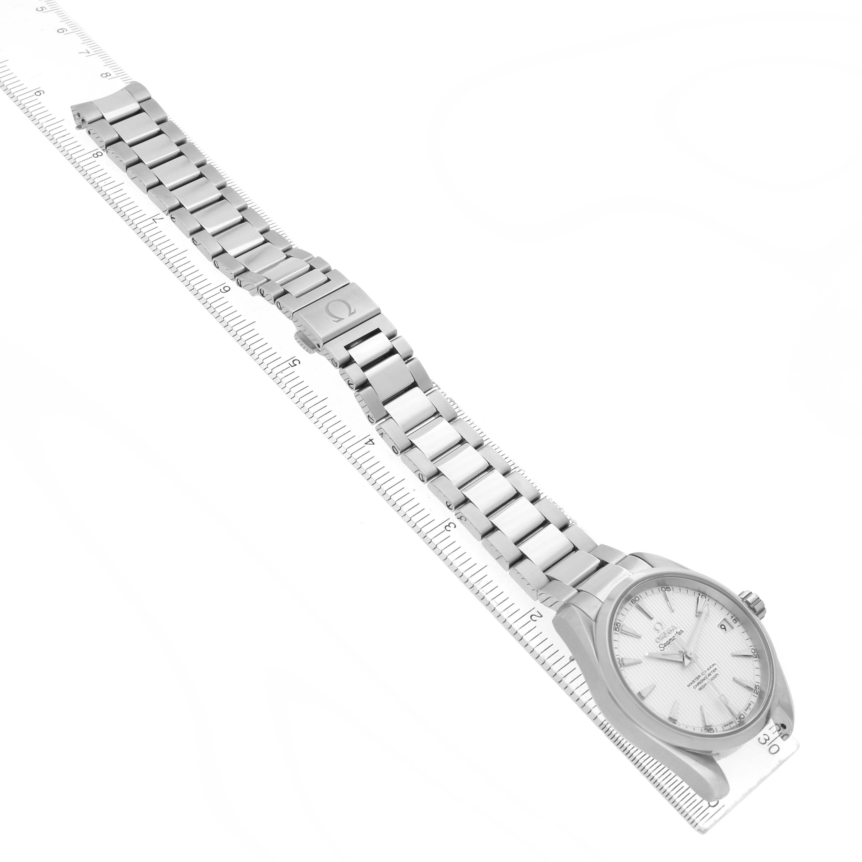 Omega Seamaster Aqua Terra Steel Mens Watch 231.10.39.21.02.002 Box Card. Automatic self-winding movement. Caliber 8500. Stainless steel round case 38.5 mm in diameter. Transparent exhibition sapphire crystal caseback. Omega logo on the crown. Stainless steel smooth bezel. Scratch resistant sapphire crystal. Silver opaline teak-pattern dial with luminescent hands and dagger hour markers. Date calendar at the 3 o'clock aperture. Stainless steel bracelet with a double push-button butterfly clasp. Fits an 8 1/4" wrist.