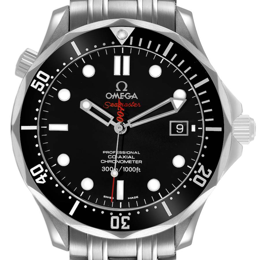 Omega Seamaster Bond 007 LE Steel Mens Watch 212.30.41.20.01.001 Card. Automatic self-winding movement. Stainless steel round case 41.0 mm in diameter. Omega logo on the crown. Pointed crown guards. Helium escape valve at 10 o'clock. Black unidirectional rotating time-lapse bezel with 60-minute graduation. Scratch resistant sapphire crystal. Black dial with luminescent skeletonized sword-shaped hands and dot hour markers. Luminescent lollipop-tipped centre seconds hand. Red 007 logo on the seconds hand. Date calendar at the 3 o'clock aperture. Outer stick minute markers. Stainless steel James Bond bracelet with a double push-button folding clasp. Fits an 7 3/4" wrist.