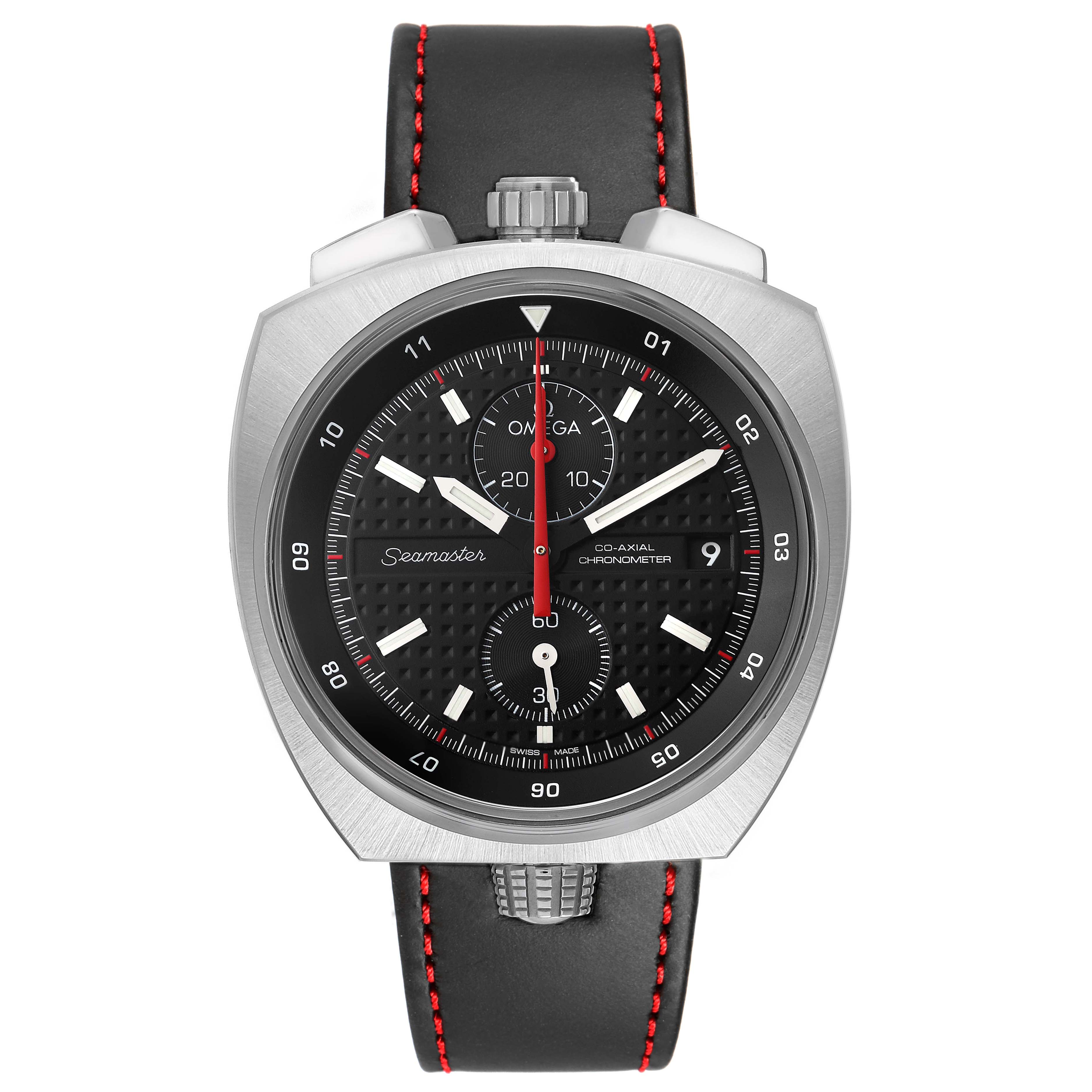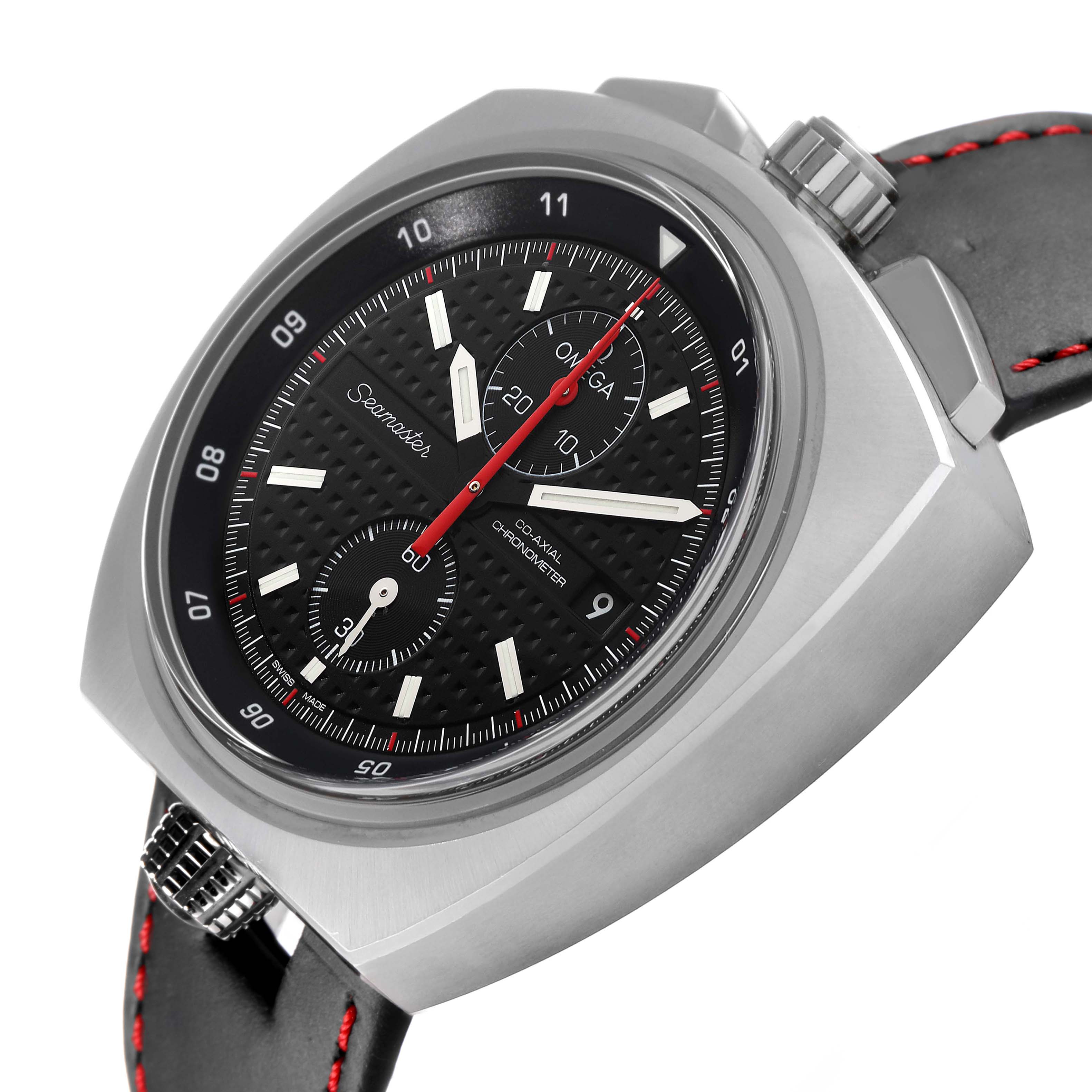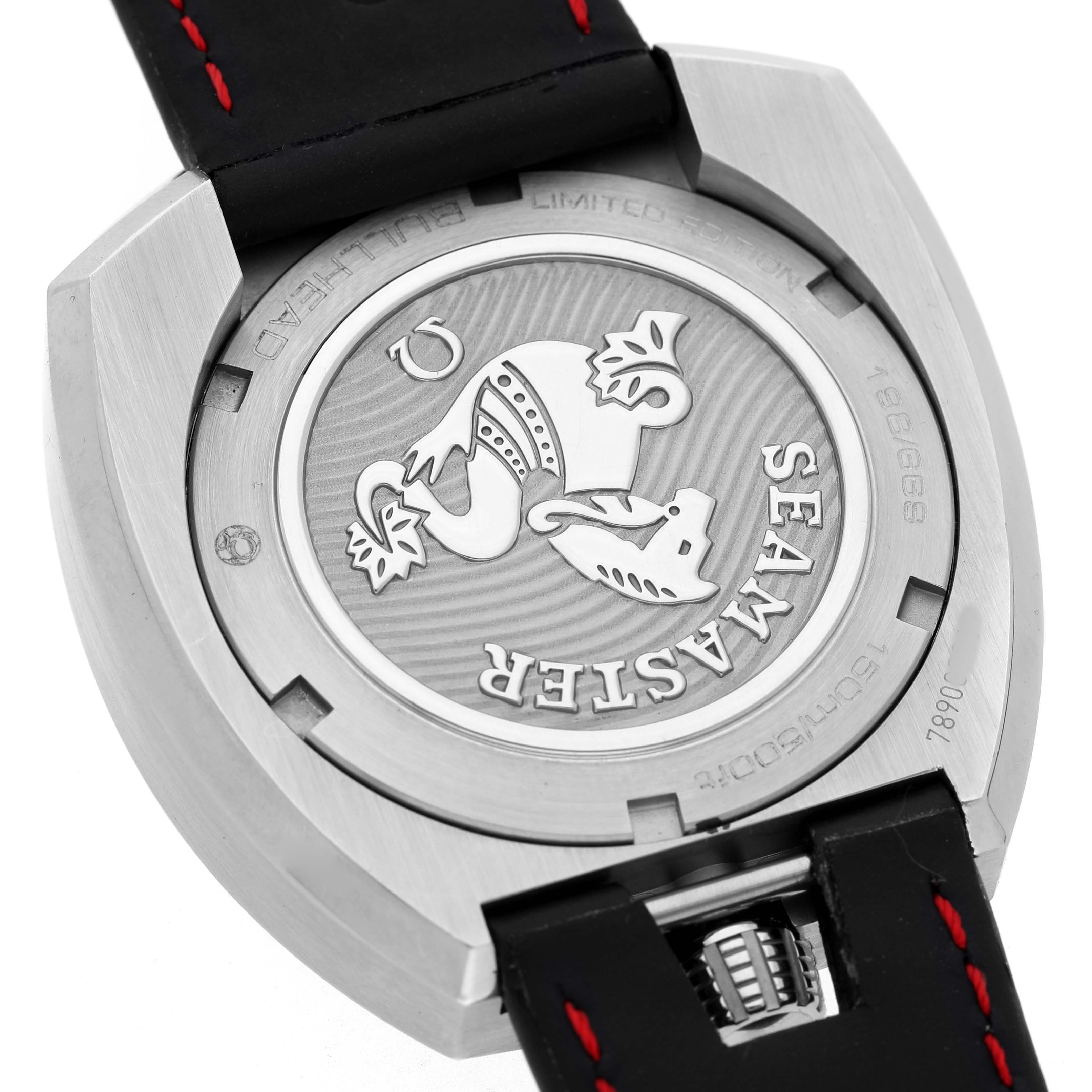 Omega Seamaster Bullhead LE Steel Mens Watch 225.12.43.50.01.001 Card. Automatic Self-winding chronograph movement with column-wheel mechanism and Co-Axial escapement. Free sprung-balance equipped with Si14 silicon balance spring. Officially certified chronometer. Caliber 3113. Brushed stainless steel case 43.0 mm in diameter. Polished steel crown and chronograph buttons located on a top of the case. Inner bezel rotating crown on a bottom of the case. Number 198 / 669. Stainless steel smooth bezel. Scratch-resistant sapphire crystal with anti-reflective treatment inside. Black dial with "Clous de Paris" textured pattern. Luminous baton hands and index hour markers. Two chronograph subdials -- 30 minutes at 12 o'clock and 60 seconds at 6. Date window at 3 o'clock. Black bi-directional bezel ring with 12 hours markers located beneath the dial. Black leather strap with red stitching. Stainless steel double push-button deployant buckle.