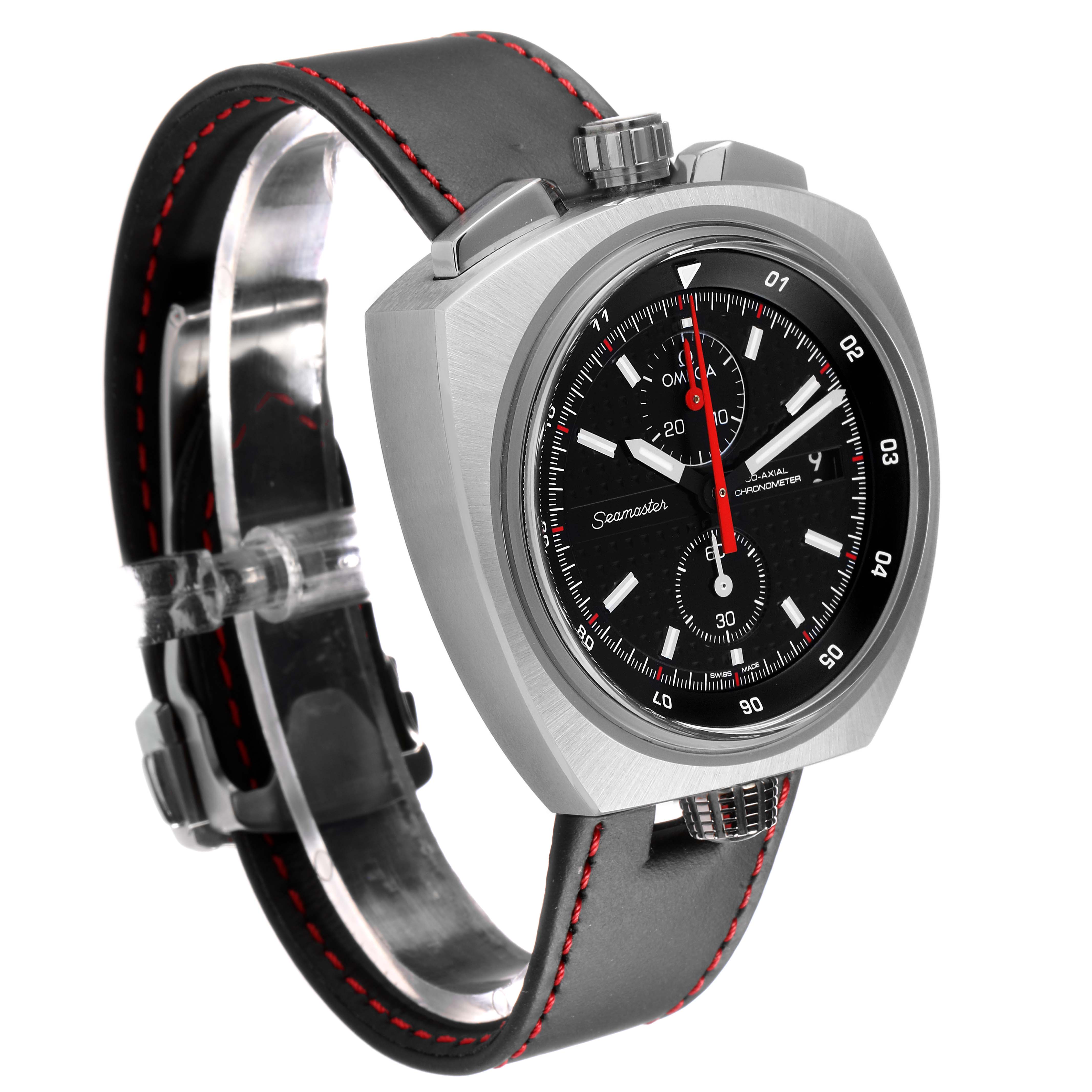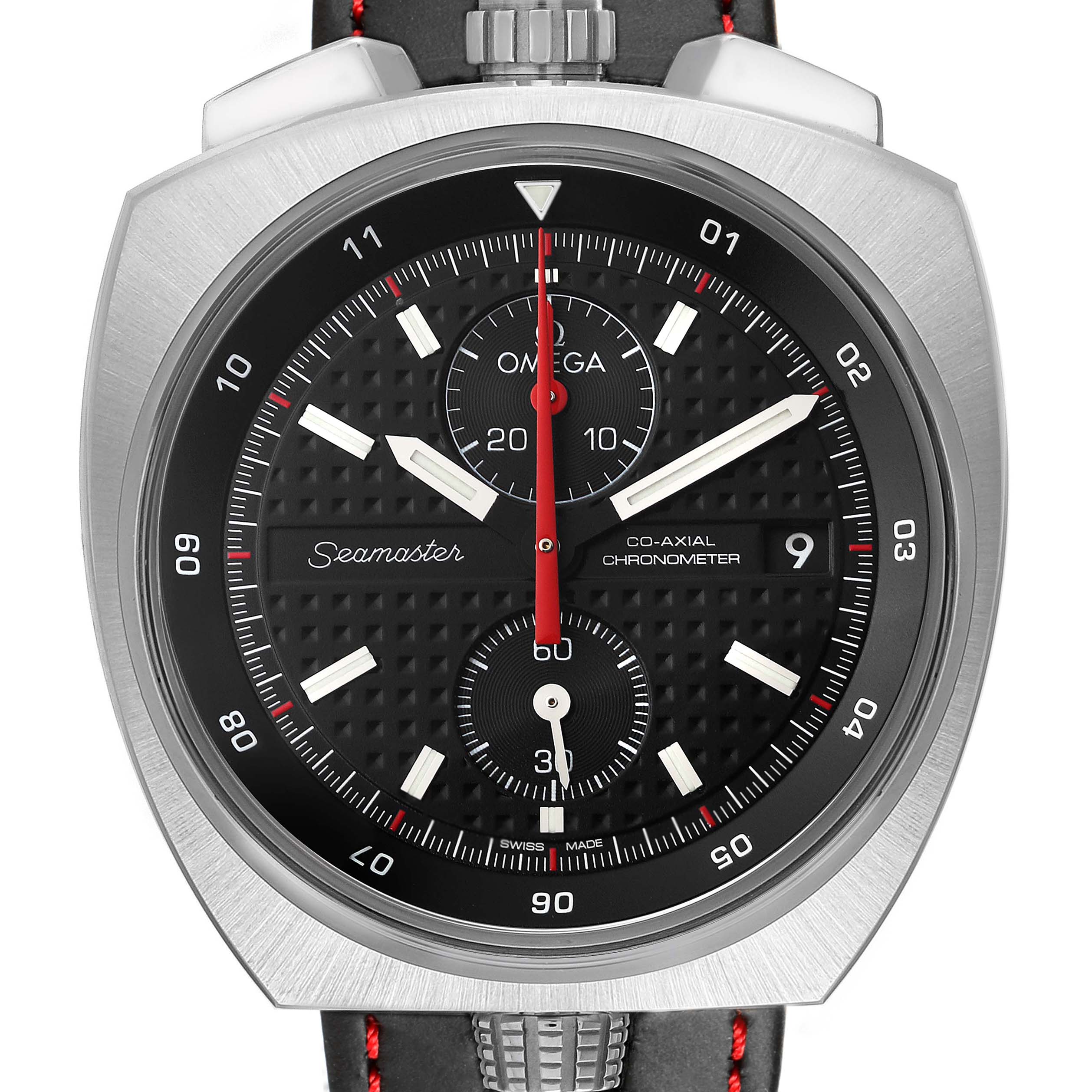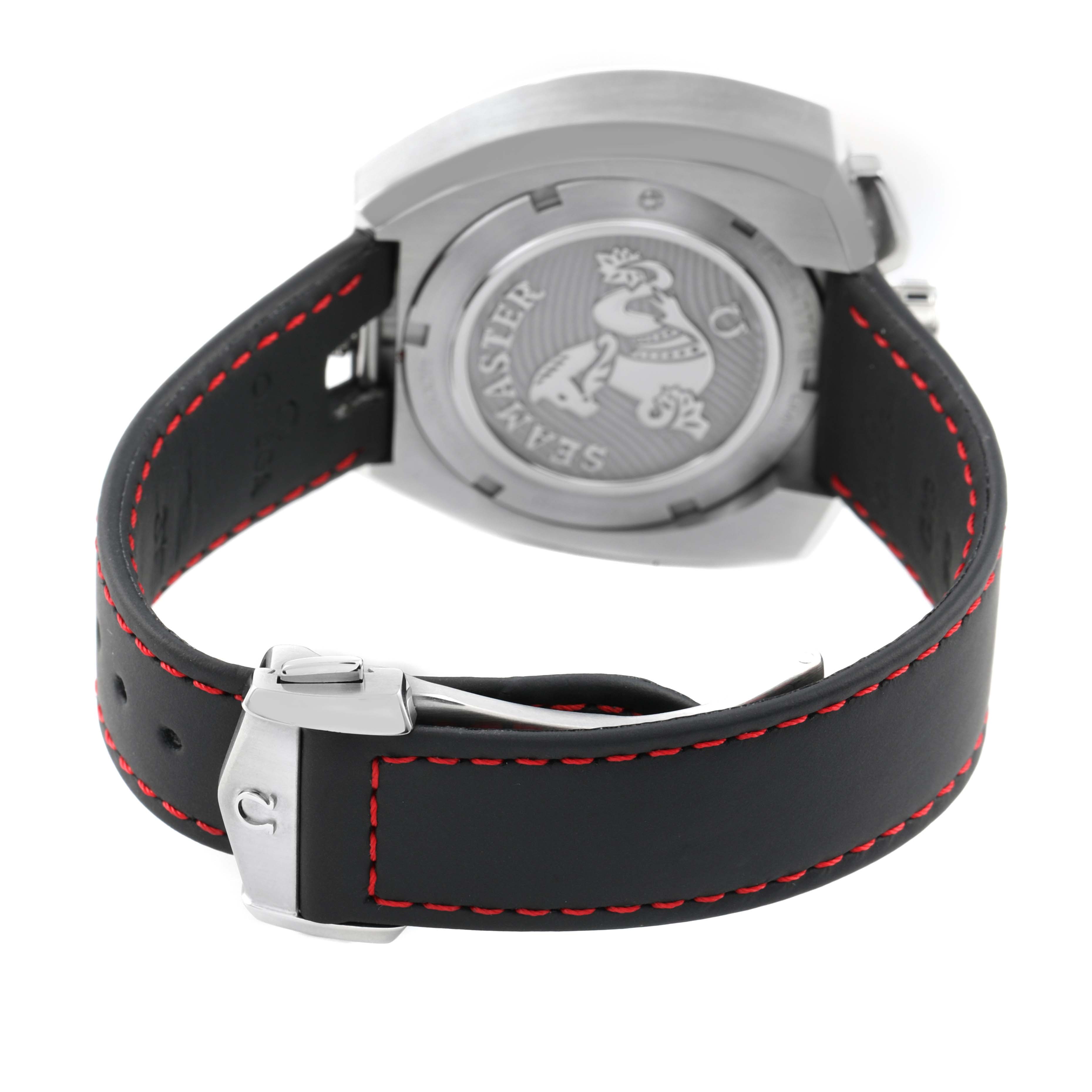 Omega Seamaster Bullhead LE Steel Mens Watch 225.12.43.50.01.001 Card. Automatic Self-winding chronograph movement with column-wheel mechanism and Co-Axial escapement. Free sprung-balance equipped with Si14 silicon balance spring. Officially certified chronometer. Caliber 3113. Brushed stainless steel case 43.0 mm in diameter. Polished steel crown and chronograph buttons located on a top of the case. Inner bezel rotating crown on a bottom of the case. Number 198 / 669. Stainless steel smooth bezel. Scratch-resistant sapphire crystal with anti-reflective treatment inside. Black dial with "Clous de Paris" textured pattern. Luminous baton hands and index hour markers. Two chronograph subdials -- 30 minutes at 12 o'clock and 60 seconds at 6. Date window at 3 o'clock. Black bi-directional bezel ring with 12 hours markers located beneath the dial. Black leather strap with red stitching. Stainless steel double push-button deployant buckle.