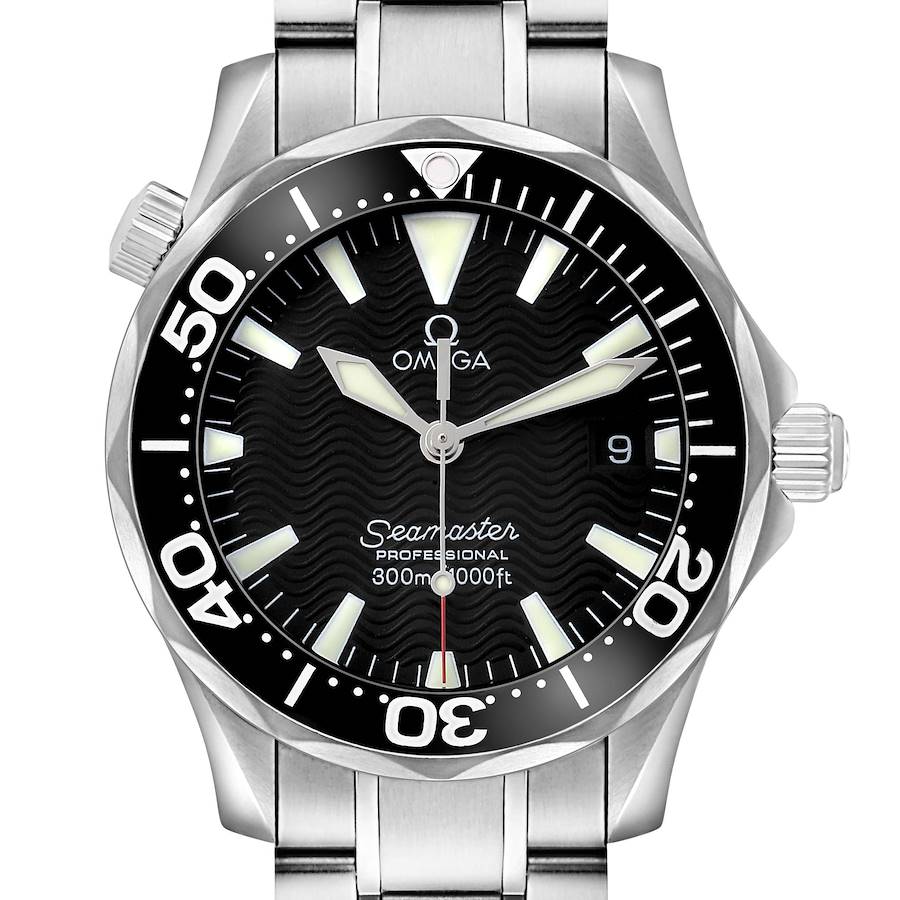 Omega Seamaster Date Diver Midsize 36 Steel Mens Watch 2262.50.00. Quartz movement. Stainless steel round case 36.25 mm in diameter. Helium escape valve at the 10 o'clock position. Pointed crown guards. Omega logo on the crown. Black unidirectional time-lapse rotating bezel. Domed anti-reflective, scratch-resistant sapphire crystal. Black wave decor dial with luminescent sword-shaped hands and index hour markers. Date calendar at the 3 o'clock aperture. Outer stick minute markers. Stainless steel bracelet with a double push-button folding clasp and diver's extension. Fits a 7.5" wrist.