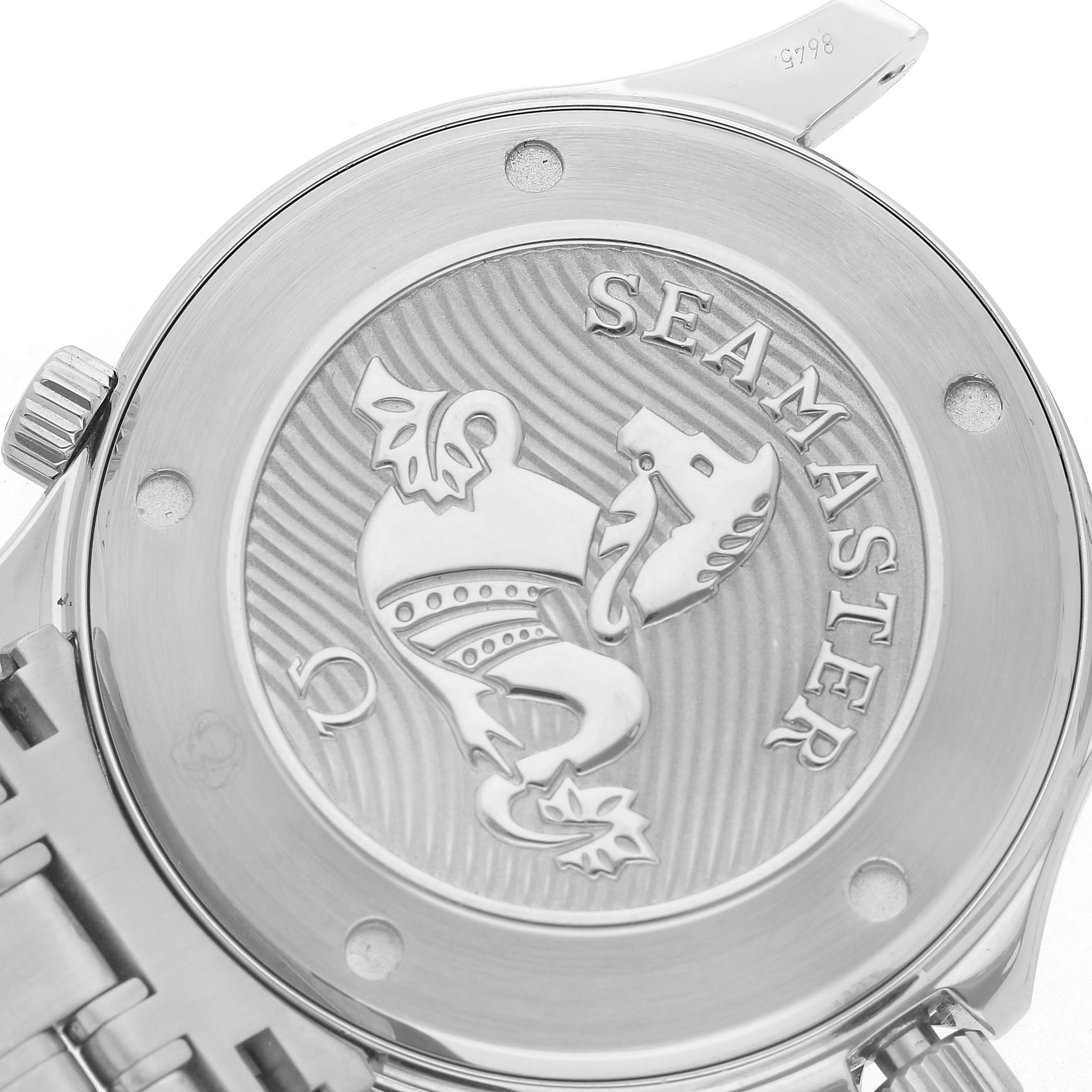 Omega Seamaster Diver 300M Mens Watch 212.30.41.20.03.001 Card. Automatic self-winding chronometer, Co-Axial Escapement movement with rhodium-plated finish. Stainless steel round case 41.0 mm in diameter. Helium escape valve at 10 o'clock. Pointed crown guards. Omega logo on the crown. Blue ceramic unidirectional time-lapse rotating bezel. Domed, scratch-resistant sapphire crystal with anti-reflective treatment on both sides. Blue dial with luminescent dot hour markers and skeletonized hands. Date window at 3 o'clock aperture. Luminescent lollipop-tipped seconds hand. Outer stick minute markers. Stainless steel bracelet with double push-button deployant clasp and diver's extension. Fits an 8 1/4" wrist.