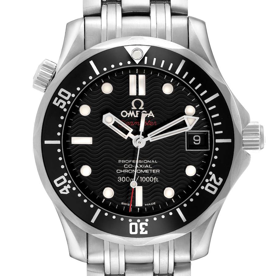 Omega Seamaster Diver 300M Midsize Steel Mens Watch 212.30.36.20.01.001 Card. Automatic self-winding movement. Stainless steel round case 36.25 mm in diameter. Helium escape value at 10 o'clock. Omega logo on the crown. Pointed crown guards. Black unidirectional rotating bezel. Domed, scratch-resistant sapphire crystal with anti-reflective treatment inside. Black wave decor dial with luminescent dot hour markers and skeletonized hands. Luminescent lollipop-tipped seconds hand. Date calendar window at 3 o'clock aperture. Stainless steel bracelet with a double push-button folding clasp. Fits a 7 3/4" wrist.