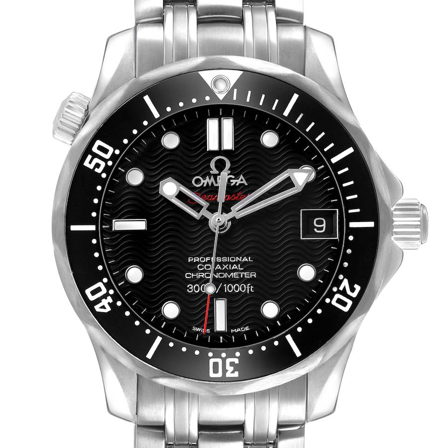 Omega Seamaster Diver 300M Midsize Steel Mens Watch 212.30.36.20.01.001 Card. Automatic self-winding movement. Calibre 2500. Stainless steel round case 36.25 mm in diameter. Helium escape value at 10 o'clock. Omega logo on the crown. Pointed crown guards. Black unidirectional rotating bezel. Domed, scratch-resistant sapphire crystal with anti-reflective treatment inside. Black wave decor dial with luminescent dot hour markers and skeletonized hands. Luminescent lollipop-tipped seconds hand. Date calendar window at 3 o'clock aperture. Stainless steel bracelet with a double push-button folding clasp. Fits a 7 1/4" wrist.