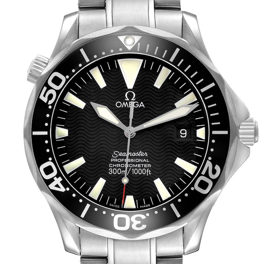 Omega Seamaster Diver 300M Steel Black Wave Dial Mens Watch 2254.50.00. Officially certified automatic self-winding chronometer movement with a 44-hour power reserve. Stainless steel round case 41.0 mm in diameter. Helium escape valve at the 10 o'clock position. Pointed crown guards. Omega logo on the crown. Black unidirectional rotating time-lapse bezel. Domed anti-reflective, scratch resistant sapphire crystal. Black wave decor dial with luminescent index hour markers and sword-shaped hands. Luminescent red-tipped lollipop centre hand. Date calendar at the 3 o'clock aperture. Outer stick minute markers. Stainless steel bracelet with a double push-button folding clasp and divers extension. Fits an 7.5" wrist.