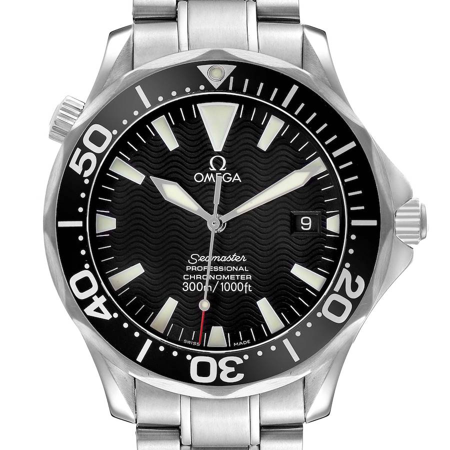 Omega Seamaster Diver 300M Steel Black Wave Dial Mens Watch 2254.50.00 Card. Officially certified automatic self-winding chronometer movement with a 44-hour power reserve. Stainless steel round case 41.0 mm in diameter. Helium escape valve at the 10 o'clock position. Pointed crown guards. Omega logo on the crown. Black unidirectional rotating time-lapse bezel. Domed anti-reflective, scratch resistant sapphire crystal. Black wave decor dial with luminescent index hour markers and sword-shaped hands. Luminescent red-tipped lollipop centre hand. Date calendar at the 3 o'clock aperture. Outer stick minute markers. Stainless steel bracelet with a double push-button folding clasp and divers extension. Fits an 8 1/4" wrist.