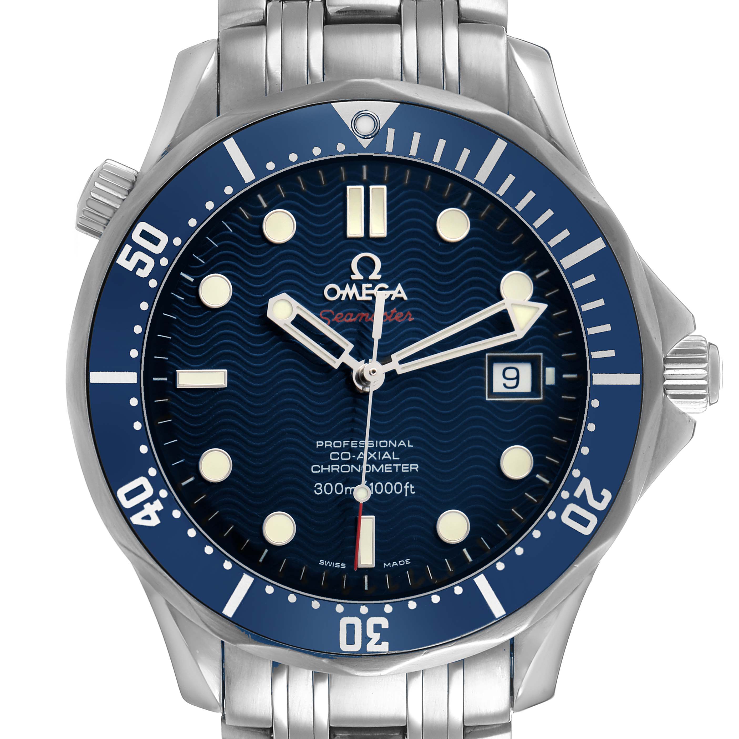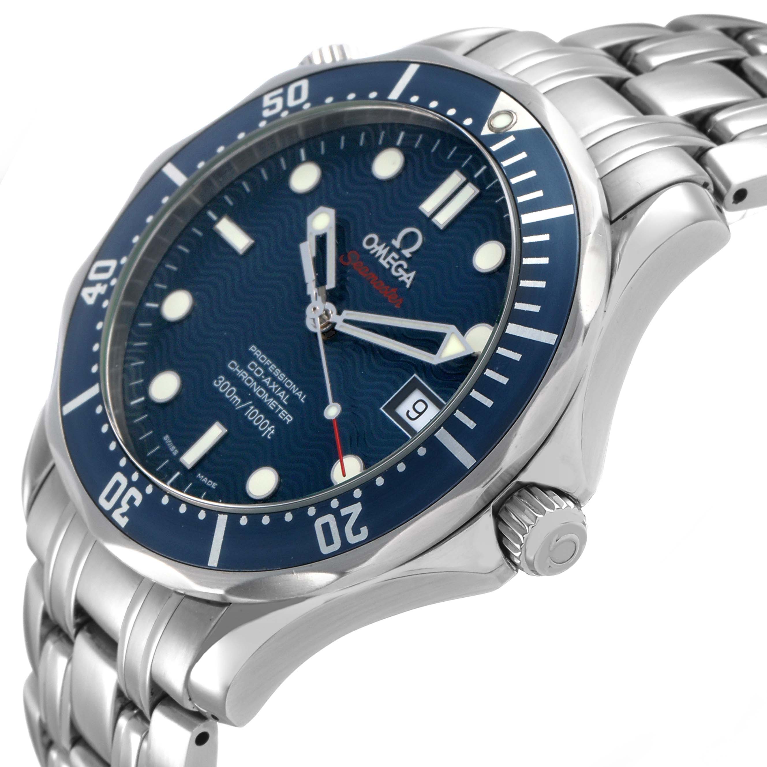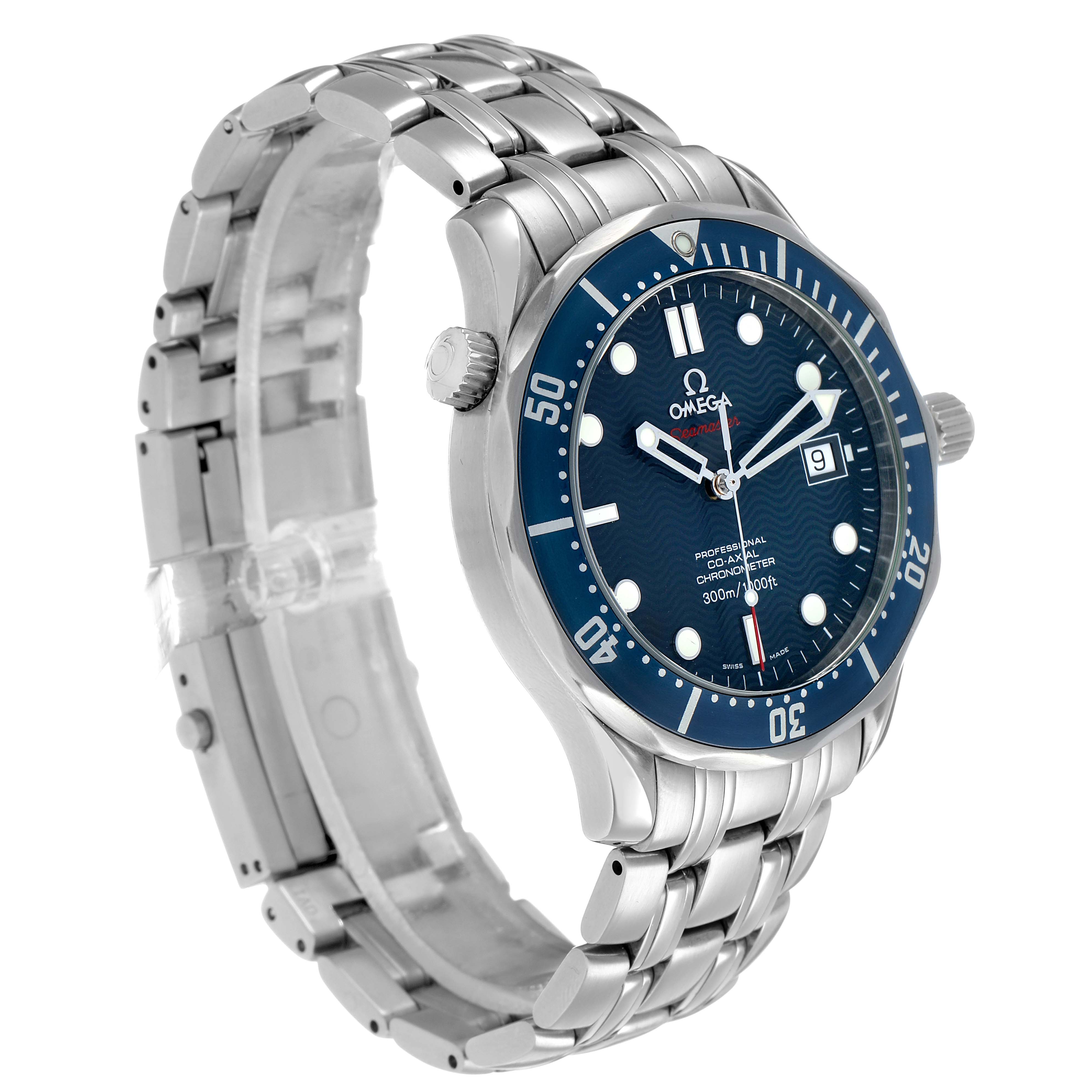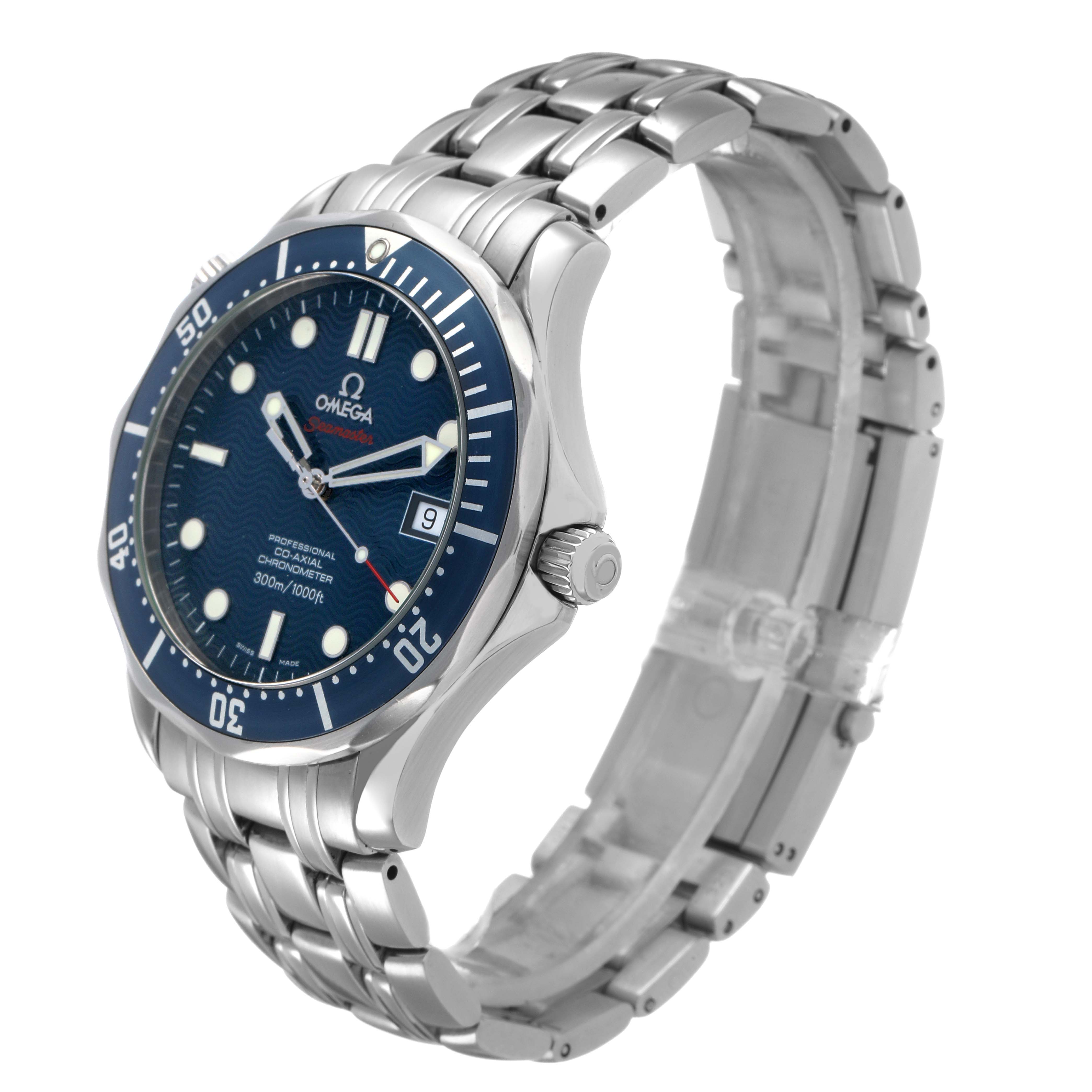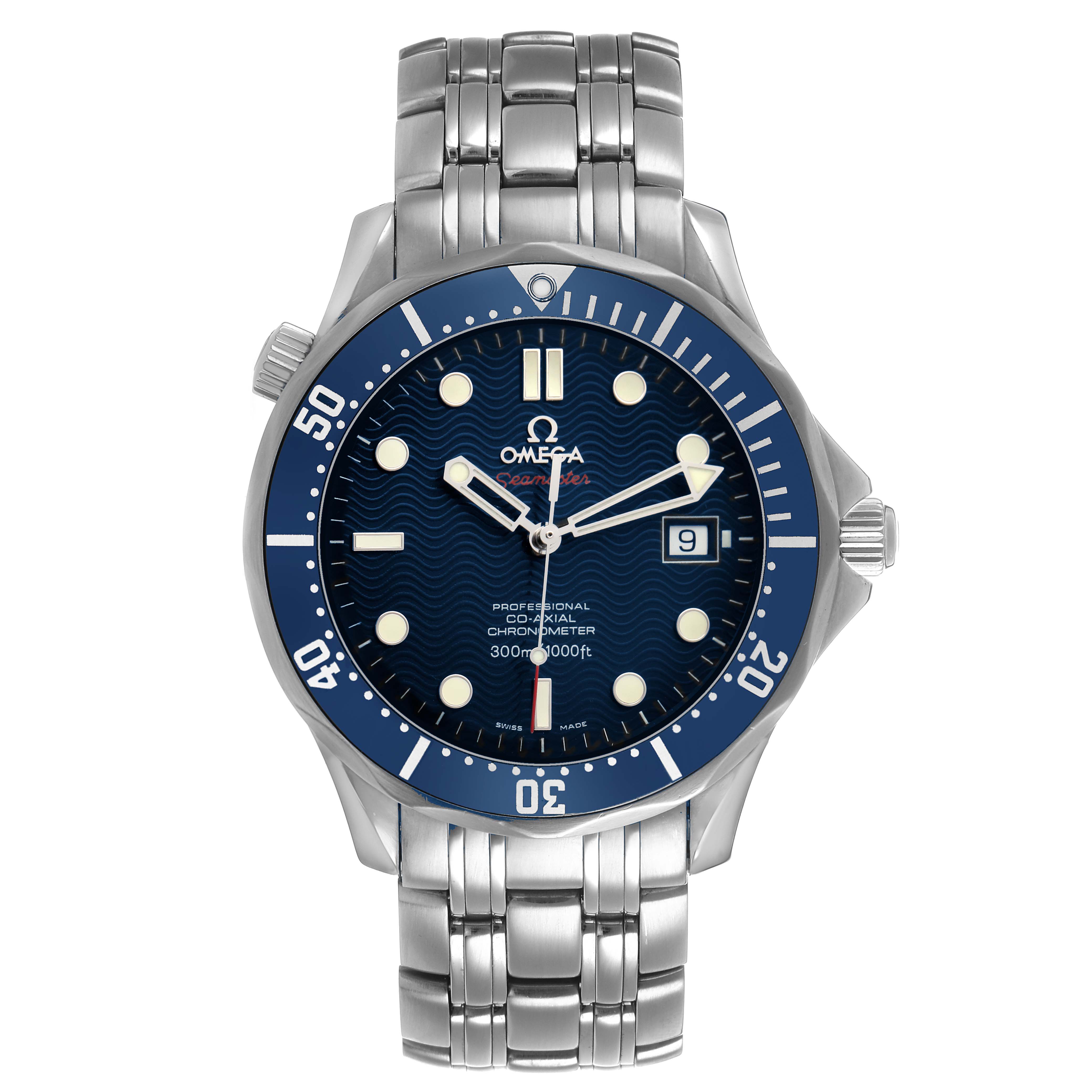 Omega Seamaster Diver 300M Steel Blue Dial Mens Watch 2220.80.00. Automatic self-winding chronometer, Co-Axial Escapement movement with rhodium-plated finish. Stainless steel round case 41.0 mm in diameter. Helium escape valve at 10 o'clock. Pointed crown guards. Omega logo on the crown. Stainless steel blue unidirectional rotating time-lapse bezel. Domed anti-reflective, scratch-resistant sapphire crystal. Blue wave decor dial with luminescent skeletonized hands and dot hour markers. Luminescent lollipop red-tipped seconds hand. Date calendar at the 3 o'clock aperture. Outer stick minute markers. Stainless steel bracelet with a double push-button folding clasp with diver's extension. Fits a 7 3/4" wrist.