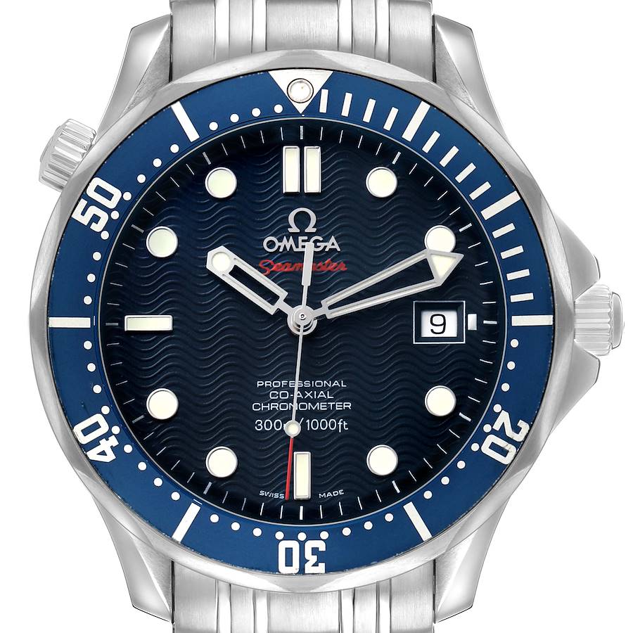 Omega Seamaster Diver 300M Steel Blue Dial Mens Watch 2220.80.00 Card. Automatic self-winding chronometer, Co-Axial Escapement movement with rhodium-plated finish. Stainless steel round case 41.0 mm in diameter. Helium escape valve at 10 o'clock. Pointed crown guards. Omega logo on the crown. Stainless steel blue unidirectional rotating time-lapse bezel. Domed anti-reflective, scratch-resistant sapphire crystal. Blue wave decor dial with luminescent skeletonized hands and dot hour markers. Luminescent lollipop red-tipped seconds hand. Date calendar at the 3 o'clock aperture. Outer stick minute markers. Stainless steel bracelet with a double push-button folding clasp with diver's extension. Fits a 7.5" wrist.