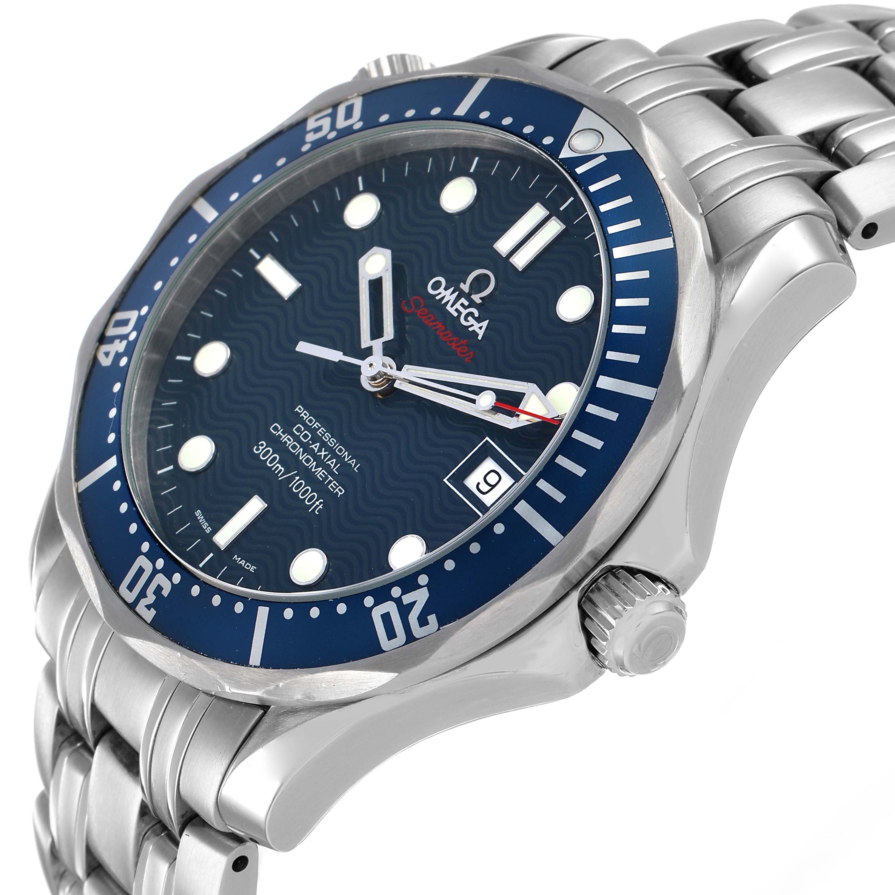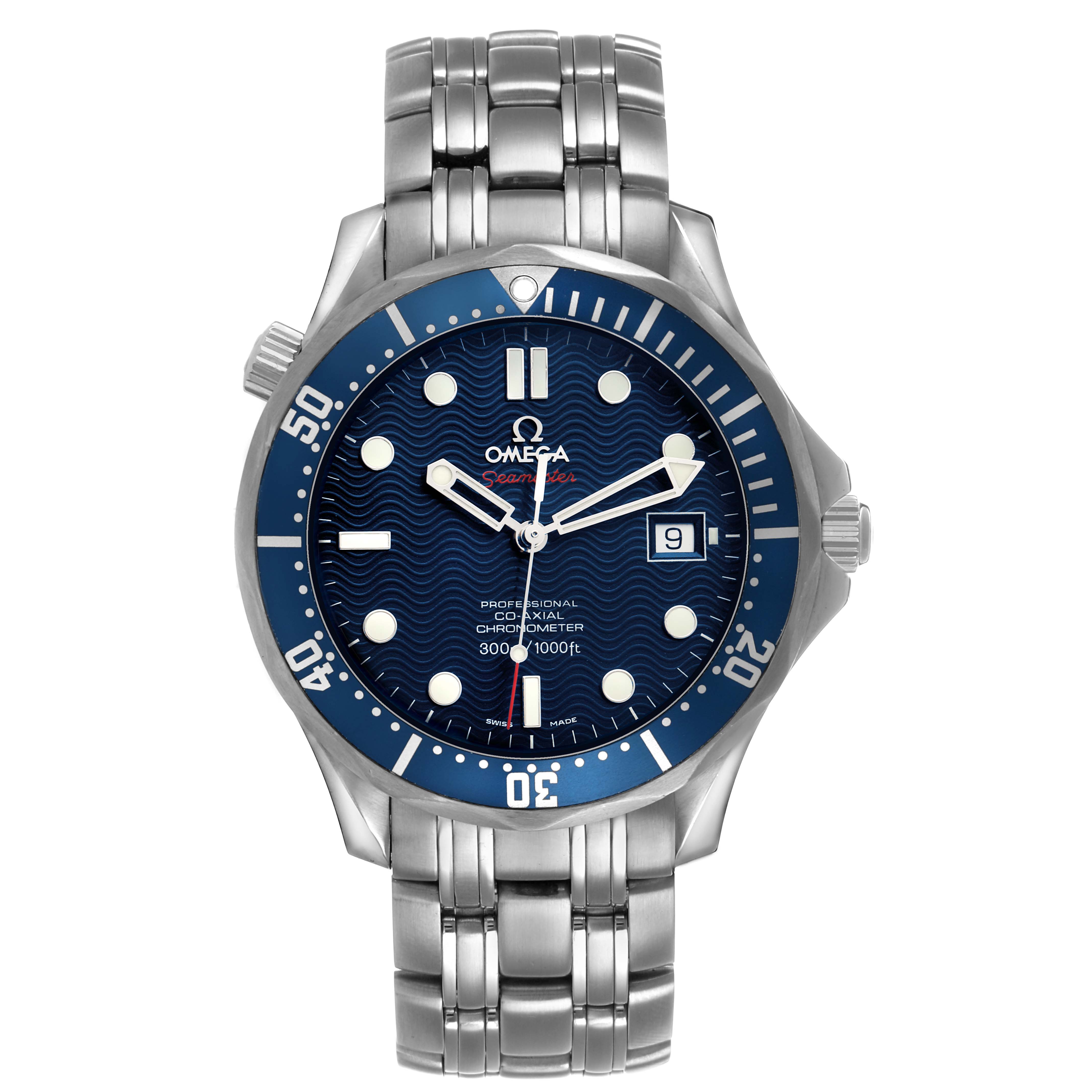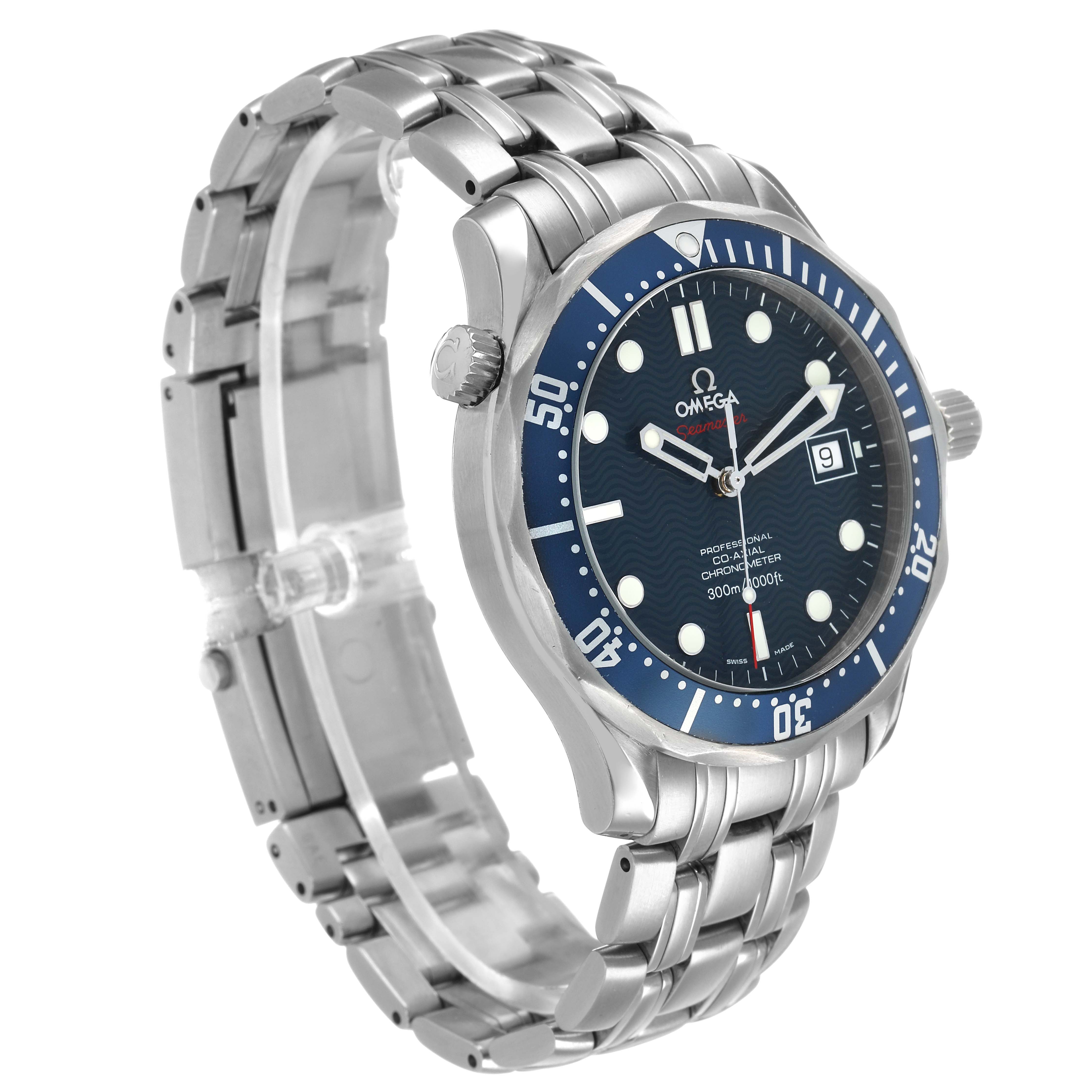 Omega Seamaster Diver 300M Steel Blue Dial Mens Watch. Automatic self-winding chronometer, Co-Axial Escapement movement with rhodium-plated finish. Stainless steel round case 41.0 mm in diameter. Helium escape valve at 10 o'clock. Pointed crown guards. Omega logo on the crown. Stainless steel blue unidirectional rotating time-lapse bezel. Domed anti-reflective, scratch-resistant sapphire crystal. Blue wave decor dial with luminescent skeletonized hands and dot hour markers. Luminescent lollipop red-tipped seconds hand. Date calendar at the 3 o'clock aperture. Outer stick minute markers. Stainless steel bracelet with a double push-button folding clasp with diver's extension. Fits a 7 3/4" wrist.