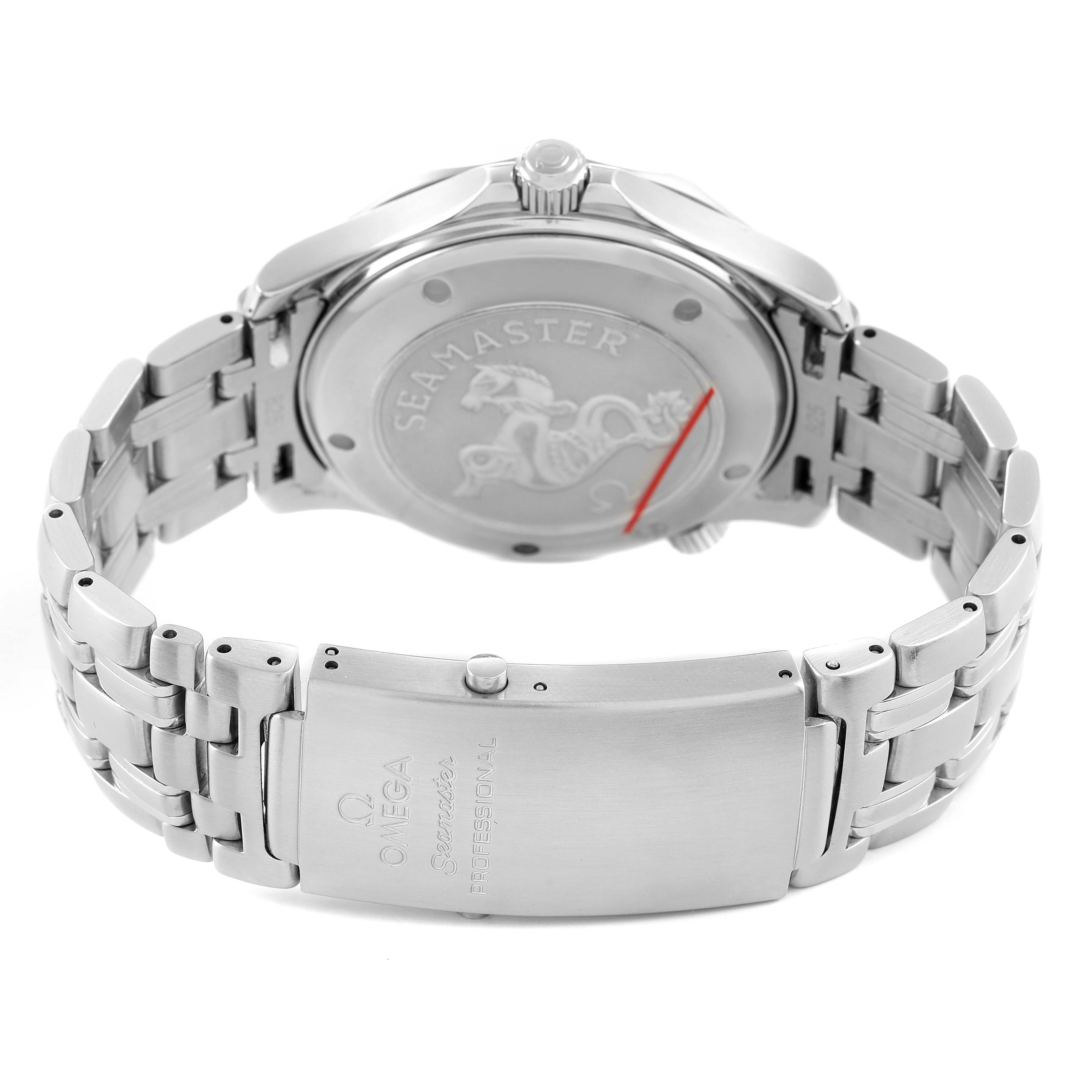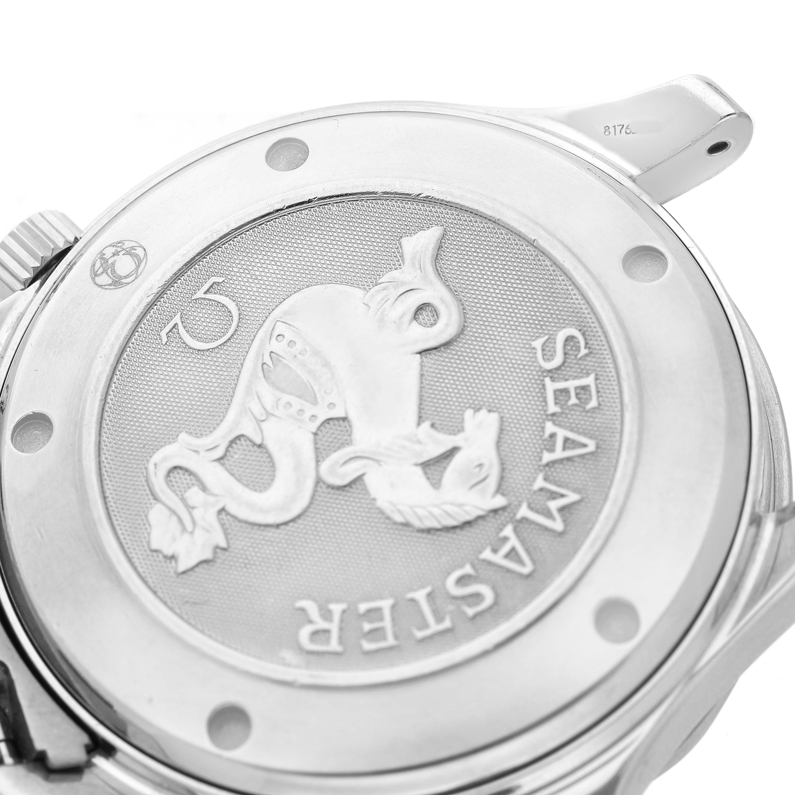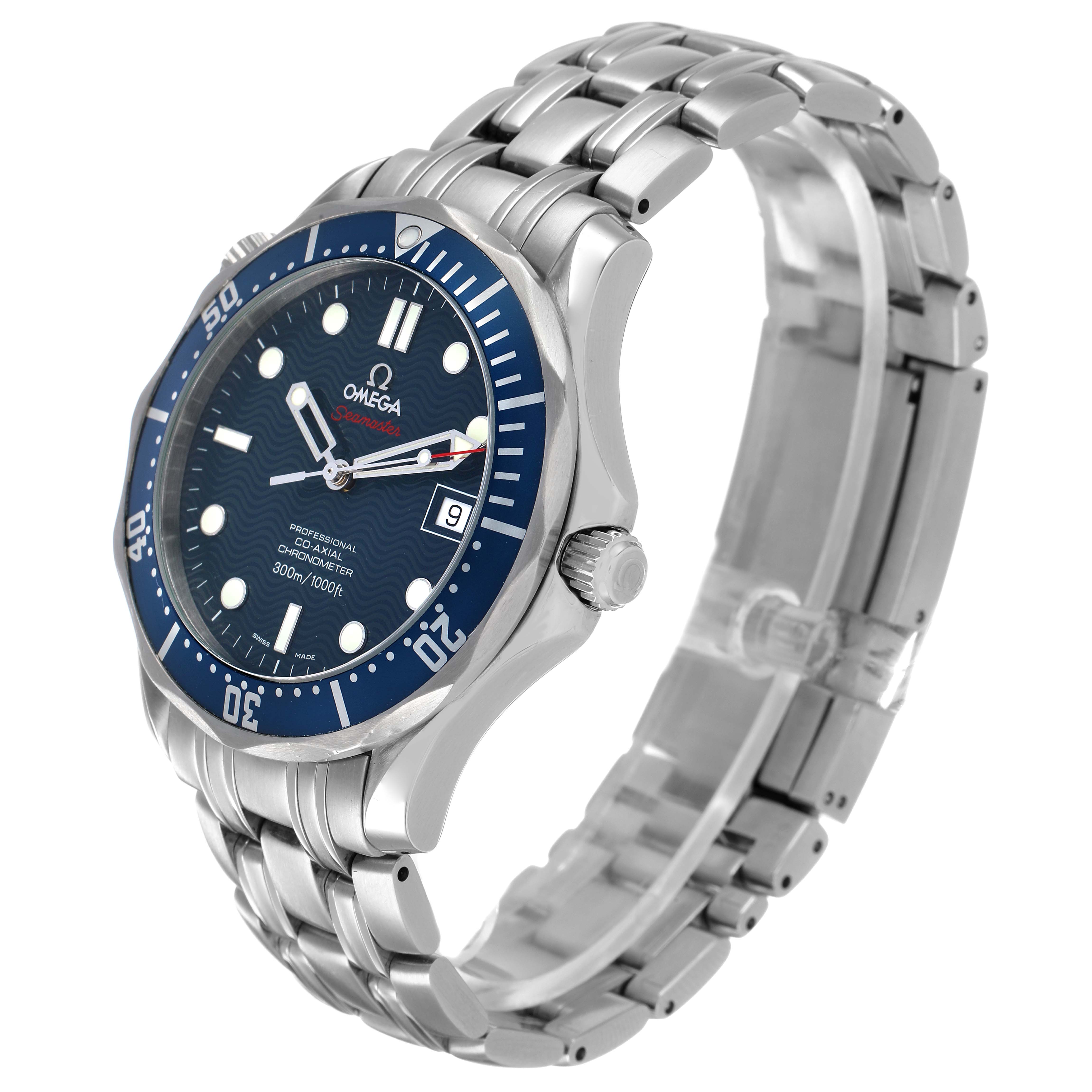 Omega Seamaster Diver 300M Steel Blue Dial Mens Watch. Automatic self-winding chronometer, Co-Axial Escapement movement with rhodium-plated finish. Stainless steel round case 41.0 mm in diameter. Helium escape valve at 10 o'clock. Pointed crown guards. Omega logo on the crown. Stainless steel blue unidirectional rotating time-lapse bezel. Domed anti-reflective, scratch-resistant sapphire crystal. Blue wave decor dial with luminescent skeletonized hands and dot hour markers. Luminescent lollipop red-tipped seconds hand. Date calendar at the 3 o'clock aperture. Outer stick minute markers. Stainless steel bracelet with a double push-button folding clasp with diver's extension. Fits a 7 3/4" wrist.
