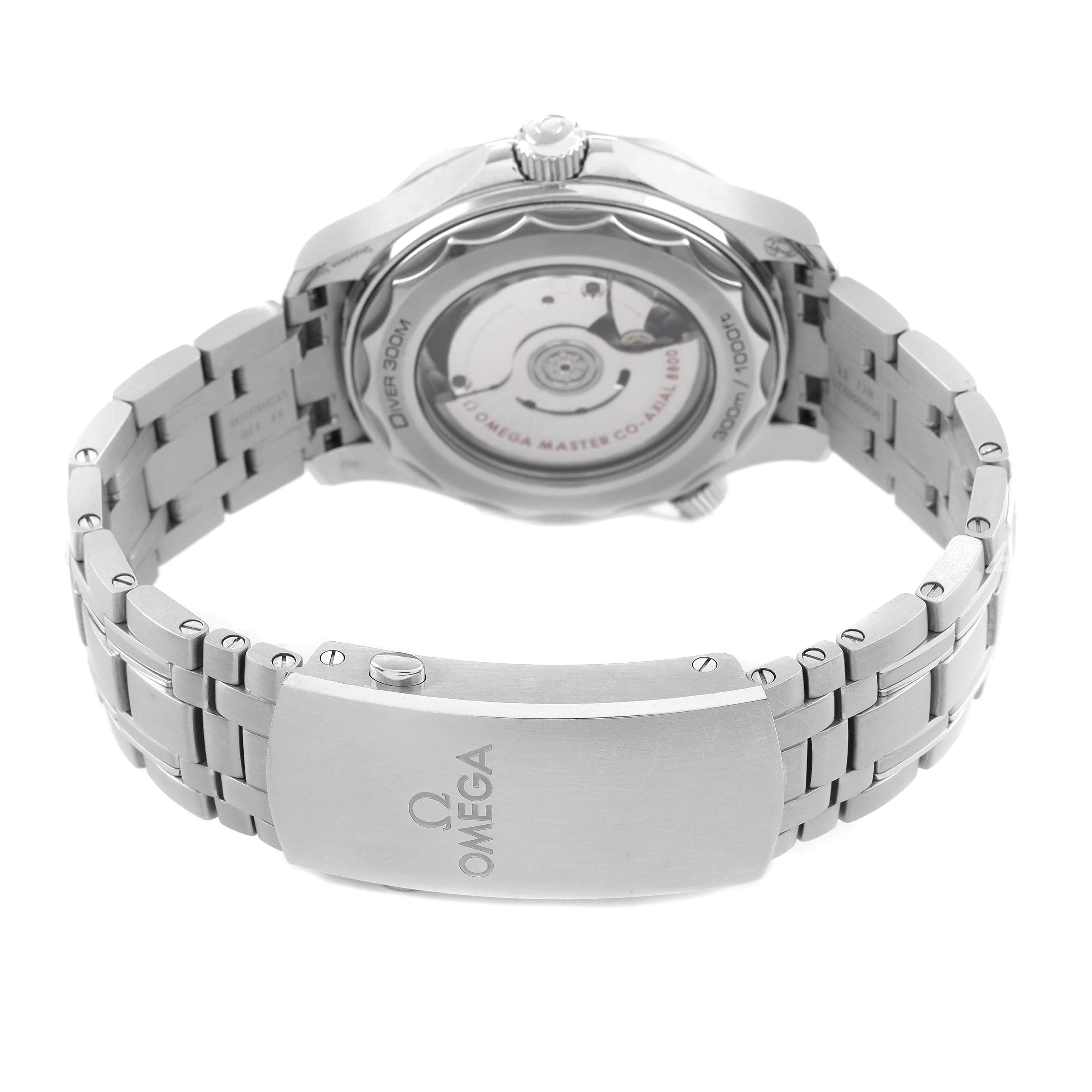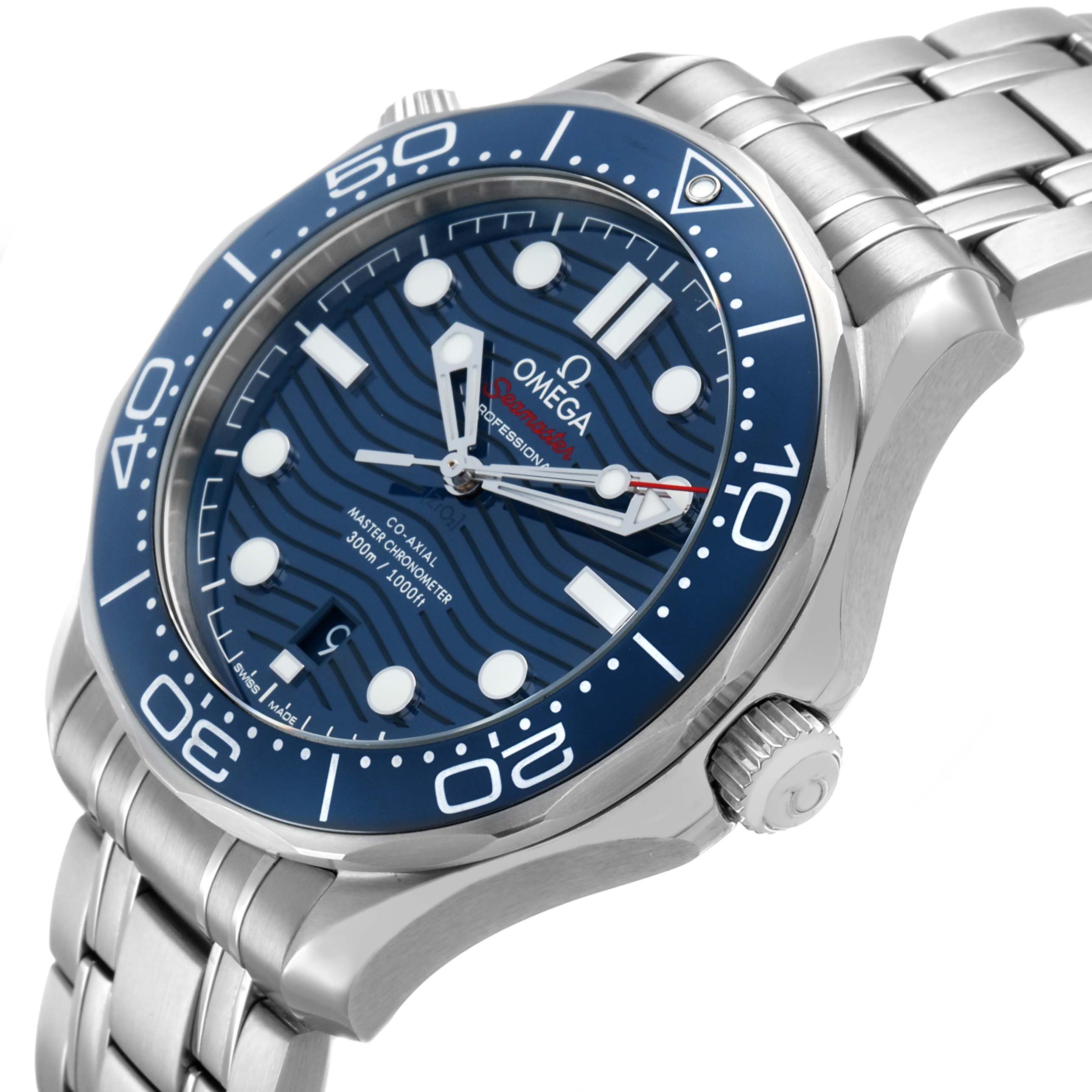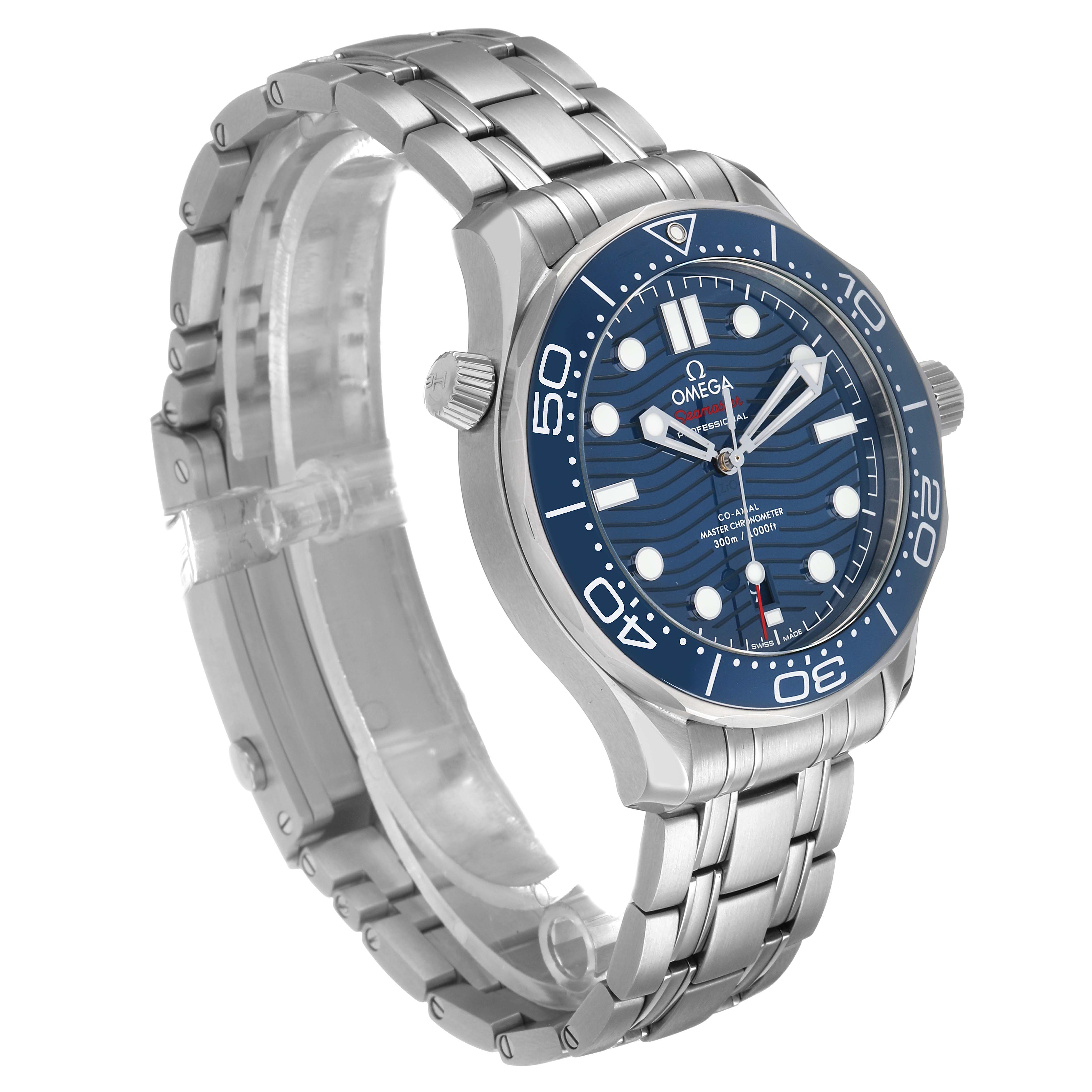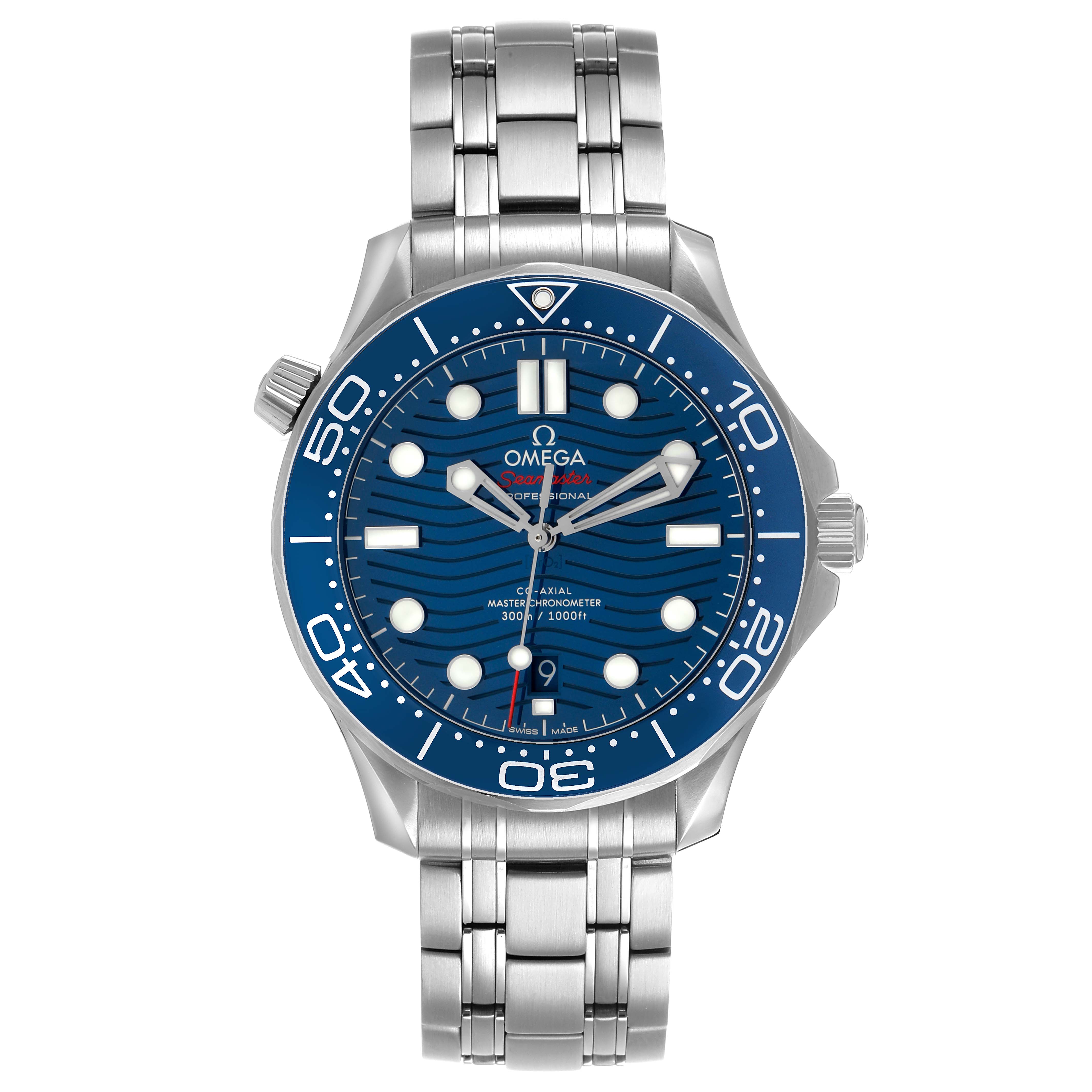 Omega Seamaster Diver 300M Steel Mens Watch 210.30.42.20.03.001 Box Cards. Automatic self-winding chronometer, Co-Axial Escapement automatic self-winding movement with rhodium-plated finish. 55-hour power reserve. Stainless steel round case 42.0 mm in diameter. Helium escape valve at 10 o'clock. Omega logo on the crown. Pointed crown guards. Transparent exhibition sapphire crystal caseback. Blue ceramic unidirectional rotating bezel with a white enamel diving scale. Domed, scratch-resistant sapphire crystal with anti-reflective treatment on both sides. Blue ceramic dial with laser-engraved waves. Luminescent skeletonized hands and dot hour markers. Date window at the 6 o'clock aperature. Stainless steel bracelet with a double push button deployant folding clasp, diver's extension, and ratcheting micro adjustment. Fits a 9" wrist.