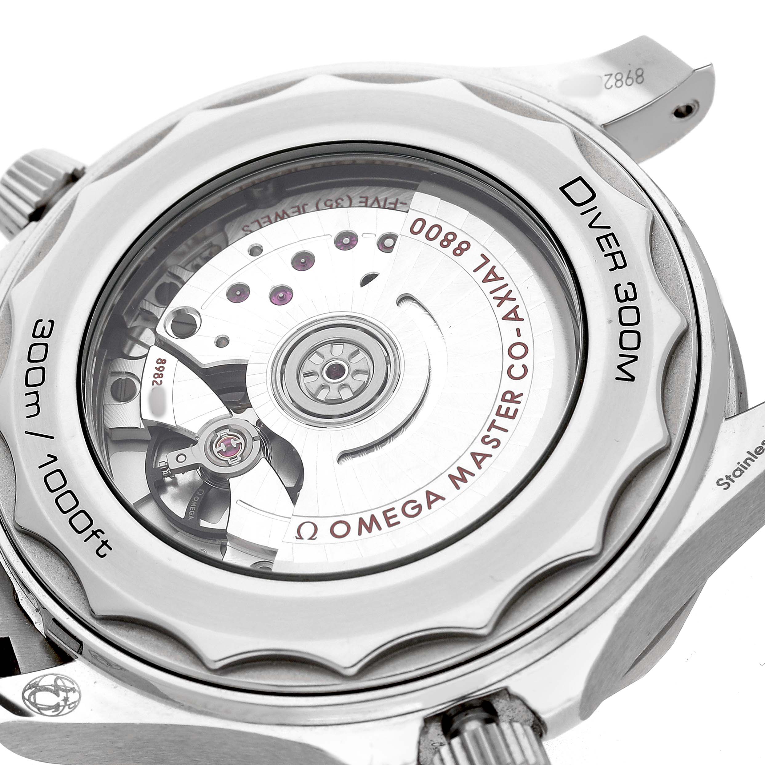 | Case: | Stainless steel round case 42.0 mm in diameter. Helium escape valve at 10 o'clock. Omega logo on the crown. Pointed crown guards. Transparent exhibition sapphire crystal caseback. |