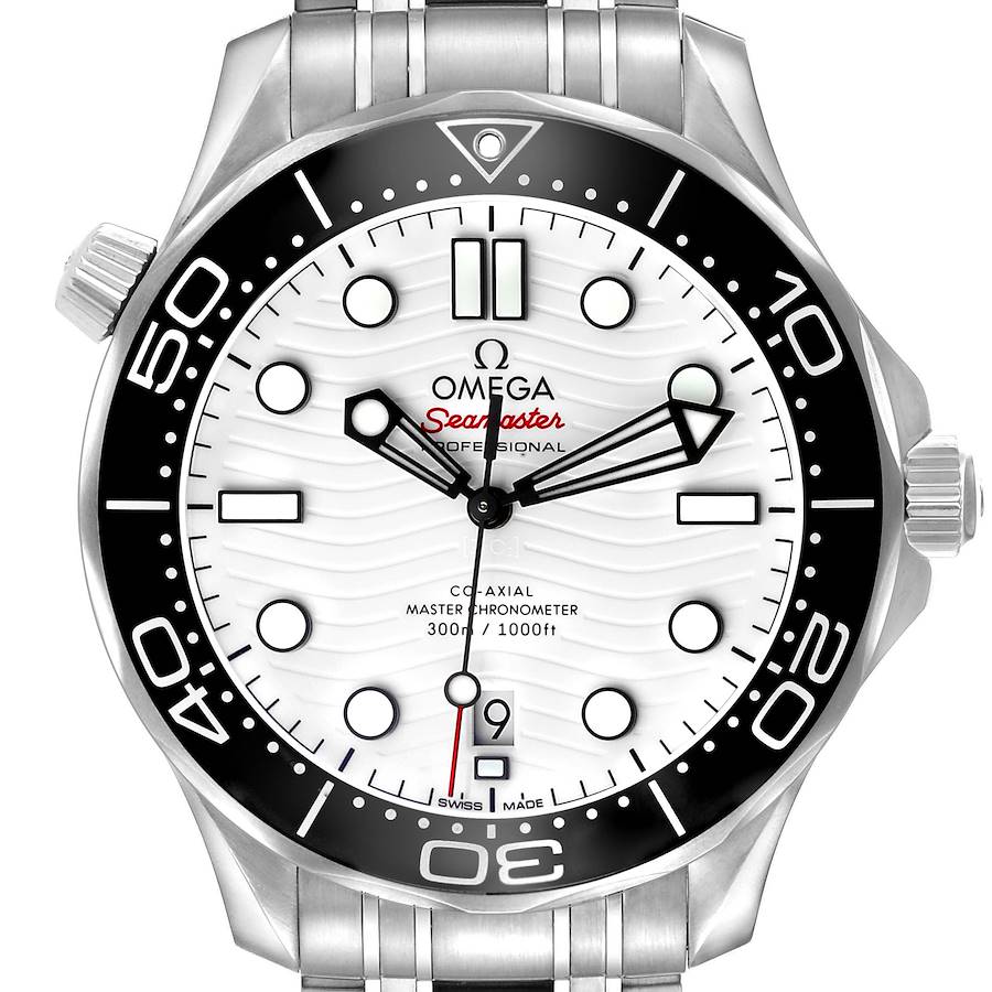 Omega Seamaster Diver 300M Steel Mens Watch 210.30.42.20.04.001 Box Card. Automatic self-winding chronometer, Co-Axial Escapement movement with rhodium-plated finish. Stainless steel round case 42.0 mm in diameter. Helium escape valve at 10 o'clock. Omega logo on the crown. Pointed crown guards. Transparent exhibition sapphire crystal caseback. Black ceramic unidirectional rotating time-lapse bezel with a white enamel diving scale. Domed, scratch-resistant sapphire crystal with anti-reflective treatment on both sides. White high gloss ceramic dial with laser-engraved waves pattern. Luminescent skeletonized hands and dot hour markers. Centre luminescent lolipop-tipped seconds hand. Date window at the 6 o'clock aperture. Stainless steel bracelet with a double push-button deployant clasp, diver's extension, and ratcheting micro-adjustment. Fits an 7 3/4" wrist.