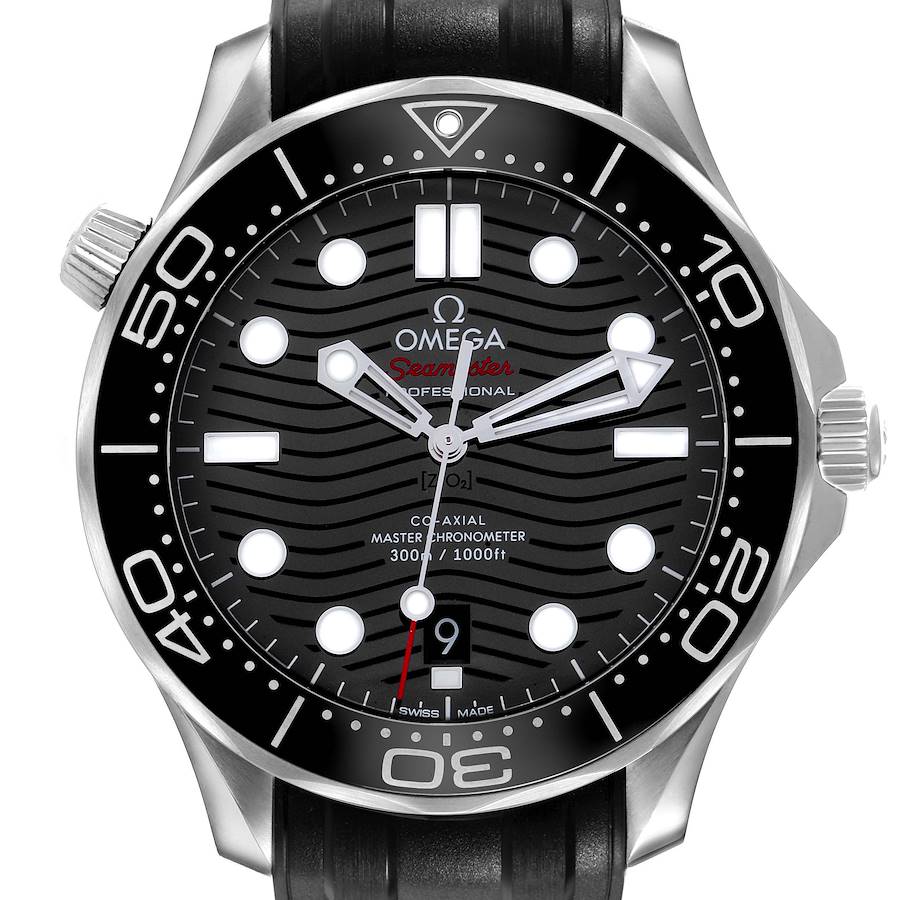 Omega Seamaster Diver 300M Steel Mens Watch 210.32.42.20.01.001 Box Card. Automatic self-winding movement with Co-Axial escapement. Certified Master Chronometer, approved by METAS, resistant to magnetic fields reaching 15,000 gauss. Free sprung-balance with silicon balance spring, automatic winding in both directions. Stainless steel round case 42.0 mm in diameter. Omega logo on the crown. Pointed crown guards. Helium escape valve at 10 o'clock. Transparent exhibition sapphire crystal wave-edged caseback. Black ceramic unidirectional rotating time-lapse bezel with a white enamel diving scale. Domed scratch-resistant sapphire crystal with anti-reflective treatment on both sides. PVD Chrome black ceramic dial with laser-engraved waves. Luminescent skeletonized hands and dot hour markers. Luminescent lollipop-tipped center seconds hand. Outer stick minute markers. Date calendar at the 6 o'clock aperture. Black rubber strap with a stainless steel tang buckle.