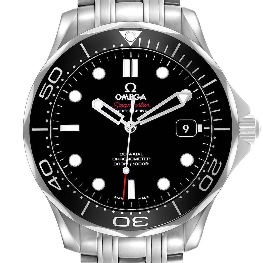 Omega Seamaster Diver 300M Steel Mens Watch 212.30.41.20.01.003 Cards. Automatic self-winding chronometer, Co-Axial Escapement movement. Stainless steel round case 41.0 mm in diameter. Helium escape valve at 10 o'clock. Pointed crown guards. Omega logo on the crown. Black ceramic unidirectional rotating time-lapse bezel. Domed, scratch resistant sapphire crystal wit anti-reflective treatment on both sides. Black dial with luminescent skeletonized hands and dot hour markers. Luminescent lollipop-tipped centre seconds hand. Outer stick minute markers. Date calendar at the 3 o'clock aperture. Stainless steel bracelet with a double push-button folding clasp. Fits an 8" wrist.