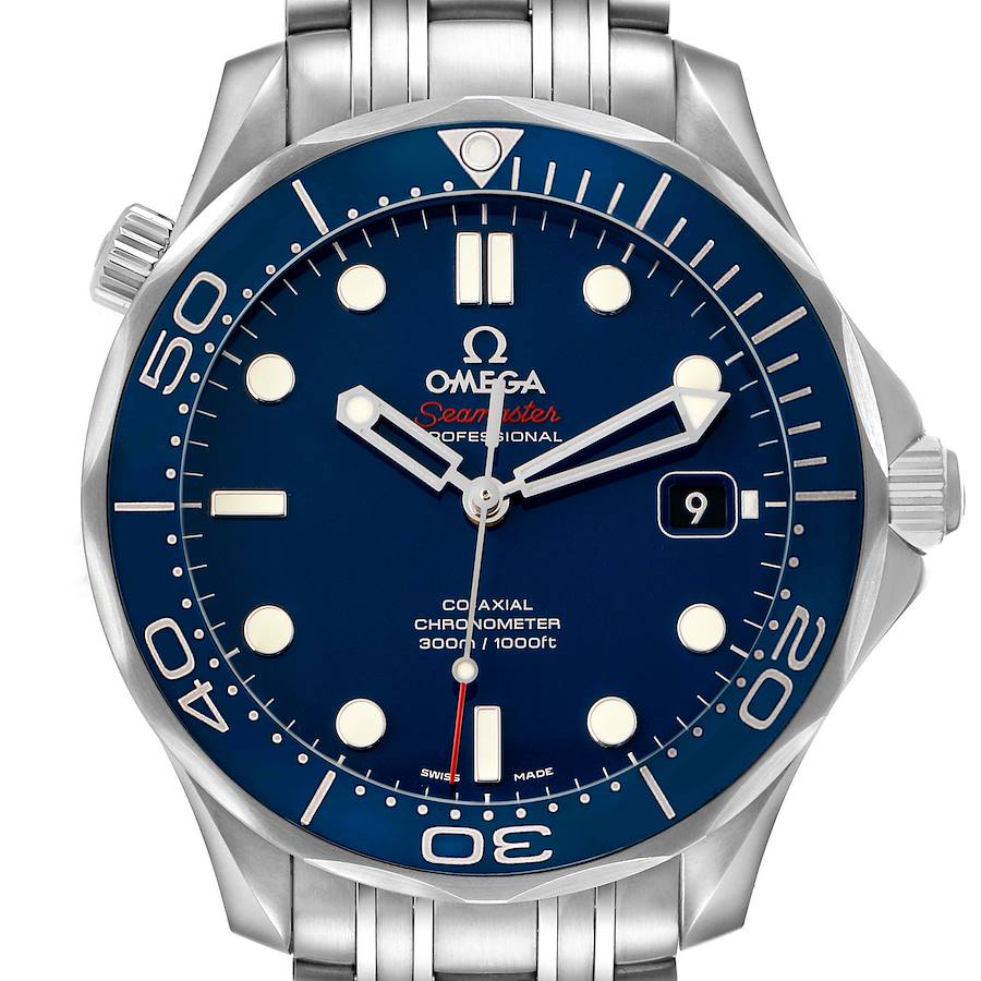 Omega Seamaster Diver 300M Steel Mens Watch 212.30.41.20.03.001. Automatic self-winding chronometer, Co-Axial Escapement movement with rhodium-plated finish. Stainless steel round case 41.0 mm in diameter. Helium escape valve at 10 o'clock. Pointed crown guards. Omega logo on the crown. Blue ceramic unidirectional time-lapse rotating bezel. Domed, scratch-resistant sapphire crystal with anti-reflective treatment on both sides. Blue dial with luminescent dot hour markers and skeletonized hands. Date window at 3 o'clock aperture. Luminescent lollipop-tipped seconds hand. Outer stick minute markers. Stainless steel bracelet with double push-button deployant clasp and diver's extension. Fits a 7 1/2" wrist.