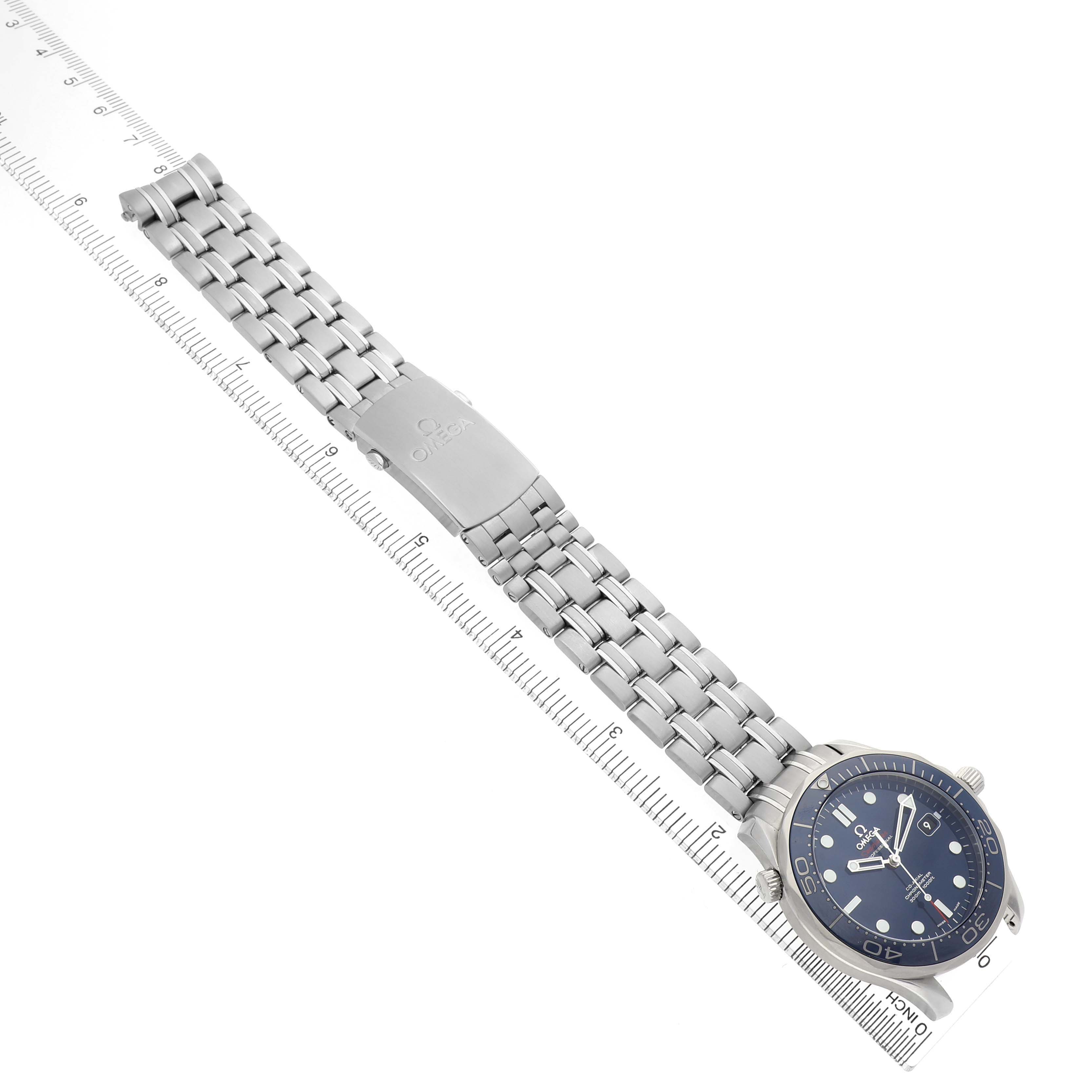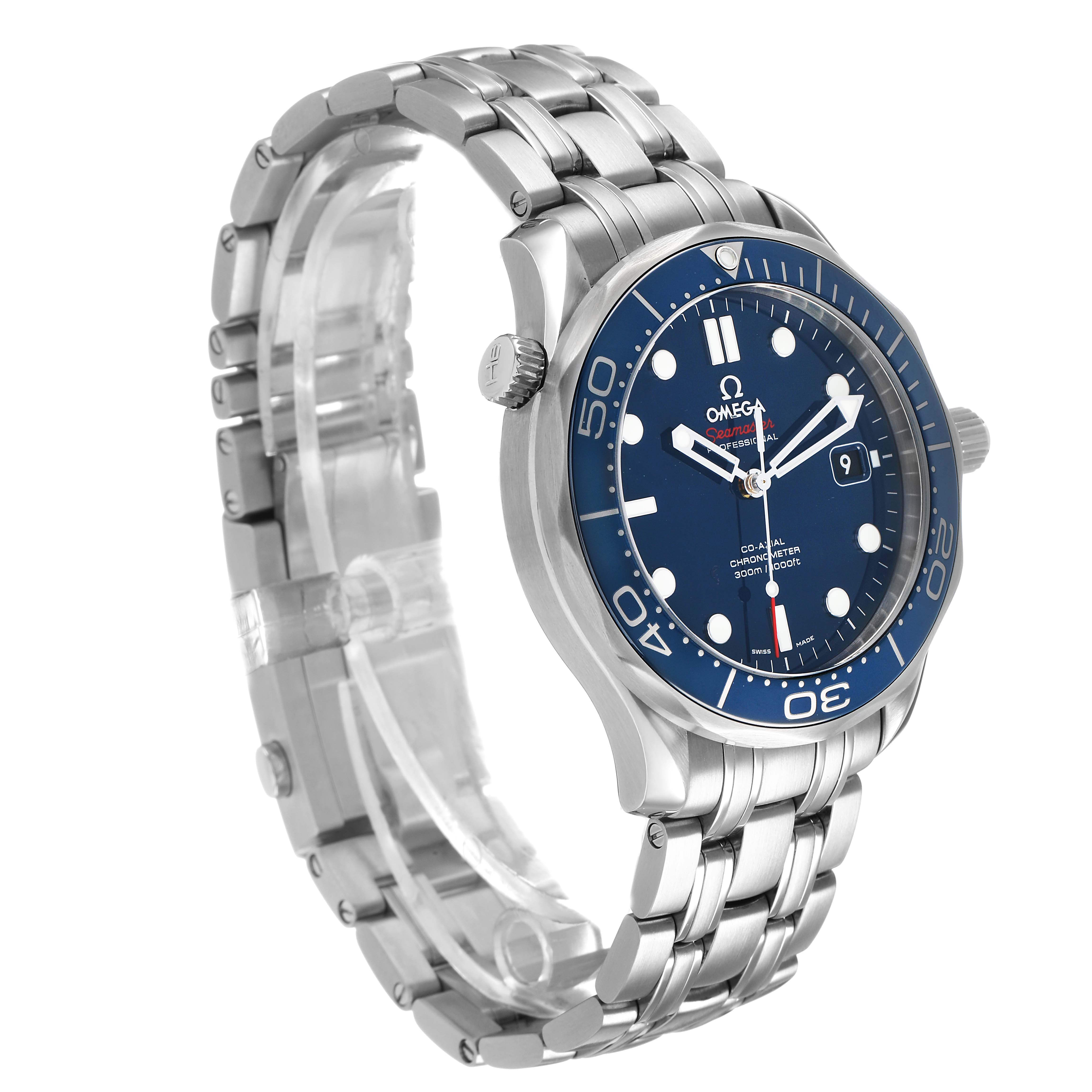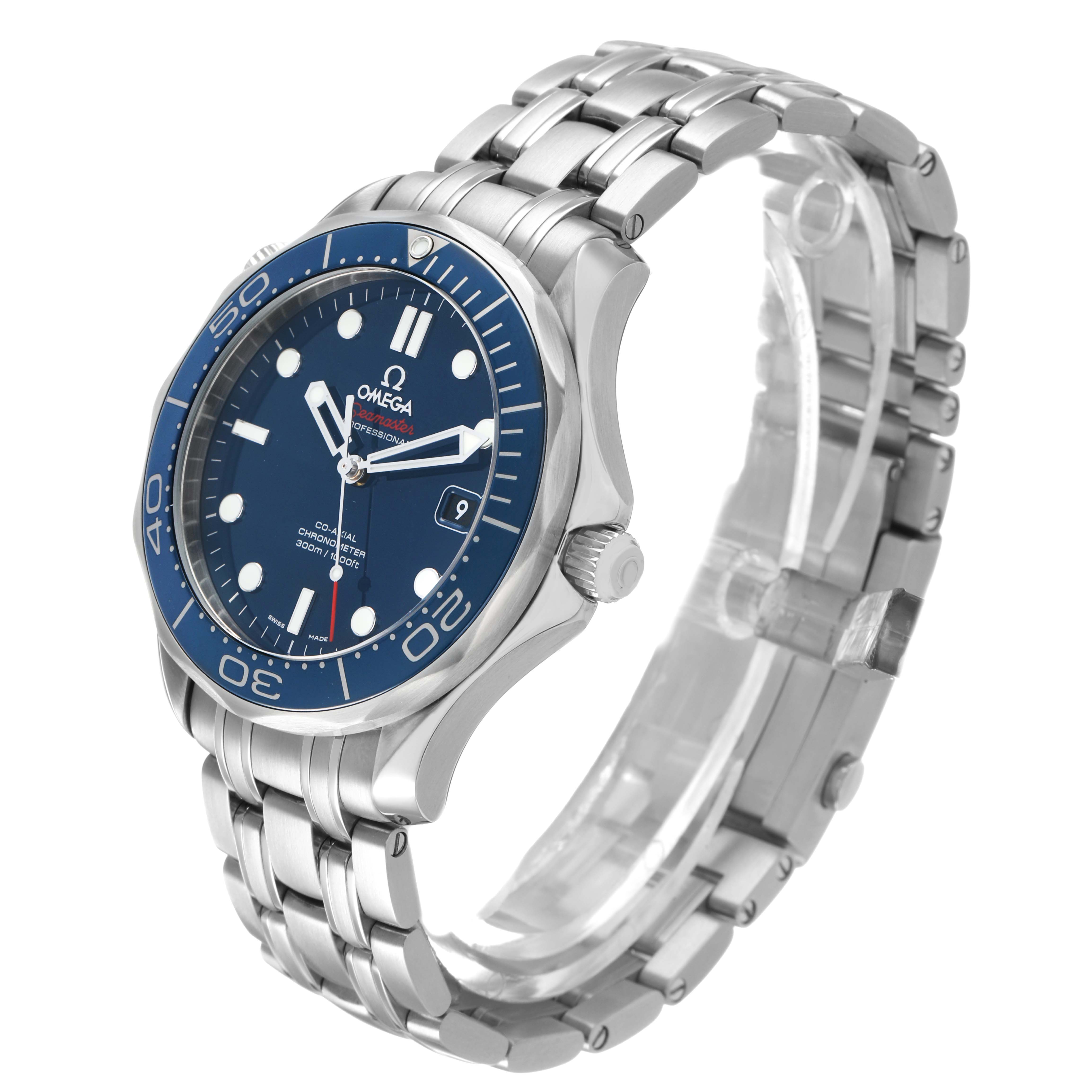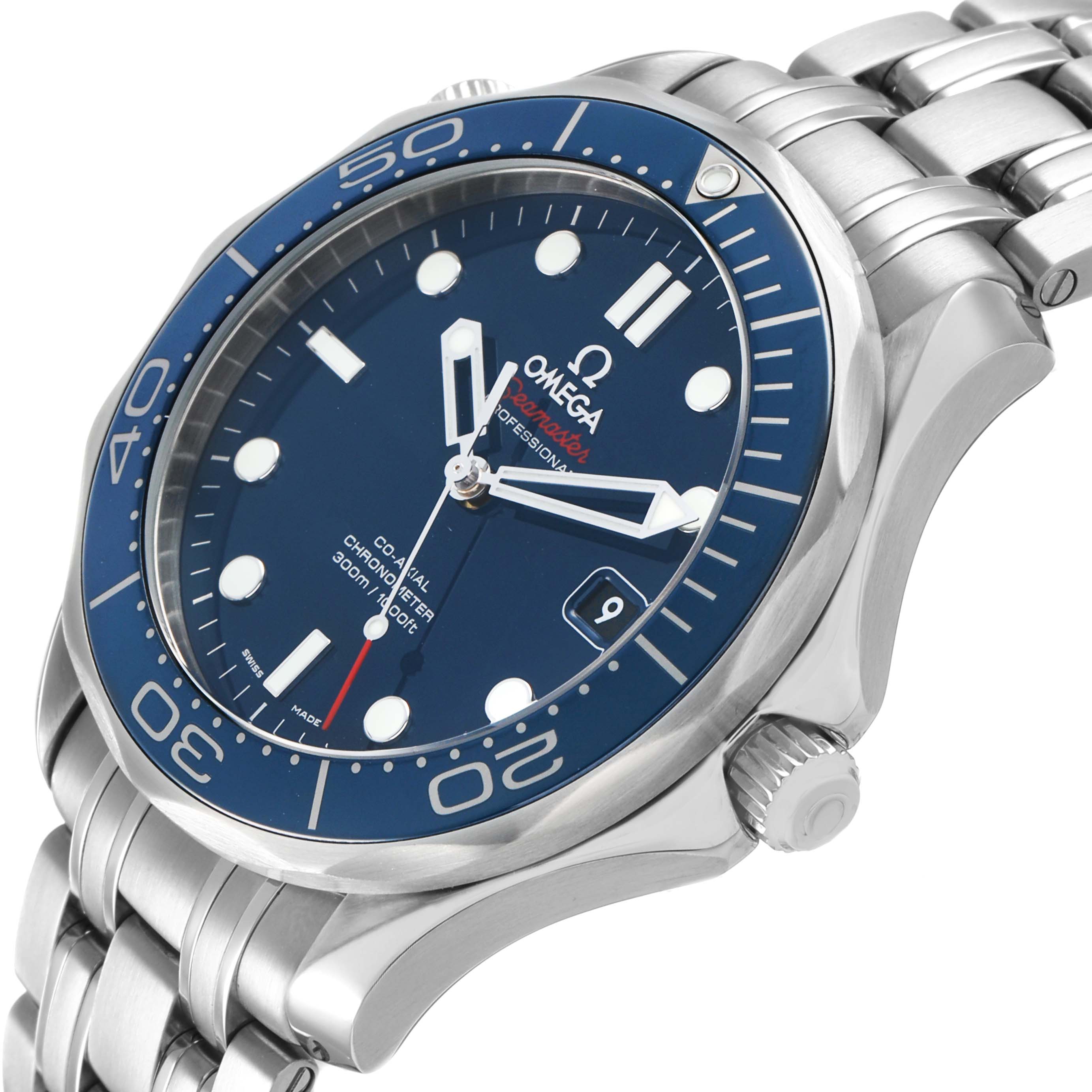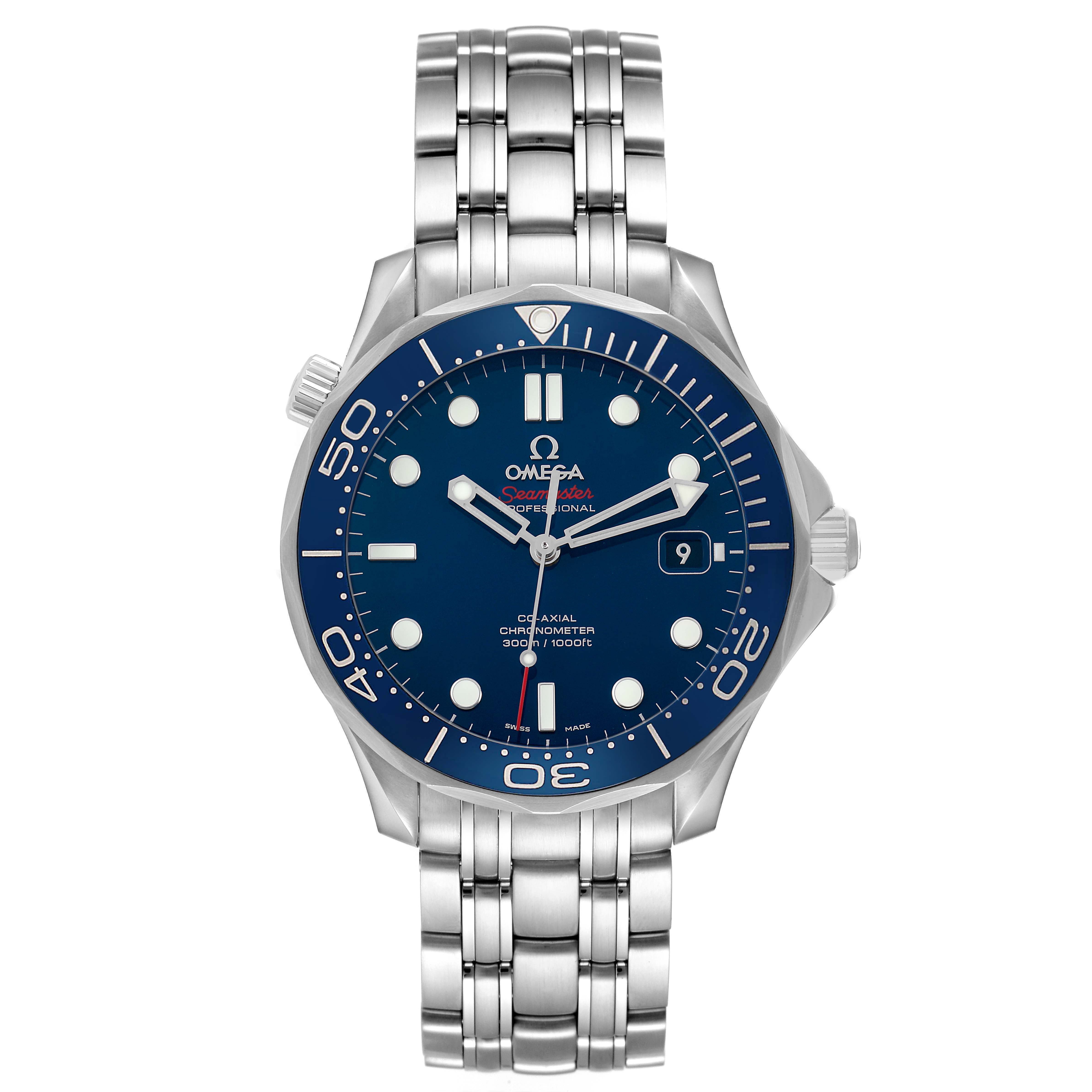 Omega Seamaster Diver 300M Steel Mens Watch 212.30.41.20.03.001 Box Cards. Automatic self-winding chronometer, Co-Axial Escapement movement with rhodium-plated finish. Stainless steel round case 41.0 mm in diameter. Helium escape valve at 10 o'clock. Pointed crown guards. Omega logo on the crown. Blue ceramic unidirectional time-lapse rotating bezel. Domed, scratch-resistant sapphire crystal with anti-reflective treatment on both sides. Blue dial with luminescent dot hour markers and skeletonized hands. Date window at 3 o'clock aperture. Luminescent lollipop-tipped seconds hand. Outer stick minute markers. Stainless steel bracelet with double push-button deployant clasp and diver's extension. Fits an 8 1/4" wrist.