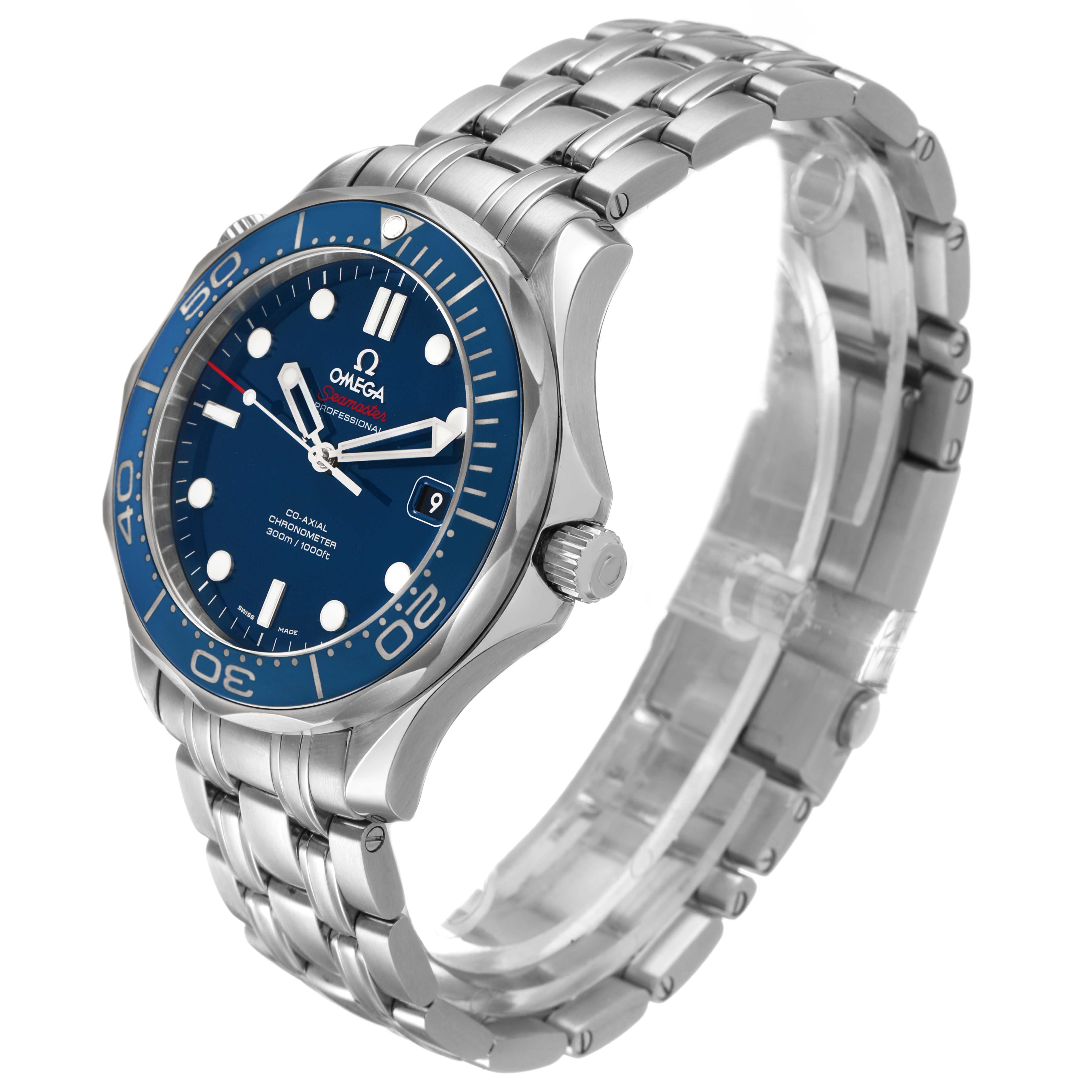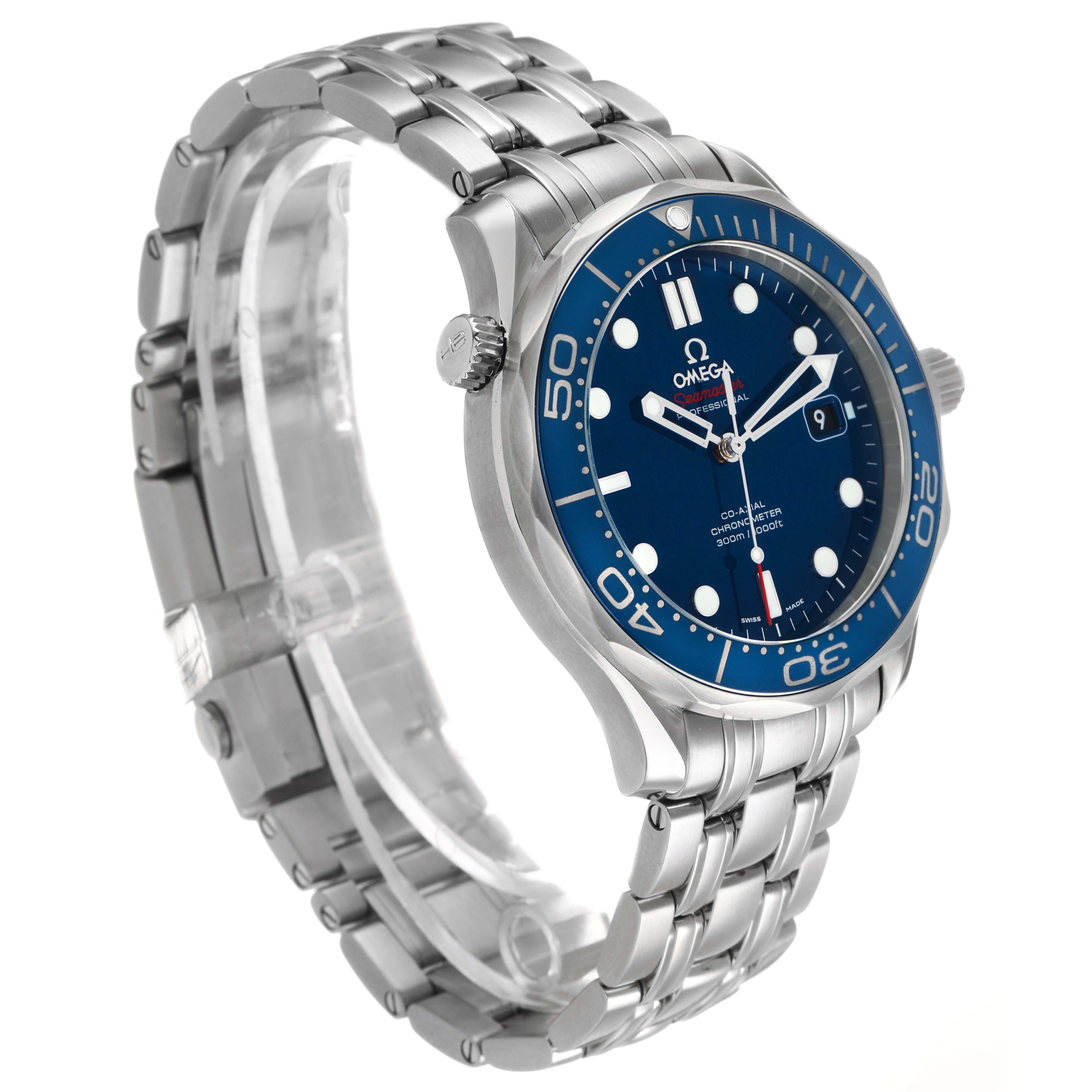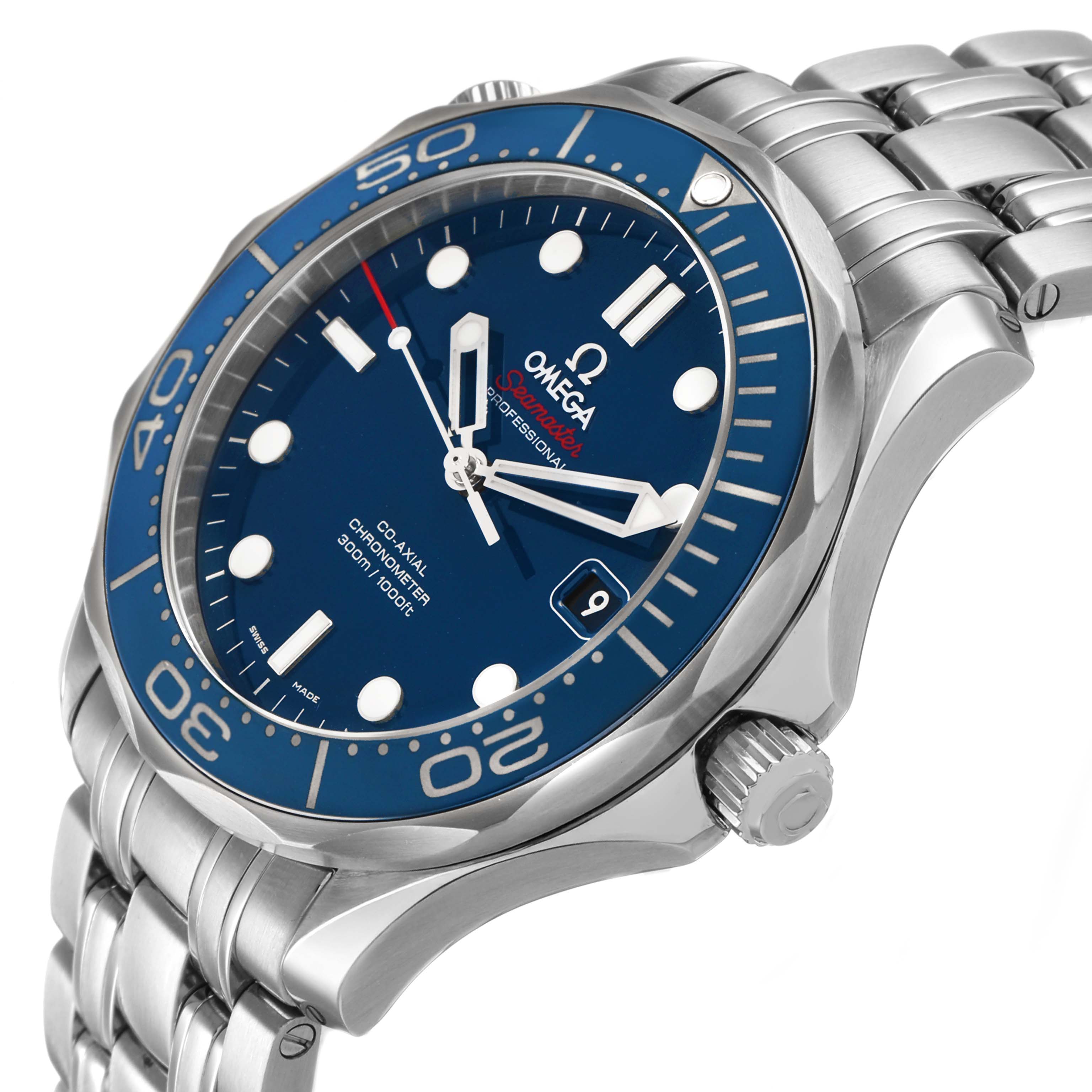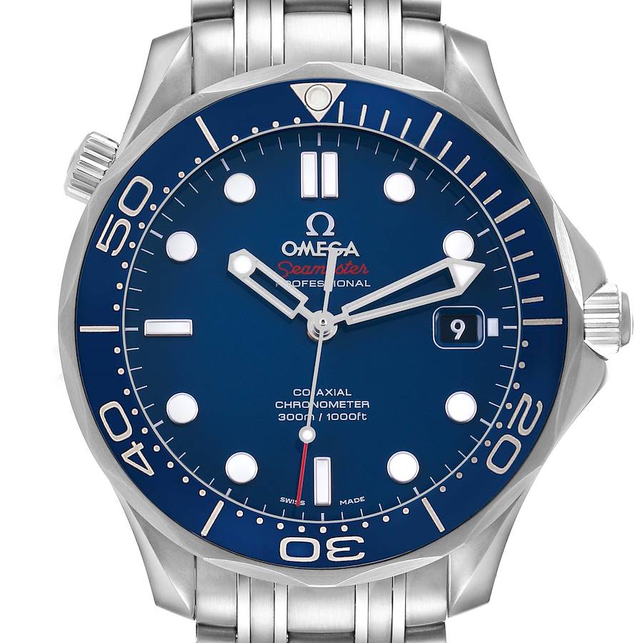 Omega Seamaster Diver 300M Steel Mens Watch 212.30.41.20.03.001 Box Card. Automatic self-winding chronometer, Co-Axial Escapement movement with rhodium-plated finish. Stainless steel round case 41.0 mm in diameter. Helium escape valve at 10 o'clock. Pointed crown guards. Omega logo on the crown. Blue ceramic unidirectional time-lapse rotating bezel. Domed, scratch-resistant sapphire crystal with anti-reflective treatment on both sides. Blue dial with luminescent dot hour markers and skeletonized hands. Date window at 3 o'clock aperture. Luminescent lollipop-tipped seconds hand. Outer stick minute markers. Stainless steel bracelet with double push-button deployant clasp and diver's extension. Fits an 8" wrist.