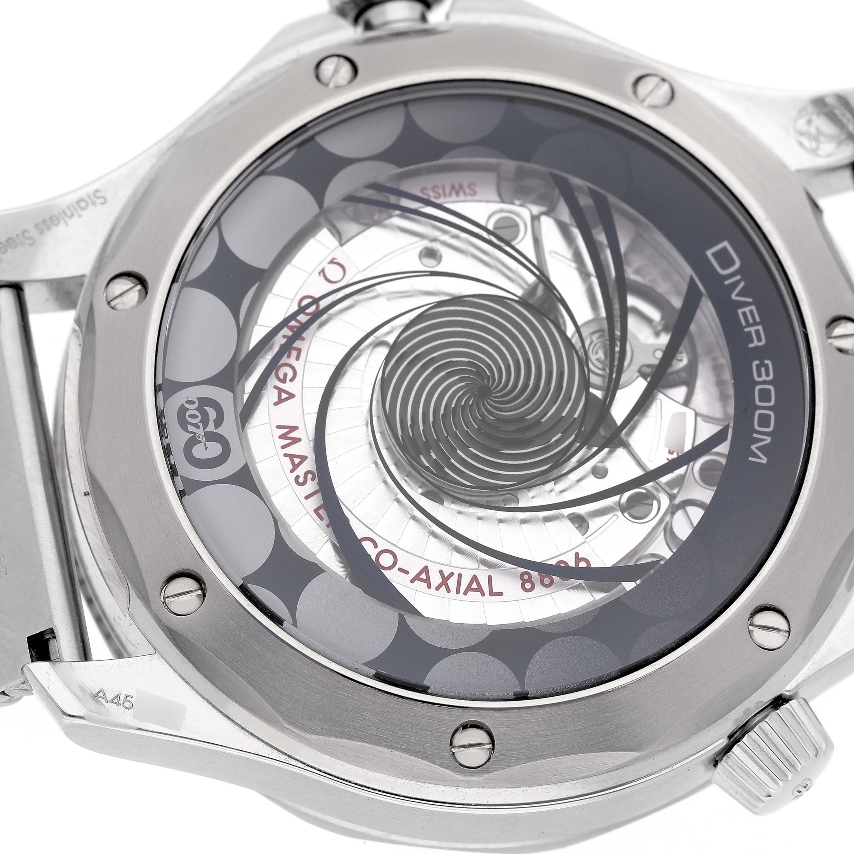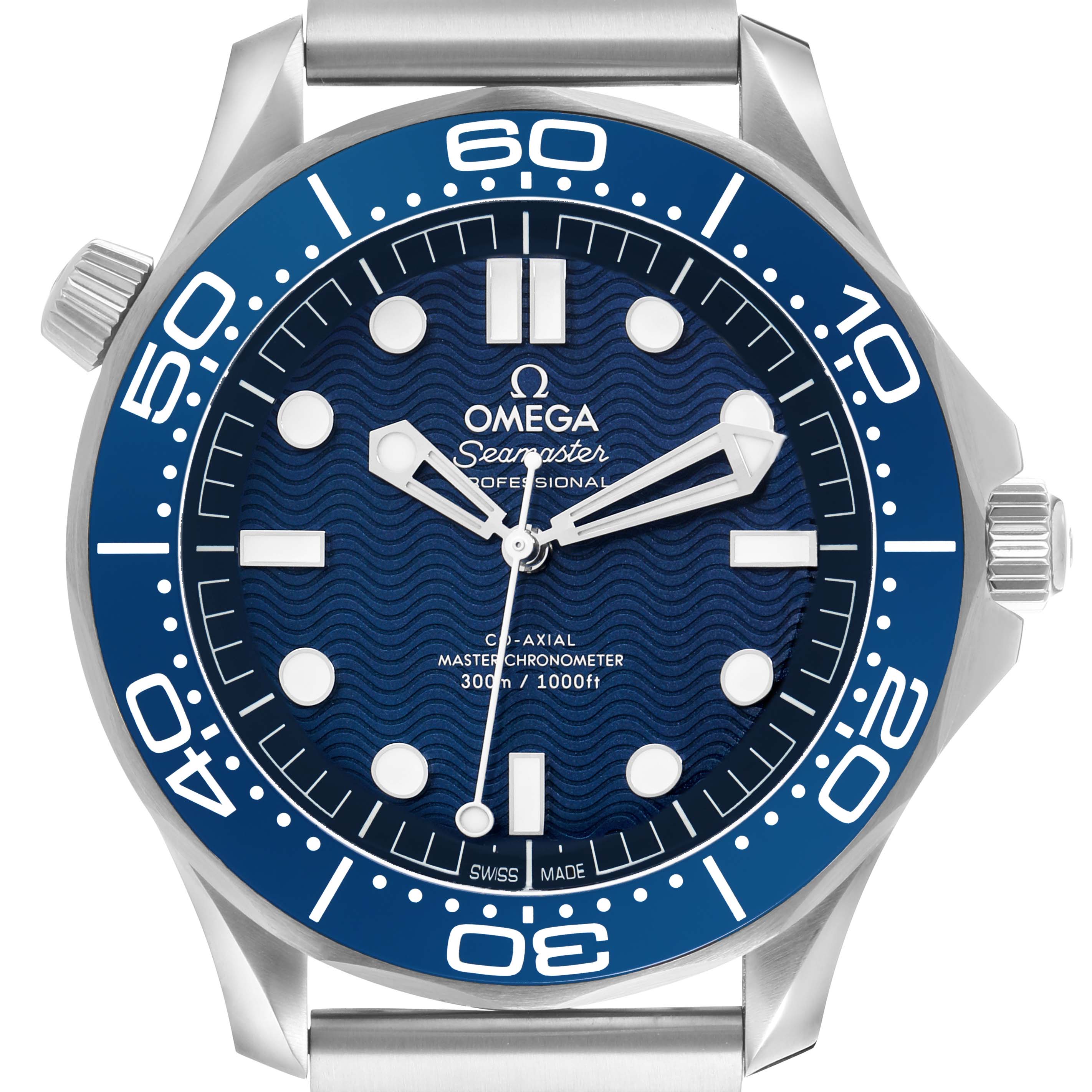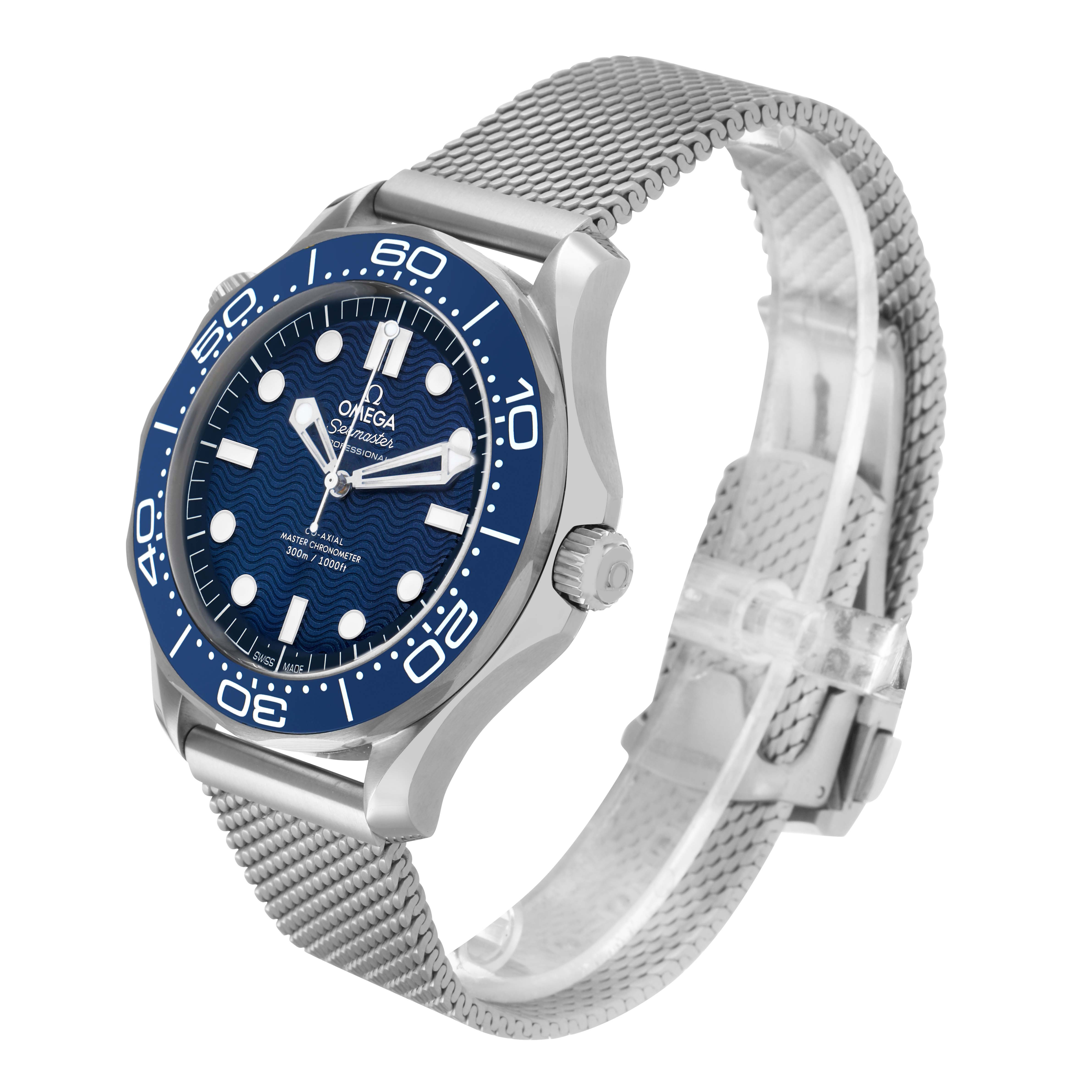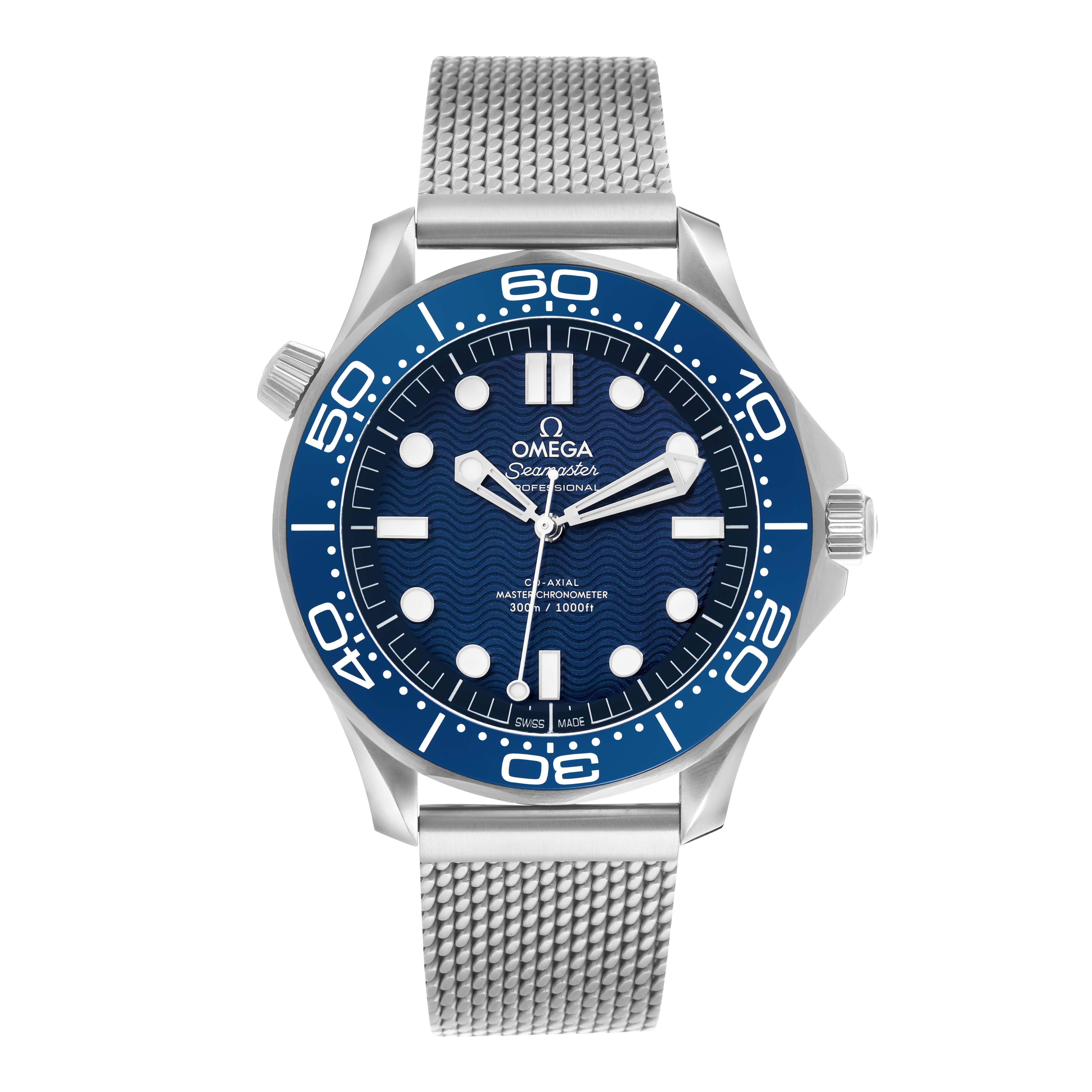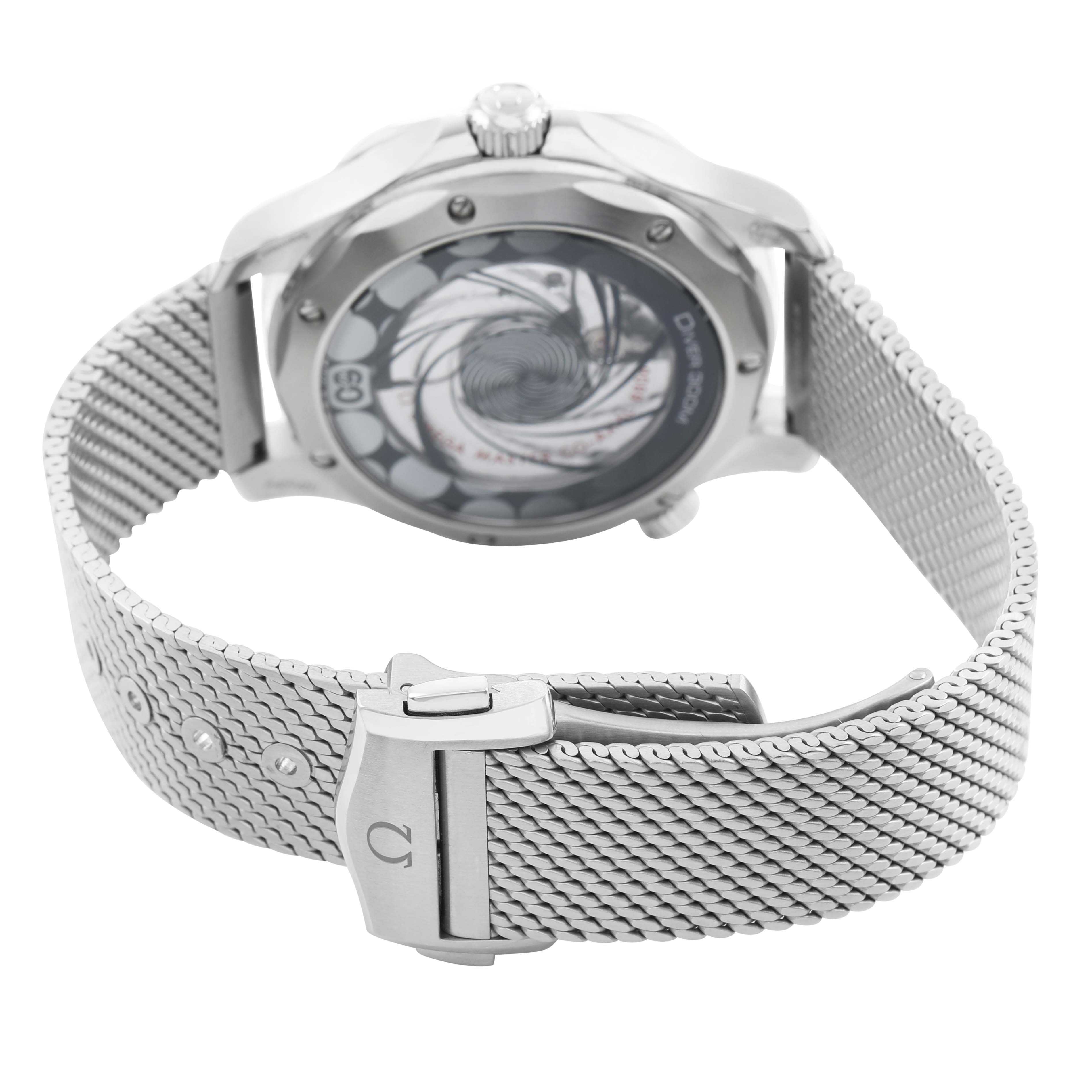 Omega Seamaster Diver James Bond Steel Mens Watch 210.30.42.20.03.002 Box Card. Automatic self-winding chronometer, Co-Axial Escapement movement. Stainless steel round case 42.0 mm in diameter. Helium escape valve at 10 o'clock. Omega logo on the crown. Transparent exhibition sapphire crystal case back. James Bond 60th anniversary emblem on the case back. Unidirectional rotating time-lapse bezel with luminescent 60-minute graduation. Scratch resistant sapphire crystal. Blue wave decor dial with luminescent skeleton hands and round and baton hour markers. White lollipop centre seconds hand. Stainless steel mesh bracelet with a double push-button deployany clasp.