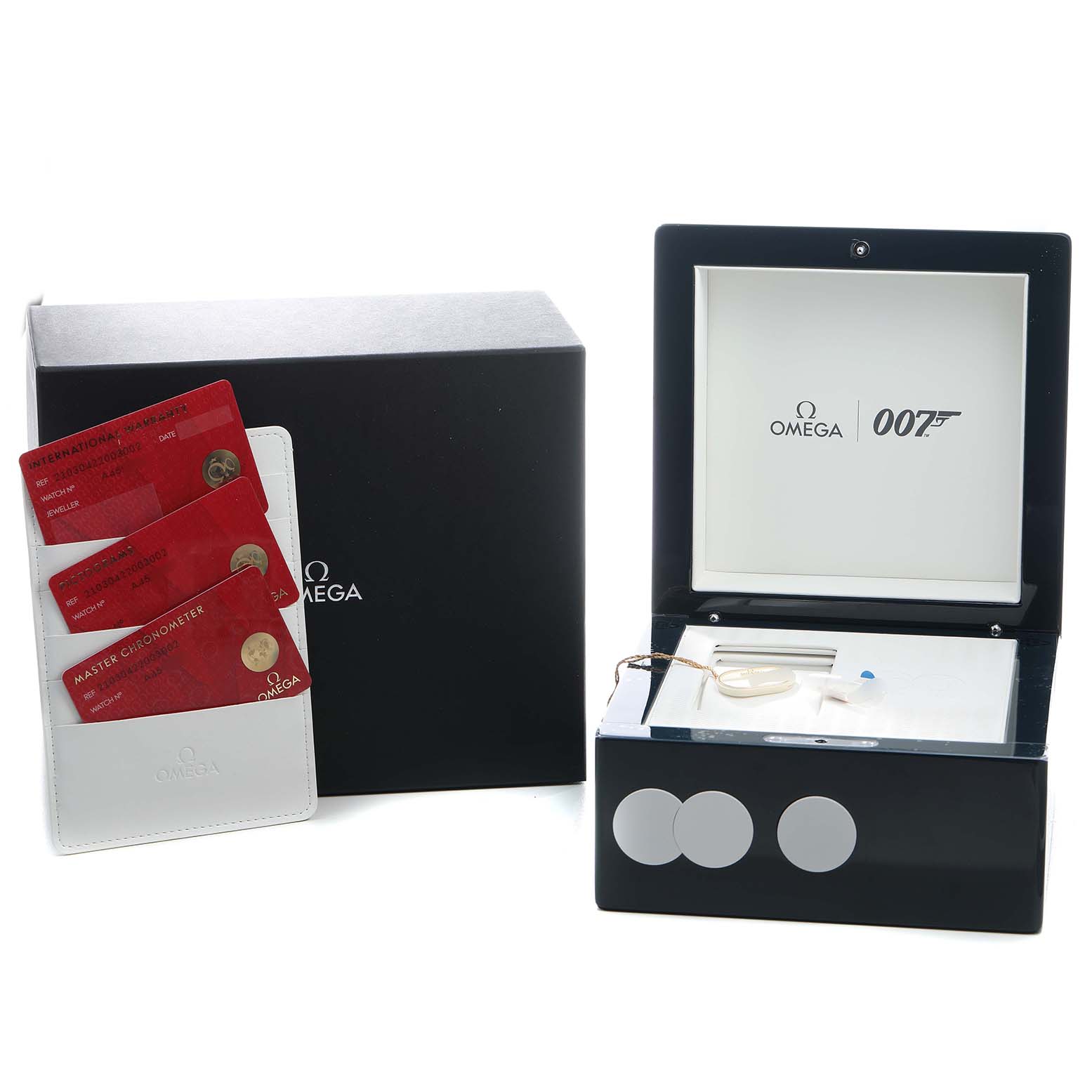 | Case: | Stainless steel round case 42.0 mm in diameter. Helium escape valve at 10 o'clock. Omega logo on the crown. Transparent exhibition sapphire crystal case back. James Bond 60th anniversary emblem on the case back. |