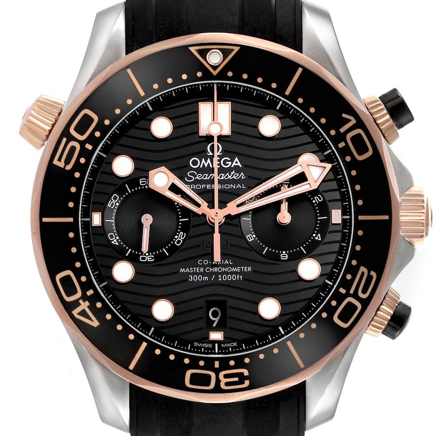 Omega Seamaster Diver Steel Rose Gold Mens Watch 210.22.44.51.01.001 Box Card. Automatic Self-winding chronograph movement with column wheel and Co-Axial escapement. Certified Master Chronometer,approved by METAS, resistant to magnetic fields reaching 15,000 gauss. Silicon balance-spring, 2 barrels mounted inseries, time zone function. Central hour, minute andchronograph seconds hands, small seconds hand, 12-hourand 60-minute recorders. Caliber 9900. Stainless steel and 18k rose Sedna gold case 44.0 mm in diameter. Omega logo on the crown. Helium escape valve at 10 o'clock. Polished black ceramic pushers operate the chronograph functions. Unidirectional rotating time-lapse 18k rose gold bezel with black ceramic fill and satin-finished Ceragold diving scale. Domed scratch-resistant sapphire crystal with anti-reflective coating. Black zirconium oxide ceramic dial with laser-engraved wave design. Rose gold luminescent skeleton hands and dot hour markers. Date window at 6 o'clock aperture. Outer minute and 1/4 second stick markers. Two chronograph subdials -- small seconds and 12 hours. Black rubber strap with stainless steel tang buckle.