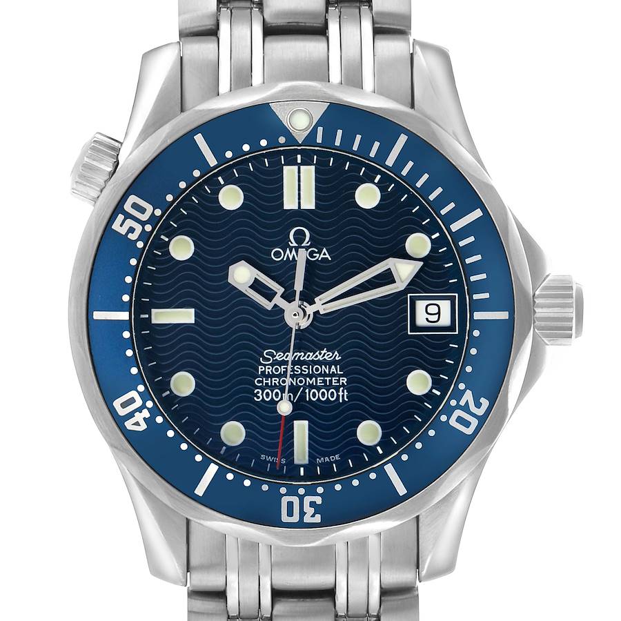 Omega Seamaster Midsize 36mm Blue Dial Steel Mens Watch 2551.80.00 Box Card. Automatic self-winding movement. Stainless steel round case 36.25 mm in diameter. Helium escape valve at 10 o'clock. Omega logo on the crown. Pointed crown guards. Stainless steel blue unidirectional rotating time-lapse diver's bezel. Scratch resistant sapphire crystal. Blue wave decor dial with luminescent skeletonized hands and dot hour markers. Luminescent lollipop-tipped center seconds hand. Date calendar at the 3 o'clock aperture. Outer stick minute markers. Stainless steel bracelet with a double push-button folding clasp with a diver's extension. Fits a 7.5" wrist.