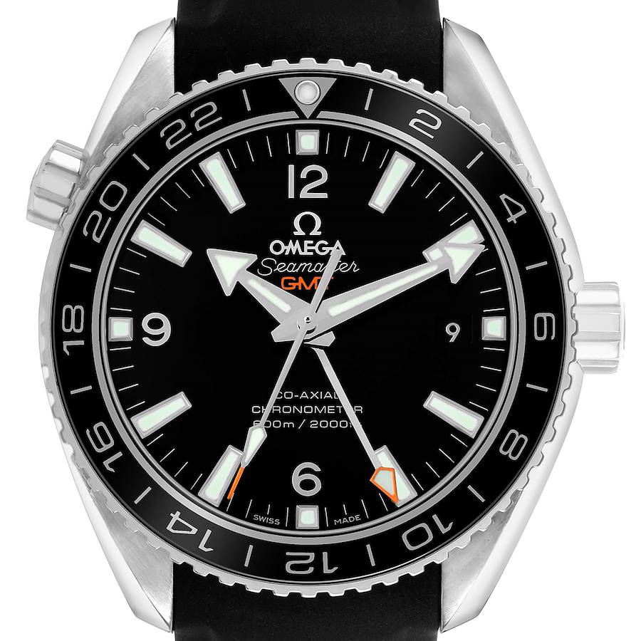 Omega Seamaster Planet Ocean 600M GMT Steel Mens Watch 232.32.44.22.01.001 Card. Automatic self-winding chronometer movement with Co-Axial Escapement for greater precision, stability, and durability. GMT with time zone function. Silicon balance-spring on free sprung-balance, 2 barrels mounted in series, automatic winding in both directions. Rhodium-plated balance bridge and oscillating mass. Stainless steel round case 43.5 mm in diameter. Helium Escapement Valve at the 10 o'clock position. Transparent exhibition sapphire crystal caseback. Omega logo on the crown. Bi-directional rotating stainless steel bezel with GMT markers on a black ceramic top ring. Domed scratch resistant sapphire crystal with anti-reflective treatment on both sides. Black dial with luminescent index hour markers and broad arrow hands. Silver Arabic numerals at 6, 9, and 12. Date calendar window at the 3 o'clock aperture. Luminescent arrow orange-tipped central sweeping seconds hand and an orange arrow-tipped GMT hand. Black rubber strap with stainless steel push-button deployant clasp.