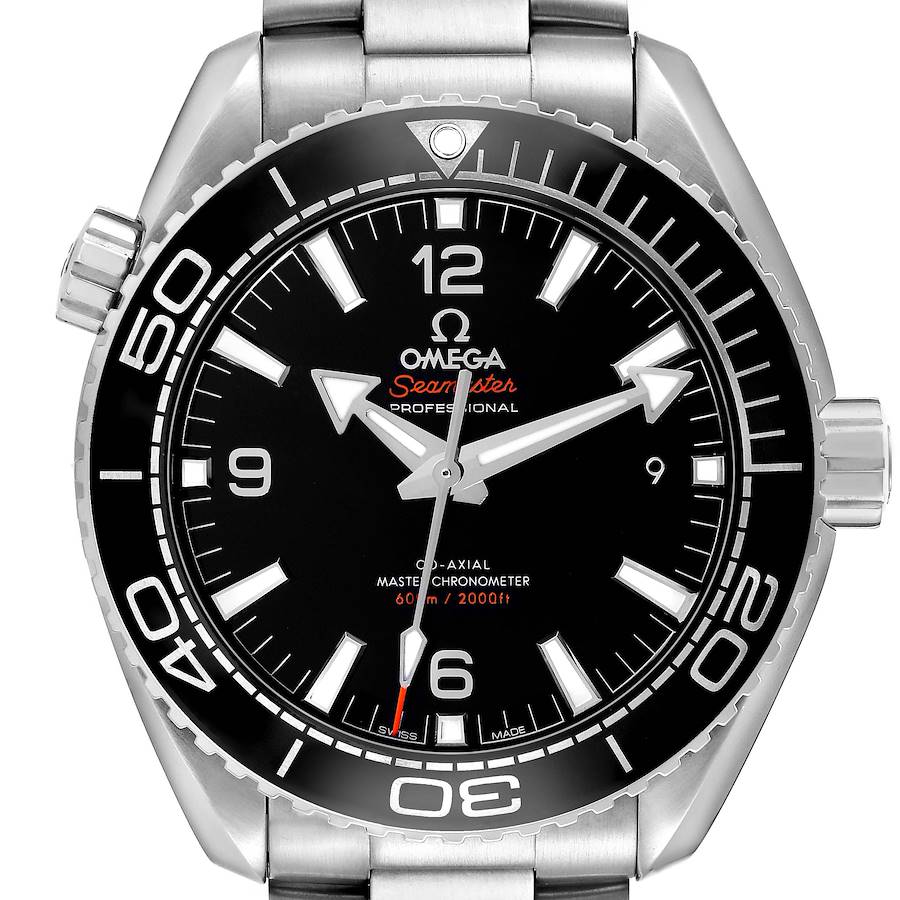 Omega Seamaster Planet Ocean 600M Steel Mens Watch 215.30.44.21.01.001 Cards. Automatic self-winding movement with Co-Axial escapement. Certified Master Chronometer, approved by METAS, resistant to magnetic fields reaching 15,000 gauss. Free sprung-balance with silicon balance spring, two barrels mounted in series, automatic winding in both directions. Time zone function. Special luxury finish with rhodium-plated rotor and bridges with Geneva waves in arabesque. Stainless steel round case 43.5 mm in diameter. Helium Escapement Valve at the 10 o'clock position. Transparent exhibition sapphire crystal caseback. Omega logo on the crown. Black ceramic unidirectional rotating bezel with Liquidmetal diving scale. Domed scratch-resistant sapphire crystal with anti-reflective treatment on both sides. Black ceramic dial with luminescent index hour markers and broad arrow hands. Silver Arabic numerals at 6, 9, and 12 o'clock. Date calendar at the 3 o'clock aperture. Stainless steel bracelet with a double push-button deployant clasp. Fits an 8 1/4" wrist.