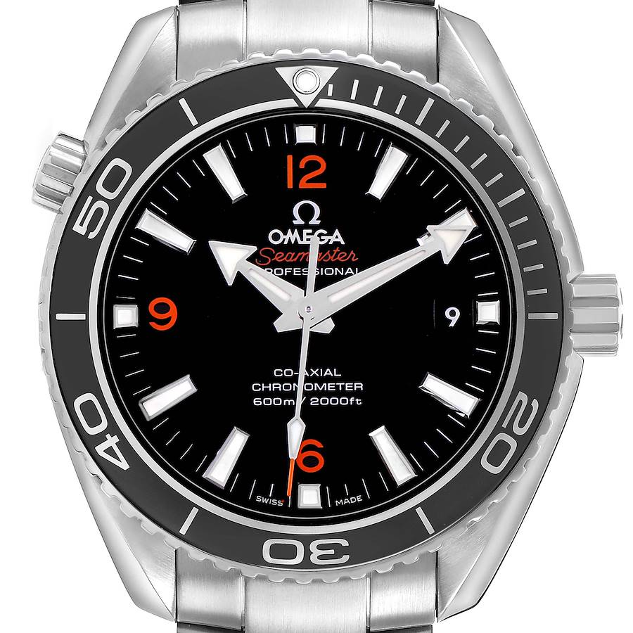 Omega Seamaster Planet Ocean 600M Steel Mens Watch 232.30.42.21.01.003 Cards. Automatic self-winding chronometer movement. 60 hour power reserve. Stainless steel round case 42.0 mm in diameter. Helium Escapement Valve at the 10 o'clock position. Black uni-directional rotating bezel. Domed scratch resistant sapphire crystal with anti-reflective coating. Black dial with luminescent index hour markers and broad arrow hands. Orange arabic numerals at 6,9 and 12. Date calendar window at 3 o'clock aperture. Stainless steel bracelet with push button deployant buckle. Fits a 7 3/4" wrist.