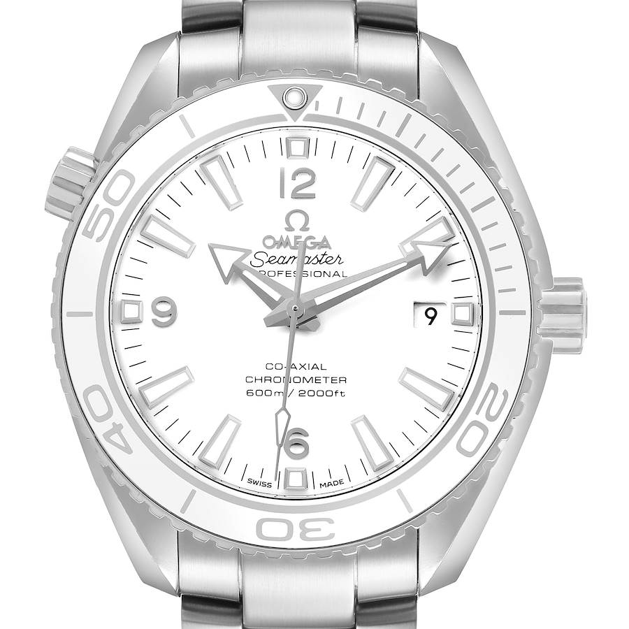 Omega Seamaster Planet Ocean 600M Steel Mens Watch 232.30.42.21.04.001 Card. Automatic self-winding movement with Co-Axial escapement. Certified Master Chronometer, approved by METAS, resistant to magnetic fields reaching 15,000 gauss. Freesprung-balance with silicon balance spring, two barrelsmounted in series, automatic winding in both directions. Stainless steel round case 42 mm in diameter. Helium Escapement Valve at the 10 o'clock position. Transparent exhibition sapphire crystal case back. White ceramic unidirectional rotating bezel with a diving scale filled with liquid ceramic and Super-LumiNova. Stainless steel round case 42 mm in diameter. Helium Escapement Valve at the 10 o'clock position. Transparent exhibition sapphire crystal case back. White dial with luminescent index hour markers and broad arrow hands. Arabic numeral at 6, 9, 12. Date calendar window at 3 o'clock aperture. Stainless steel bracelet with with patented extendable foldover clasp and diver extension. Fits 8 1/4" wrist.