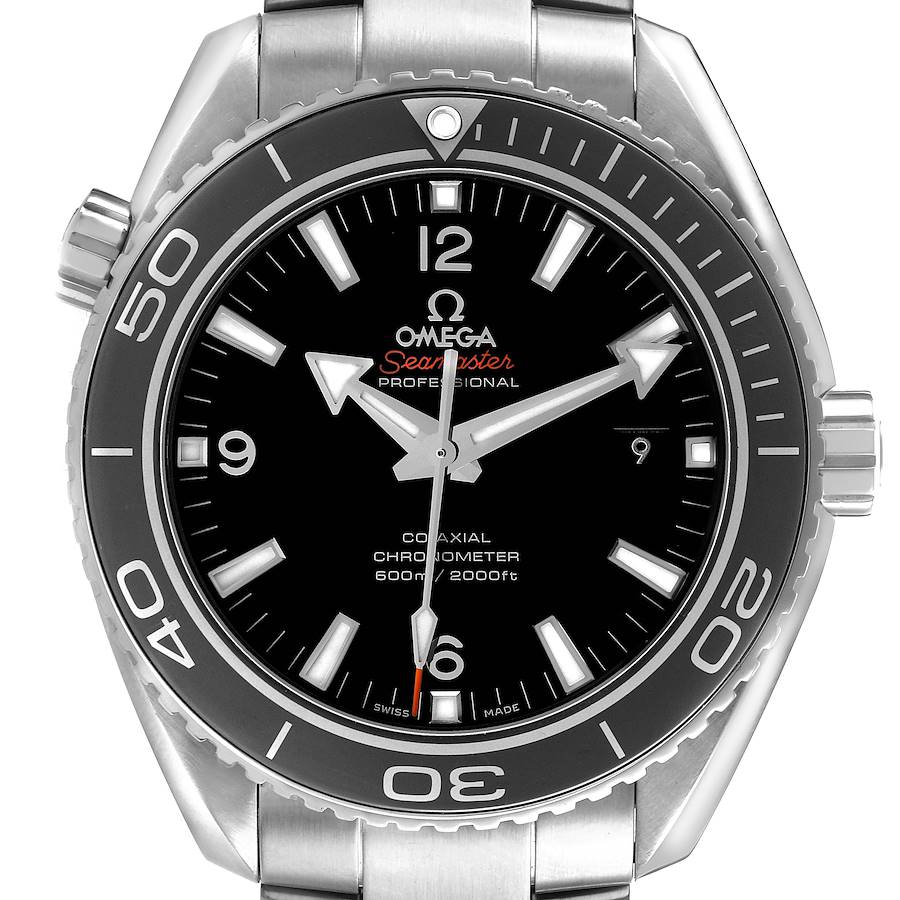 Omega Seamaster Planet Ocean 600M Steel Mens Watch 232.30.46.21.01.001 Card. Automatic self-winding chronograph movement with column wheel mechanism and Co-Axial Escapement for greater precision, stability and durability of the movement. Silicon balance-spring on free sprung-balance, 2 barrels mounted in series, automatic winding in both directions to reduce winding time. Rhodium plated finish with exclusive Geneva waves in arabesque. Stainless steel round case 45.5 mm in diameter. Helium escape valve at 10 o'clock. Transparent exhibition sapphire crystal case back. Omega logo on the crown. Black ceramic unidirectional rotating time-lapse bezel. Domed scratch resistant sapphire crystal with anti-reflective coating. Black dial with luminescent index hour markers and broad arrow hands. Raised Arabic numerals at 6, 9, and 12 o'clock. Date calendar at the 3 o'clock aperture. Stainless steel bracelet with a push-button folding clasp. Fits up to an 8" wrist.