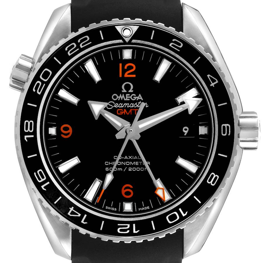 Omega Seamaster Planet Ocean GMT 600M Mens Watch 232.32.44.22.01.002 Card. Automatic self-winding chronometer movement with Co-Axial Escapement for greater precision, stability and durability. GMT with time zone function. Silicon balance-spring on free sprung-balance, 2 barrels mounted in series, automatic winding in both directions. Rhodium-plated balance bridge and oscillating mass. Stainless steel round case 43.5 mm in diameter. Helium Escapement Valve at the 10 o'clock position. Transparent exhibition sapphire crystal case back. Stainless steel round case 43.5 mm in diameter. Helium Escapement Valve at the 10 o'clock position. Transparent exhibition sapphire crystal case back. Domed scratch resistant sapphire crystal with anti-reflective coating. Black dial with luminescent index hour markers and broad arrow hands. Orange arabic numerals at 3,6,9 and 12. Date calendar window at 3 o'clock aperture. Black rubber strap with orange stitching and a stainless steel double push button deployant buckle.
