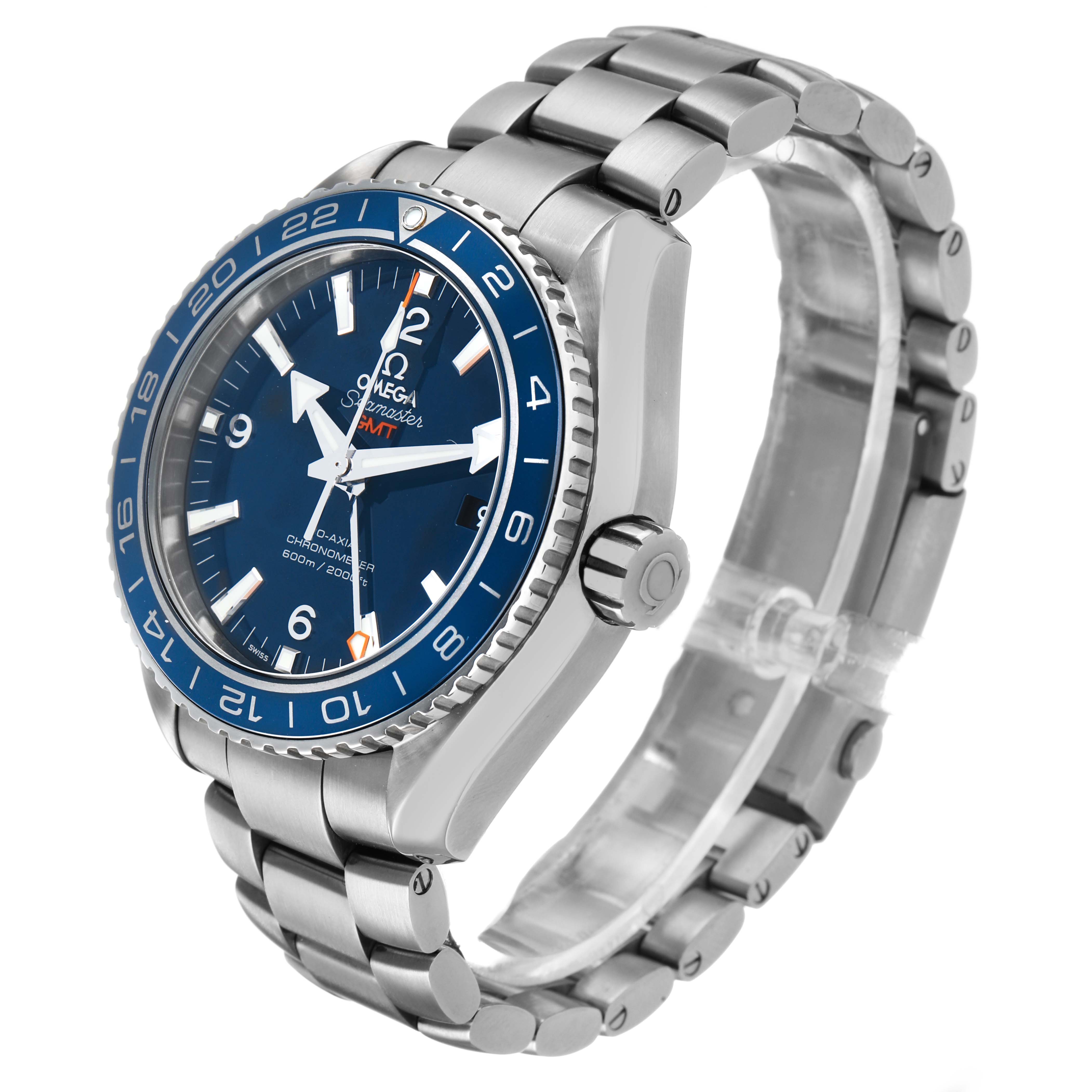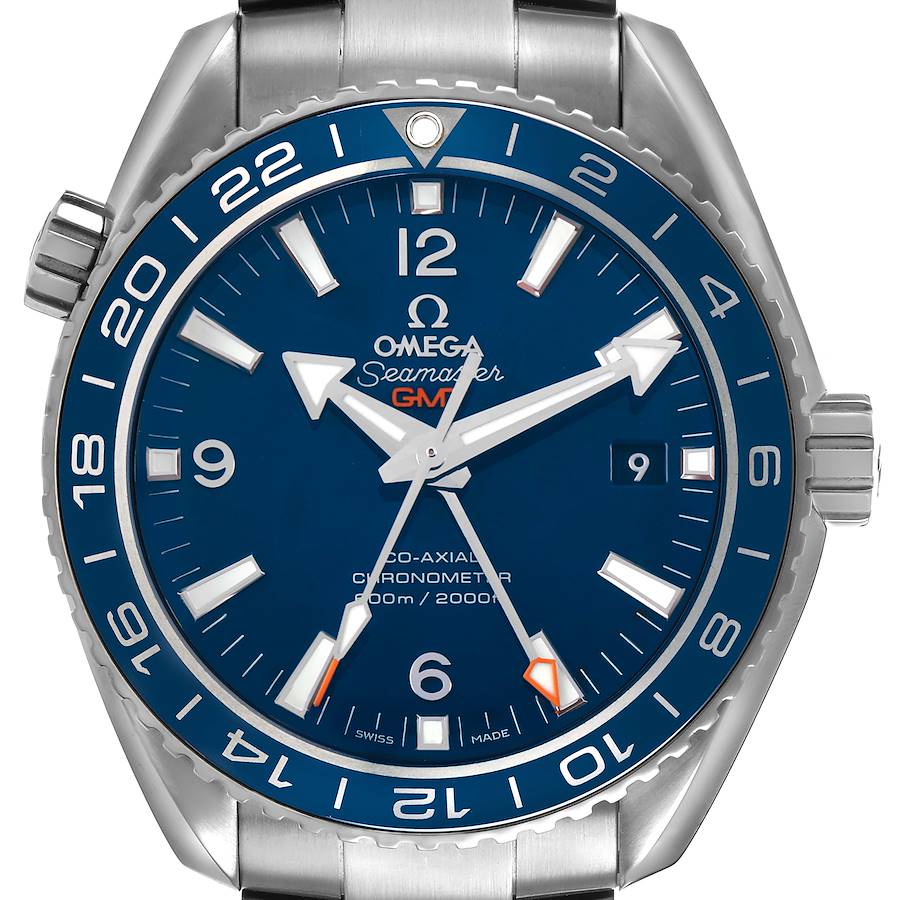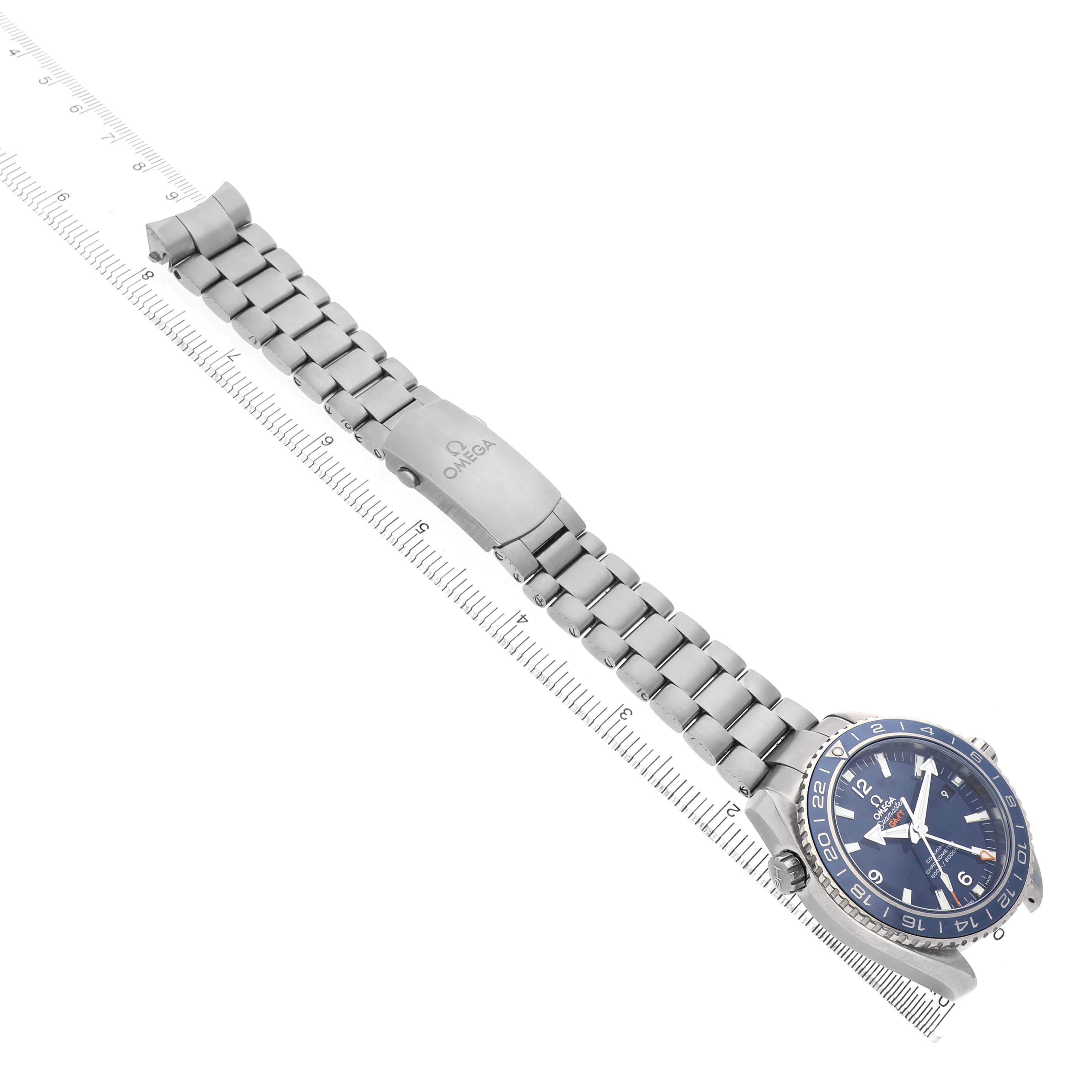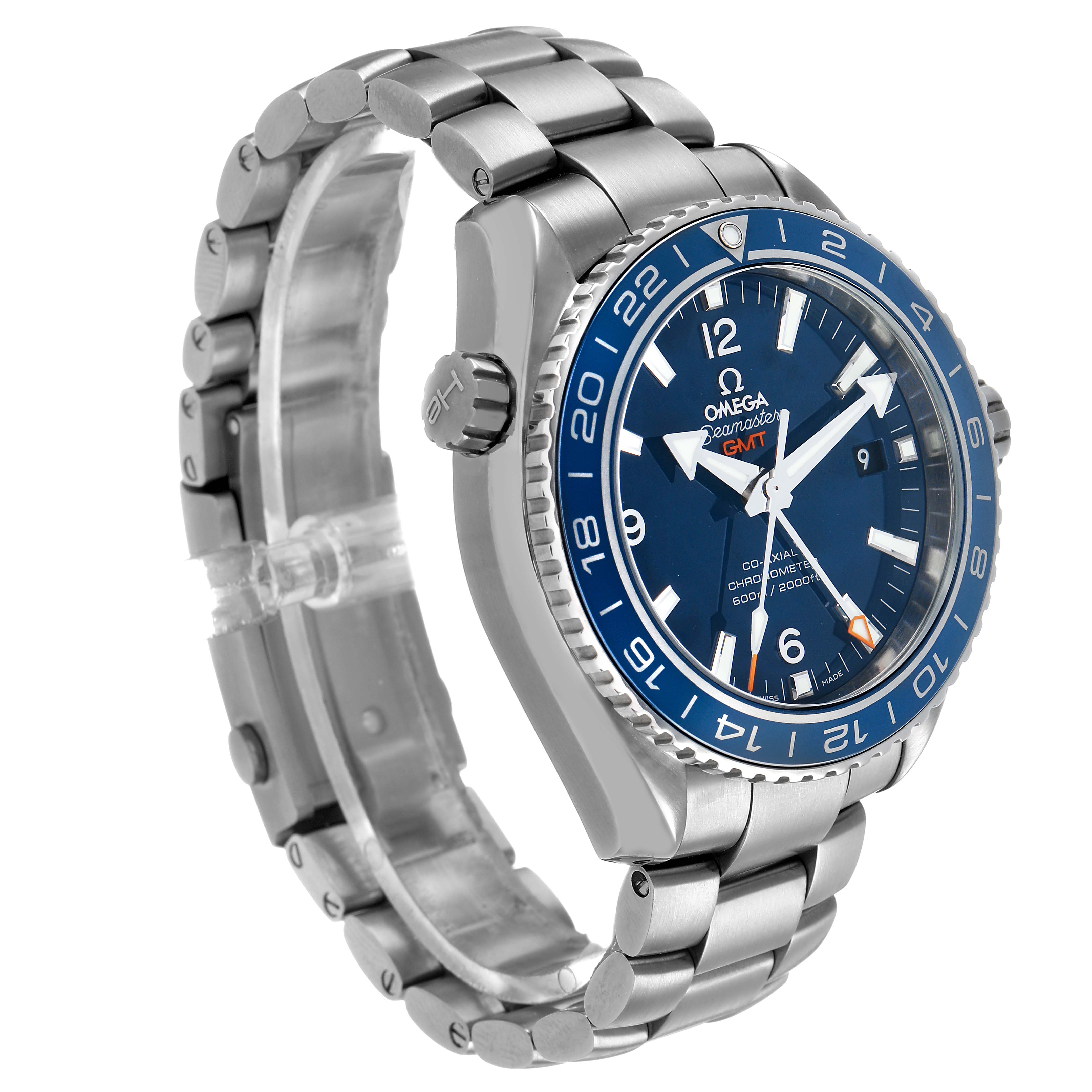 Omega Seamaster Planet Ocean GMT Titanium Watch 232.90.44.22.03.001 Box Card. Automatic self-winding chronometer movement with Co-Axial Escapement. Free sprung-balance, 2 barrels mounted in series, automatic winding in both directions to reduce winding time. Bridges and the oscillating mass are decorated with exclusive Geneva waves in arabesque. Titanium round case 43.5 mm in diameter. Helium Escapement Valve at the 10 o'clock position. Transparent exhibition sapphire crystal caseback. Blue ceramic uni-directional rotating bezel with Liquidmetal diving scale. Domed scratch resistant sapphire crystal with anti-reflective coating. Blue dial with luminescent index hour markers and broad arrow hands. Steel Arabic numerals at 6, 9, and 12. Date calendar window at 3 o'clock aperture. Titanium bracelet with deployant clasp. Fits a 7 3/4" wrist.