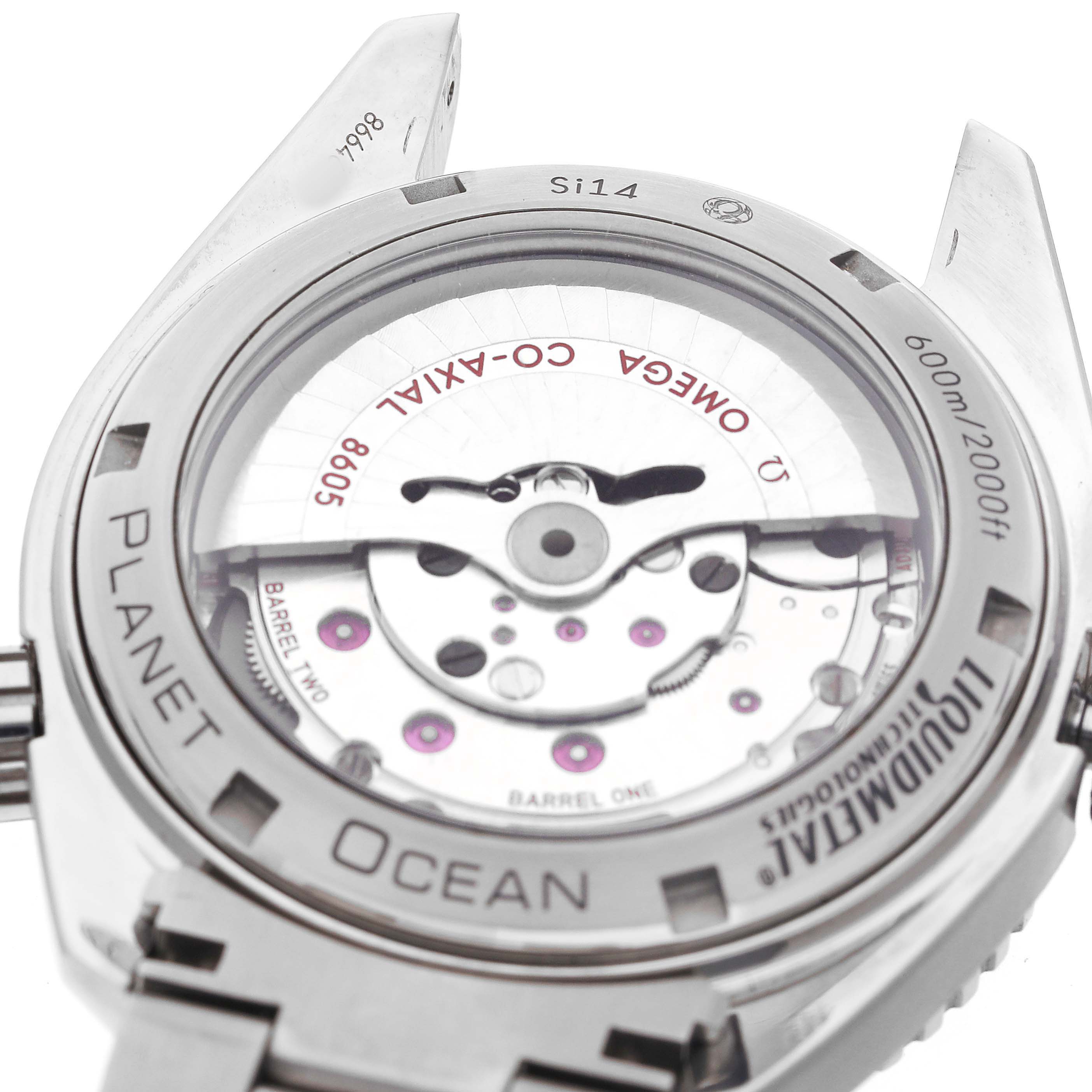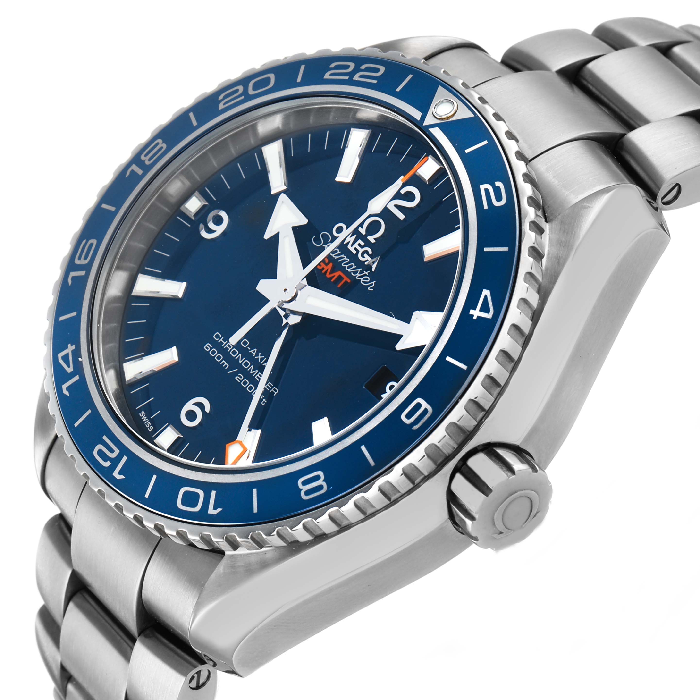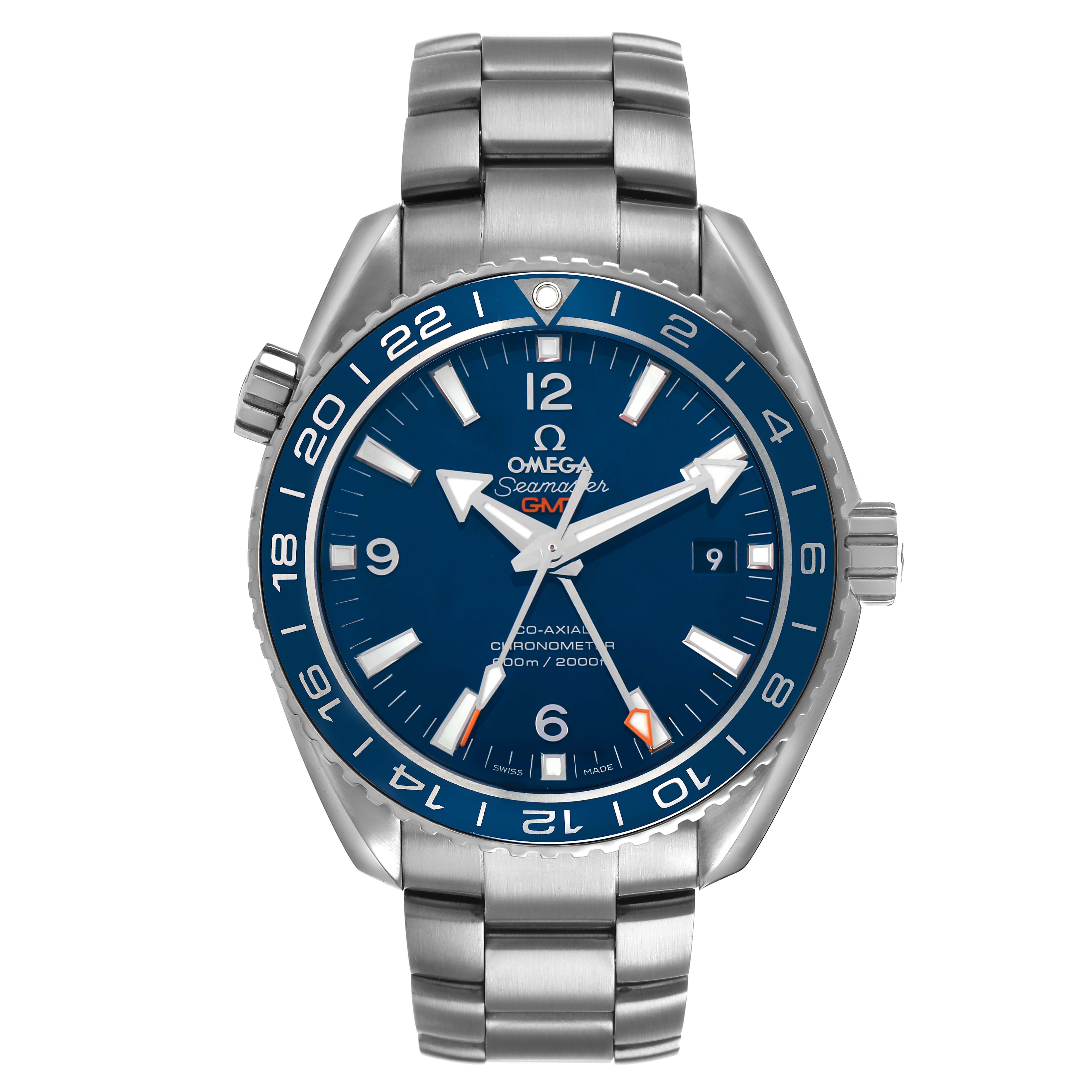 Omega Seamaster Planet Ocean GMT Titanium Watch 232.90.44.22.03.001 Box Card. Automatic self-winding chronometer movement with Co-Axial Escapement. Free sprung-balance, 2 barrels mounted in series, automatic winding in both directions to reduce winding time. Bridges and the oscillating mass are decorated with exclusive Geneva waves in arabesque. Titanium round case 43.5 mm in diameter. Helium Escapement Valve at the 10 o'clock position. Transparent exhibition sapphire crystal caseback. Blue ceramic uni-directional rotating bezel with Liquidmetal diving scale. Domed scratch resistant sapphire crystal with anti-reflective coating. Blue dial with luminescent index hour markers and broad arrow hands. Steel Arabic numerals at 6, 9, and 12. Date calendar window at 3 o'clock aperture. Titanium bracelet with deployant clasp. Fits a 7 3/4" wrist.