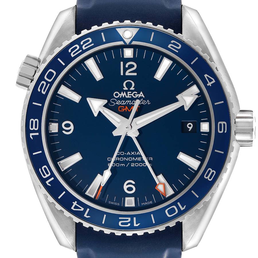 Omega Seamaster Planet Ocean Titanium Watch 232.92.44.22.03.001 Card. Automatic self-winding chronometer movement with Co-Axial Escapement for greater precision, stability and durability. GMT with time zone function. Silicon balance-spring on free sprung-balance, 2 barrels mounted in series, automatic winding in both directions. Rhodium-plated balance bridge and oscillating mass. Titanium round case 43.5 mm in diameter. Helium escape valve at the 10 o'clock position. Transparent exhibition sapphire crystal caseback. Omega logo on the crown. Bi-directional rotating divers' titanium bezel with a blue ceramic top ring with GMT markers. Domed, scratch resistant sapphire crystal with anti-reflective treatment on both sides. Blue dial with luminescent index hour markers and broad arrow hands. Orange arrow-tipped GMT hand. Silver Arabic numerals at 6, 9, and 12. Date calendar window at 3 o'clock aperture. Blue rubber strap with titanium push-button deployant clasp.