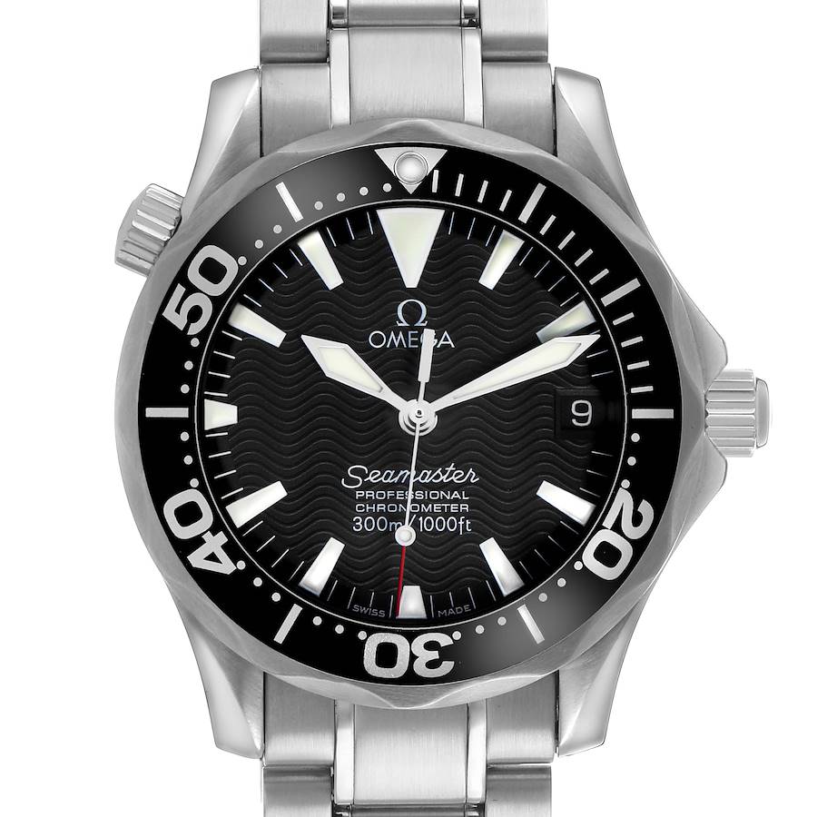 Omega Seamaster Steel Midsize Black Dial Mens Watch 2252.50.00. Officially certified automatic self-winding movement. Stainless steel round case 36.25 mm in diameter. Helium escape valve at the 10 o'clock position. Pointed crown guards. Omega logo on the crown. Black unidirectional rotating time-lapse bezel. Domed anti-reflective, scratch resistant sapphire crystal. Black wave decor dial with luminescent diamond-shaped hands and index hour markers. Luminescent lollipop orange-tipped centre seconds hand. Outer stick minute markers. Date calendar at the 3 o'clock aperture. Stainless steel bracelet with a double push-button folding clasp. Fits a 7 3/4" wrist.