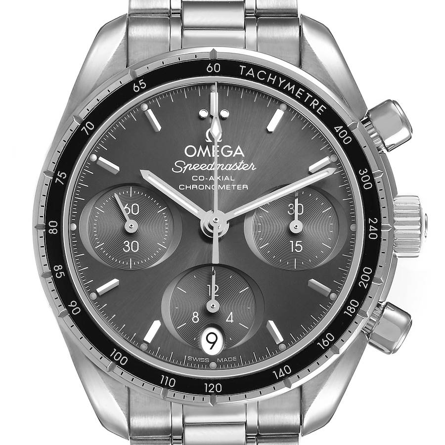 Omega Speedmaster 38 Grey Dial Steel Mens Watch 324.30.38.50.06.001 Box Card. Automatic self-winding Co-Axial chronograph movement. Stainless steel round case 38.0 mm in diameter. Seahorse medallion on the caseback. Stainless steel bezel with matte black tachymeter insert. Anti-reflective scratch resistant sapphire crystal. Grey sun-brushed dial with baton indexes and luminous hands. Three horizontal oval chronograph subdials to measure minutes, hours, and running seconds. Vertical oval date window at 6 o'clock aperture. Stainless steel bracelet with double deployant clasp. Fits a 7 1/4" wrist.